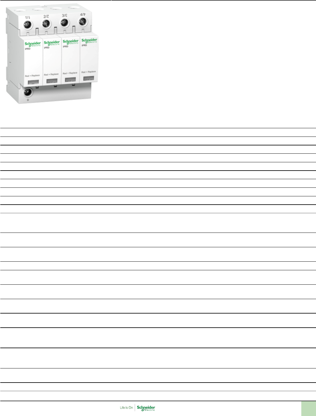 <p>Folha de dados do produto</p><p>Características</p><p>A9L20421</p><p>iPRD20r modular surge arrester - 4P - IT - 460V -</p><p>with remote transfert</p><p>Principal</p><p>Range of product Acti 9</p><p>Nome do produto Acti 9 iPRD</p><p>Tipo de produto ou componente Para-ráios com cartucho de encaixe</p><p>Nome abreviado do dispositivo IPRD</p><p>Aplicativo do dispositivo Distribuição</p><p>Descrição de polos 4P</p><p>Sinalização remota Com</p><p>Composição de contatos de sinal 1 SD (1 F/A)</p><p>Tipo de proteção contra sobretensão Rede de distribuição elétrica</p><p>Esquema de aterramento IT</p><p>Complementar</p><p>Tipo de classe de proteção contra</p><p>sobretensão</p><p>Tipo 2</p><p>Tecnologia de proteção contra</p><p>sobretensão</p><p>MOV</p><p>[Ue] tensão de operação nominal 230/400 V CA (+/- 10 %) a 50/60 Hz</p><p>[In] nominal discharge current Modo comum: 5 kA (L/PE)</p><p>Modo comum: 5 kA (N/PE)</p><p>[Imax] maximum discharge current Modo comum: 20 kA L/PE</p><p>Modo comum: 20 kA N/PE</p><p>[Uc] tensão máxima de operação</p><p>contínua</p><p>Modo comum: 460 V L/PE</p><p>Maximum [Up] voltage protection level Modo comum</p>