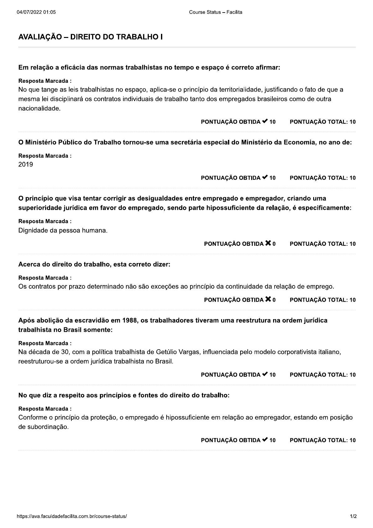 <p>04/07/2022 01:05 Course Status - Facilita AVALIAÇÃO - DIREITO DO TRABALHO Em relação a eficácia das normas trabalhistas no tempo e espaço é correto afirmar: Resposta Marcada : No que tange as leis trabalhistas no espaço, aplica-se o princípio da territorialidade, justificando o fato de que a mesma lei disciplinará os contratos individuais de trabalho tanto dos empregados brasileiros como de outra nacionalidade. PONTUAÇÃO OBTIDA 10 PONTUAÇÃO TOTAL: 10 o Ministério Público do Trabalho tornou-se uma secretária especial do Ministério da Economia, no ano de: Resposta Marcada : 2019 PONTUAÇÃO OBTIDA 10 PONTUAÇÃO TOTAL: 10 o princípio que visa tentar corrigir as desigualdades entre empregado e empregador, criando uma superioridade jurídica em favor do empregado, sendo parte hipossuficiente da relação, é especificamente: Resposta Marcada : Dignidade da pessoa humana. PONTUAÇÃO OBTIDA 0 PONTUAÇÃO TOTAL: 10 Acerca do direito do trabalho, esta correto dizer: Resposta Marcada : Os contratos por prazo determinado não são exceções ao princípio da continuidade da relação de emprego. PONTUAÇÃO OBTIDA 0 PONTUAÇÃO TOTAL: 10 Após abolição da escravidão em 1988, os trabalhadores tiveram uma reestrutura na ordem jurídica trabalhista no Brasil somente: Resposta Marcada : Na década de 30, com a política trabalhista de Getúlio Vargas, influenciada pelo modelo corporativista italiano, reestruturou-se a ordem jurídica trabalhista no Brasil. PONTUAÇÃO OBTIDA 10 PONTUAÇÃO TOTAL: 10 No que diz a respeito aos princípios e fontes do direito do trabalho: Resposta Marcada : Conforme o princípio da proteção, o empregado é hipossuficiente em relação ao empregador, estando em posição de subordinação. PONTUAÇÃO OBTIDA 10 PONTUAÇÃO TOTAL: 10 https://ava.faculdadefacilita.com.br/course-status/ 1/2</p><p>04/07/2022 01:05 Course Status - Facilita Considerando-se a doutrina, legislação e a jurisprudência, em relação aos princípios que norteiam o Direito do Trabalho: Resposta Marcada : O juiz do trabalho pode privilegiar a situação de fato, quando comprovada, em detrimento dos documentos ou do rótulo conferido ao direito material. PONTUAÇÃO OBTIDA 10 PONTUAÇÃO TOTAL: 10 Davi comprou uma empresa de Móveis, agora ele é empregador de 231 funcionários, assim, procurou você para uma consulta jurídica, interrogando, sobre quais poderes ele pode exercer dentro de sua nova empresa? Resposta Marcada : Poder de organização, controle e disciplina. PONTUAÇÃO OBTIDA 10 PONTUAÇÃO TOTAL: 10 A Justiça do Trabalho concilia e julga as ações judiciais entre trabalhadores e empregadores e outras controvérsias decorrentes da relação de trabalho, bem como as demandas que tenham origem no cumprimento de suas próprias sentenças, inclusive as coletivas. Os órgãos da Justiça do Trabalho são: Resposta Marcada : TRT e TST. PONTUAÇÃO OBTIDA 10 PONTUAÇÃO TOTAL: 10 Para a construção do conceito de Direito do Trabalho, os doutrinadores adotaram critérios distintos, quais sejam, critério subjetivista, objetivista e misto. Na nossa doutrina majoritária, qual critério vem sendo adotado no Brasil? Resposta Marcada : Misto ou complexo. PONTUAÇÃO OBTIDA 10 PONTUAÇÃO TOTAL: 10 Total 80 / 100 https://ava.faculdadefacilita.com.br/course-status 2/2</p>