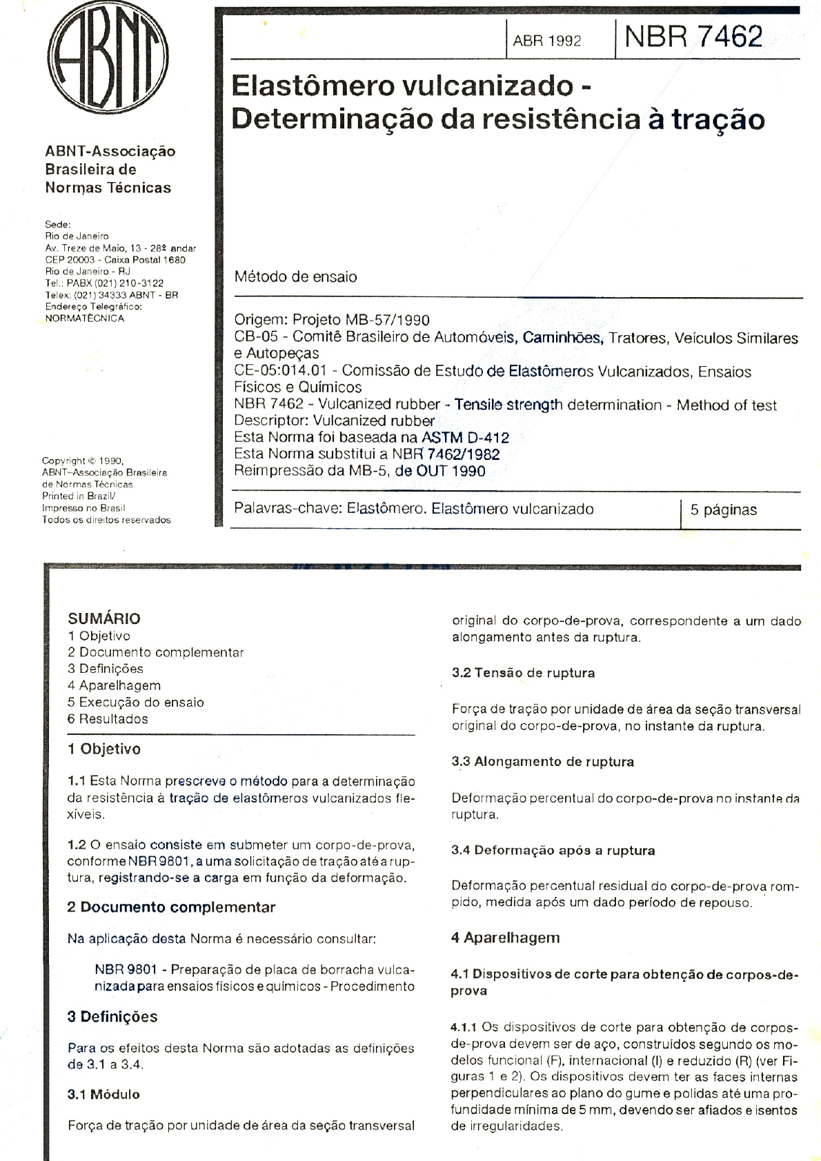 <p>ABR 1992 NBR 7462 Elastômero vulcanizado - Determinação da resistência à tração ABNT-Associação Brasileira de Normas Técnicas Sede: Rio de Janeiro Av. Treze de Maio, 13 andar CEP 20003 Caixa Postal 1680 Rio de Janeiro RJ Método de ensaio Tel.: PABX(021)210-3122 Telex: BR Endereço Telegráfico: Origem: Projeto MB-57/1990 CB-05 Comitê Brasileiro de Automóveis, Caminhões, Tratores, Veículos Similares e Autopeças CE-05:014.01 Comissão de Estudo de Elastômeros Vulcanizados, Ensaios Físicos e Químicos NBR 7462 Vulcanized rubber Tensile strength determination Method of test Descriptor: Vulcanized rubber Esta Norma foi baseada na ASTM D-412 Esta Norma substitui a NBR 7462/1982 Copyright 1990, ABNT-Associação Brasileira Reimpressão da MB-5, de OUT 1990 de Normas Técnicas Printed in Brazil/ Impresso no Brasil Palavras-chave: Elastômero. Elastômero vulcanizado 5 páginas Todos os direitos reservados SUMÁRIO original do corpo-de-prova, correspondente a um dado 1 Objetivo alongamento antes da ruptura 2 Documento complementar 3 Definições 3.2 Tensão de ruptura 4 Aparelhagem 5 Execução do Força de tração por unidade de área da seção transversal 6 Resultados original do corpo-de-prova, no instante da ruptura. 1 Objetivo 3.3 Alongamento de ruptura 1.1 Esta Norma prescreve método para a determinação da resistência à tração de elastômeros vulcanizados fle- Deformação percentual do corpo-de-prova no instante da xíveis. 1.2 ensaio consiste em submeter um corpo-de-prova, 3.4 Deformação após a ruptura conforme NBR 9801, a uma solicitação de tração até a rup- tura, registrando-se a carga em função da deformação. Deformação percentual residual do corpo-de-prova rom- 2 Documento complementar pido, medida após um dado período de repouso. Na aplicação desta Norma é necessário consultar: 4 Aparelhagem NBR 9801 Preparação de placa de borracha vulca- 4.1 Dispositivos de corte para obtenção de corpos-de- nizada para físicos e químicos Procedimento prova 3 Definições 4.1.1 Os dispositivos de corte para obtenção de corpos- Para os efeitos desta Norma são adotadas as definições de-prova devem ser de aço, construídos segundo os mo- de 3.1 a 3.4. delos funcional (F), internacional (I) e reduzido (R) (ver Fi- guras 1 e 2). Os dispositivos devem ter as faces internas 3.1 Módulo perpendiculares ao plano do gume e polidas até uma pro- fundidade mínima de 5 mm, devendo ser afiados e isentos Força de tração por unidade de área da seção transversal de irregularidades.</p><p>4 A 4 Seção AA A 110 100 12 15° Detalhe do gume em corte Unid.: mm Figura - Dispositivo de corte modelo F</p><p>4.1.2 A largura média do dispositivo de corte na sua porção de laminação assinalado na placa. Os cortes dos corpos- central é determinada a partir de três medidas de largura de-prova devem ser obtidos por um único golpe aplicado entre as arestas cortantes dos gumes, e sobre dispositivo de corte, devendo a placa de borracha efetuadas no centro e nas extremidades da porção paralela ser lubrificada com água e estar apoiada sobre uma su- central, por meio de instrumento adequado, com aproxi- perfície plana com camada intermediária de papelão que mação de 0,01 mm, sendo de + 1% afastamento máximo não danifique o gume do dispositivo de corte. de qualquer valor em relação à média. Nota: corpo-de-prova funcional (F), em virtude de não apresen- tar ruptura constantemente localizada, determina valores 4.2 Marcador de tensão de ruptura e alongamento de ruptura mais altos do que aqueles provenientes do corpo-de-prova interna- marcador metálico apropriado para modelo de corpo- cional e reduzido (R). Em composição de borracha na- de-prova utilizado deve ter dois gumes paralelos e lisos, tural tipo goma-pura, a tensão de ruptura do corpo-de- com largura e distância entre si que imprimam no corpo de prova F é cerca de 20% superior à do corpo-de-prova prova duasmarcas paralelas de largura máxima de 0,5 mm e distanciadas de centro a centro, respectivamente, para 5.1.2 Os corpos-de-prova devem ser marcados na sua os modelos F e I, de (10,0 + 0,2) mm e (25,0 + 0,5) mm. porção paralela central, por meio do respectivo marcador metálico, com dois traços paralelos e normais ao seu eixo Nota: Se for acoplado um automático ao corpo-de- longitudinal. A marcação utilizada não deve afetar cor- prova, este não necessita ser marcado. po-de-prova. 4.3 Micrômetro 5.1.3 Considera-se a largura média do dispositivo de corte, definida em como a largura do corpo-de-prova. Deve ter mostrador graduado em 0,01 mm e apalpador ca- paz de aplicar pressão de 0,20 MPa a MPa de base 5.1.4 Considera-se a média de três medições efetuadas, circular, com diâmetro que permita o completo assenta- seção central e as outras nas extremidades da por- mento sobre corpo-de-prova no local de medida. Deve ção central, como a espessura do corpo-de-prova. ter também uma plataforma de apoio do apalpador de di- mensão tal que permita assentamento central do corpo- 5.1.4.1 As medições individuais devem ser efetuadas com de-prova. aproximação de 0,01 mm e não devem ser afastadas mais que + 1% da média. 4.4 Máquina de ensaio 5.2 Temperatura de ensaio 4.4.1 Amáquina de ensaio deve ser provida de dinamômetro de força capaz de indicar ou registrar a carga com A temperatura de ensaio deve estar entre (23 sendo exatidão de + que os corpos-de-prova devem ser precondicionados du- rante mínimo de 3 h nesse ambiente. Sempre que a tem- 4.4.2 As garras da máquina devem exercer pressão unifor- peratura do ambiente de ensaio não estiver compreendida memente distribuída sobre toda a largura do corpo-de- nesta faixa, deve-se fazer constar, com os resultados, a prova, de modo que deva aumentar com a carga de tração, temperatura correspondente. impedindo qualquer deslizamento. As garras não devem provocar a ruptura dos corpos-de-prova na região de fixa- 5.3 Ensai