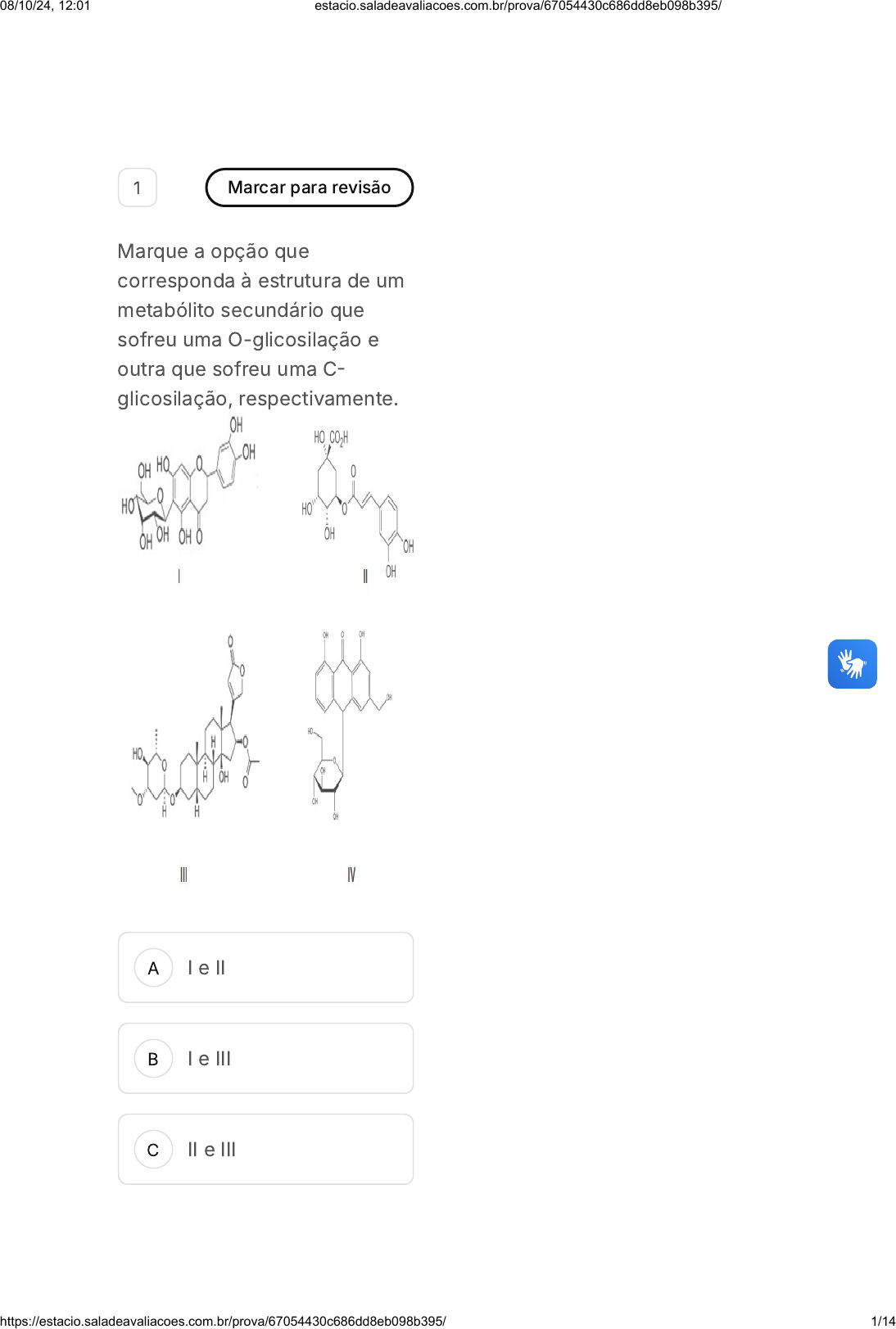 <p>A</p><p>B</p><p>C</p><p>1 Marcar para revisão</p><p>Marque a opção que</p><p>corresponda à estrutura de um</p><p>metabólito secundário que</p><p>sofreu uma O-glicosilação e</p><p>outra que sofreu uma C�</p><p>glicosilação, respectivamente.</p><p>I e II</p><p>I e III</p><p>II e III</p><p>08/10/24, 12:01 estacio.saladeavaliacoes.com.br/prova/67054430c686dd8eb098b395/</p><p>https://estacio.saladeavaliacoes.com.br/prova/67054430c686dd8eb098b395/ 1/14</p><p>D</p><p>E</p><p>A</p><p>B</p><p>C</p><p>D</p><p>E</p><p>I e IV</p><p>III e IV</p><p>2 Marcar para revisão</p><p>Marque a opção que contenha</p><p>apenas metabólitos de via</p><p>mista.</p><p>Fenilpropanoides e</p><p>flavonoides</p><p>Fenilpropanoides e</p><p>alcaloides</p><p>Flavonoides e</p><p>alcaloides</p><p>Fenilpropanoides e</p><p>clorofilas</p><p>Clorofilas e</p><p>flavonoides</p><p>3 Marcar para revisão</p><p>Muitos dos metabólitos</p><p>secundários ocorrem na</p><p>natureza na forma de</p><p>glicosídeos ou gliconas. Dessa</p><p>08/10/24, 12:01 estacio.saladeavaliacoes.com.br/prova/67054430c686dd8eb098b395/</p><p>https://estacio.saladeavaliacoes.com.br/prova/67054430c686dd8eb098b395/ 2/14</p><p>A</p><p>B</p><p>C</p><p>D</p><p>E</p><p>maneira, analise as estruturas a</p><p>seguir e indique qual delas</p><p>sofreu uma O-glicosilação.</p><p>I, II e IV</p><p>I, II e III</p><p>II, III e IV</p><p>I, III e IV</p><p>II e IV</p><p>4 Marcar para revisão</p><p>Marque a alternativa que</p><p>represente a espécie cuja</p><p>droga é indicada para uso</p><p>interno em constipação crônica</p><p>e que os principais ensaios</p><p>00</p><p>hora</p><p>: 29</p><p>min</p><p>: 11</p><p>seg</p><p>Ocultar</p><p>Questão 4 de 10</p><p>Respondidas �10� Em branco �0�</p><p>Finalizar prova</p><p>1 2 3 4 5</p><p>6 7 8 9 10</p><p>SM1 Farmacognosia</p><p>08/10/24, 12:01 estacio.saladeavaliacoes.com.br/prova/67054430c686dd8eb098b395/</p><p>https://estacio.saladeavaliacoes.com.br/prova/67054430c686dd8eb098b395/ 3/14</p><p>A</p><p>B</p><p>C</p><p>D</p><p>E</p><p>A</p><p>B</p><p>clínicos avaliam efeito</p><p>anticarcinogênico, redução do</p><p>risco de aterosclerose</p><p>associado à hiperlipidemia e a</p><p>propriedades nutricionais.</p><p>Malva sylvestris L.</p><p>Linum usitatissimum</p><p>L.</p><p>Plantago ovata Forssk</p><p>Streptomyces griseus</p><p>Micromonospora</p><p>purpurea</p><p>5 Marcar para revisão</p><p>Qual dos grupos de fármacos a</p><p>seguir ainda possui as plantas</p><p>como principal fonte de</p><p>obtenção:</p><p>Antivirais inibidores</p><p>de protease, como</p><p>Saquinavir e Ritonavir.</p><p>Anticancerígenos</p><p>inibidores mitóticos,</p><p>como Paclitaxel e</p><p>Vinblastina.</p><p>08/10/24, 12:01 estacio.saladeavaliacoes.com.br/prova/67054430c686dd8eb098b395/</p><p>https://estacio.saladeavaliacoes.com.br/prova/67054430c686dd8eb098b395/ 4/14</p><p>C</p><p>D</p><p>E</p><p>Antidepressivos</p><p>tricíclicos, como</p><p>Amitriptilina e</p><p>Clomipramina.</p><p>Analgésicos e</p><p>antipiréticos, como</p><p>Aspirina e Acetanilida.</p><p>Cardenolídeos</p><p>digitálicos, como o</p><p>Lanatosídeo C e a</p><p>Digoxina.</p><p>6 Marcar para revisão</p><p>De acordo com os eventos</p><p>químicos que ocorrem no Ciclo</p><p>de Calvin, ele pode ser dividido</p><p>em três fases. Observe a</p><p>imagem a seguir e marque a</p><p>alternativa correta:</p><p>08/10/24, 12:01 estacio.saladeavaliacoes.com.br/prova/67054430c686dd8eb098b395/</p><p>https://estacio.saladeavaliacoes.com.br/prova/67054430c686dd8eb098b395/ 5/14</p><p>A</p><p>B</p><p>C</p><p>A Fase 1 corresponde</p><p>à Fixação; a Fase 2 à</p><p>Redução; e a Fase 3,</p><p>à Regeneração.</p><p>A Fase 1 corresponde</p><p>à Fixação; a Fase 2 à</p><p>Fosforilação; e a Fase</p><p>3, à Regeneração.</p><p>A Fase 1 corresponde</p><p>à Regeneração; a</p><p>Fase 2 à Fosforilação;</p><p>e a Fase 3, à Fixação.</p><p>08/10/24, 12:01 estacio.saladeavaliacoes.com.br/prova/67054430c686dd8eb098b395/</p><p>https://estacio.saladeavaliacoes.com.br/prova/67054430c686dd8eb098b395/ 6/14</p><p>D</p><p>E</p><p>A Fase 1 corresponde</p><p>à Regeneração; a</p><p>Fase 2 à Redução; e a</p><p>Fase 3, à Fixação.</p><p>A Fase 1 corresponde</p><p>à Regeneração; a</p><p>Fase 2 à Redução; e a</p><p>Fase 3, à Fosforilação.</p><p>7 Marcar para revisão</p><p>Assinale a alternativa correta,</p><p>referente ao uso dos termos</p><p>"drogas vegetais" e</p><p>"medicamentos fitoterápicos"</p><p>pela Agência de Vigilância</p><p>Sanitária �ANVISA�.</p><p>08/10/24, 12:01 estacio.saladeavaliacoes.com.br/prova/67054430c686dd8eb098b395/</p><p>https://estacio.saladeavaliacoes.com.br/prova/67054430c686dd8eb098b395/ 7/14</p><p>A</p><p>B</p><p>Os medicamentos</p><p>fitoterápicos são</p><p>constituídos da planta</p><p>seca, inteira ou</p><p>rasurada (partida em</p><p>pedaços menores) e</p><p>utilizados na</p><p>preparação dos</p><p>populares "chás". As</p><p>drogas vegetais são</p><p>produtos</p><p>tecnicamente mais</p><p>elaborados,</p><p>apresentados na</p><p>forma final de uso</p><p>(comprimidos,</p><p>cápsulas e xaropes).</p><p>As drogas vegetais ou</p><p>os medicamentos</p><p>fitoterápicos são</p><p>produtos resultantes</p><p>da planta seca, inteira</p><p>ou rasurada (partida</p><p>em pedaços menores)</p><p>utilizadas na</p><p>preparação dos</p><p>populares "chás".</p><p>08/10/24, 12:01 estacio.saladeavaliacoes.com.br/prova/67054430c686dd8eb098b395/</p><p>https://estacio.saladeavaliacoes.com.br/prova/67054430c686dd8eb098b395/ 8/14</p><p>C</p><p>D</p><p>As drogas vegetais</p><p>são constituídas da</p><p>planta seca, inteira ou</p><p>rasurada (partida em</p><p>pedaços menores) e</p><p>utilizadas na</p><p>preparação dos</p><p>populares "chás". Os</p><p>medicamentos</p><p>fitoterápicos são</p><p>produtos</p><p>tecnicamente mais</p><p>elaborados,</p><p>apresentados na</p><p>forma final de uso</p><p>(comprimidos,</p><p>cápsulas e 