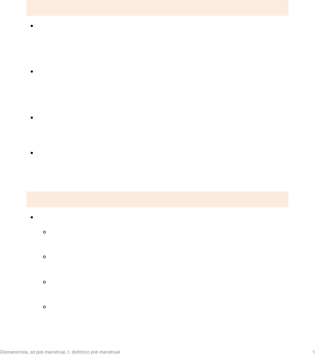 <p>Dismenorreia, sd pré-menstrual, t. disfórico pré-menstrual 1</p><p>Dismenorreia, sd pré-</p><p>menstrual, t. disfórico pré-</p><p>menstrual</p><p>Introdução</p><p>Também chamada de menstruação dolorosa ou cólica menstrual, é uma dor</p><p>uterina aguda ou latejante que ocorre geralmente antes (mas também</p><p>durante) a menstruação que ocorre de modo cíclico, atrapalha atividades</p><p>cotidianas 515% e necessita de medicações específicas.</p><p>Além disso, pode irradiar para dorso e membros inferiores e ser</p><p>acompanhada de outros sintomas, como: dor de cabeça, náusea e vômito,</p><p>desconforto digestivo (constipação ou diarreia), dor mamária, inchaço</p><p>abdominal e desmaios.</p><p>Normalmente tá associada a menstruações mais severas, como</p><p>sangramento menstrual intenso e coágulos sanguíneos. E, pela dor, a</p><p>paciente sente dificuldades pra urinar, podendo gerar polaciúria.</p><p>Pode ser graduada de 0 a 3, de acordo com a intensidade da dor, com os</p><p>efeitos da analgesia, com as atividades diárias e com os sintomas</p><p>sistêmicos.</p><p>Classificação</p><p>PRIMÁRIA</p><p>É aquela em que o ciclo menstrual é normal e não indícios de lesões</p><p>pélvicas/ doenças orgânicas evidentes.</p><p>É de caráter precoce, iniciando após as primeiras menstruações e</p><p>diminuindo ou em torno dos 20 anos ou com a gravidez.</p><p>O principal mecanismo fisiopatológico é o aumento de PGs que geram</p><p>isquemia e contrações uterinas mais dolorosas</p><p>O que ocorre aqui é que: a queda da progesterona ao fim do ciclo</p><p>(antes da menstruação) interfere na fosfolipase A2, liberando mais</p><p>Dismenorreia, sd pré-menstrual, t. disfórico pré-menstrual 2</p><p>ácido araquidônico.</p><p>Essa substância irá, pela via da COX, ser convertidas em</p><p>prostaglandinas PGE2 e PGF2-alfa), que são fatores inflamatórios</p><p>do endométrio, que promovem isquemia por vasoconstrição e</p><p>contrações prolongadas do músculo uterino.</p><p>Além disso, forma também leucotrienos que são responsáveis pelos</p><p>sintomas sistêmicos, como edema e dor lombar.</p><p>SECUNDÁRIAS</p><p>Estão relacionadas à causas orgânicas que alteram o sistema</p><p>reprodutivo, como endometriose, miomas uterinos, infecção pélvica,</p><p>anormalidades congênitas do útero, DIU e anormalidades vaginais.</p><p>É de caráter mais tardio, iniciando só cerca de 2 anos após a menarca.</p><p>Avaliação</p><p>PRIMÁRIA</p><p>Fazer anamnese e E.F. Por meio deles, vamos avaliar se segue as</p><p>características de dor da dismenorreia primária:</p><p>Dismenorreia, sd pré-menstrual, t. disfórico pré-menstrual 3</p><p>Se inicia 6 a 12 meses pós menarca (estando ligada ao início dos</p><p>ciclos), se a dor dura 8 a 72h e coincide com o início do fluxo</p><p>menstrual e se ocorrem sintomas sistêmicos, como náusea e</p><p>vômito, cefaleia, dor lombar, diarreia, irritabilidade, adinamia –</p><p>sintomas estes que tendem a diminuir com o tempo e após a</p><p>primeira gestação.</p><p>É importante buscar por fatores que possam agravar a dor, como:</p><p>níveis altos de PGF1-alfa no líquido menstrual, óstio cervical</p><p>estreito, útero mal posicionado, ansiedade, falta de informação,</p><p>estilo de vida, alimentação desregulada, ansiedade.</p><p>E também por fatores de risco para agravar os sintomas, como:</p><p>menarca precoce, períodos menstruais longos ou intensos,</p><p>tabagismo e HF.</p><p>SECUNDÁRIA</p><p>Anamnsese EF Exames complementares Busca-se pelas</p><p>características clássicas do quadro:</p><p>Padrão mais tardio (mulheres de 30 a 40 anos), com maior duração</p><p>( 3 dias), mudanças no início e na intensidade da dor (geralmente</p><p>acompanhas de mudanças na menstruação).</p><p>Pode vir acompanhada de dispareunia, SUA, duração do fluxo,</p><p>tabagismo, álcool, história de abuso, obesidade, estresse e</p><p>distúrbios emocionais/ alterações de humor, ISTs e procedimentos</p><p>cirúrgicos pélvicos.</p><p>No EF, vamos ter aumento e espessamento uterino.</p><p>Os exames complementares servem pra tentar descobrir a causa</p><p>orgânica, podendo fazer US transvaginal, laparoscopia e</p><p>histeroscopia.</p><p>Além desses, pode-se fazer teste de gestação, US pélvica, cultura</p><p>e PCR cervicais, RNM e histerosalpingografia.</p><p>São inúmeras causas: endometriose, adenomiose, mioma, pólipos,</p><p>malformações congênitas, cistos ovarianos, tumores ovarianos,</p><p>doenças inflamatórias pélvicas e DIUs.</p><p>INDEPENDENTE DO TIPO</p><p>Dismenorreia, sd pré-menstrual, t. disfórico pré-menstrual 4</p><p>O médico deve analisar a idade em que os sintoams começaram, a</p><p>natureza e gravidade, fatores que melhoram e pioram, grau de</p><p>perturbação diária, efeitos sexuais (como dispareunia), a resposta aos</p><p>AINES, se há dor não relacionada à menstruação e se tem indícios de</p><p>infertilidade.</p><p>Além disso, é preciso muita atenção para os SINAIS DE ALERTA</p><p>Dor nova ou de início recente, dor intermitente, febre, corrimento</p><p>purulento e evidências de peritonite</p><p>Tratamento</p><p>PRIMÁRIA</p><p>O principal é usar AINES no início do ciclo para bloquear a produção de</p><p>PGs, podendo usar também anticoncepcionais para impedir a ovulação</p><p>(ciclos anovulatórios são menos dolorosos).</p><p>Além do tratamento farmacológico, é improtante fazer dieta, exercício</p><p>físicos moderados a regular, compressas mornas (vasodilatam e</p><p>diminuem a inflamação) e massagens relaxantes.</p><p>SECUNDÁRIA</p><p>Como não dá pra resolver o problema, a gente avalia caso a caso e</p><p>direciona os esforços para início dos sintomas.</p><p>Pode-se usar analgésicos e AINES (diminuir a atividade da COX </p><p>normalmente, AINES sozinho não resolve nada),</p><p>Deve-se associar esses tratamentos com atividade física (pa
