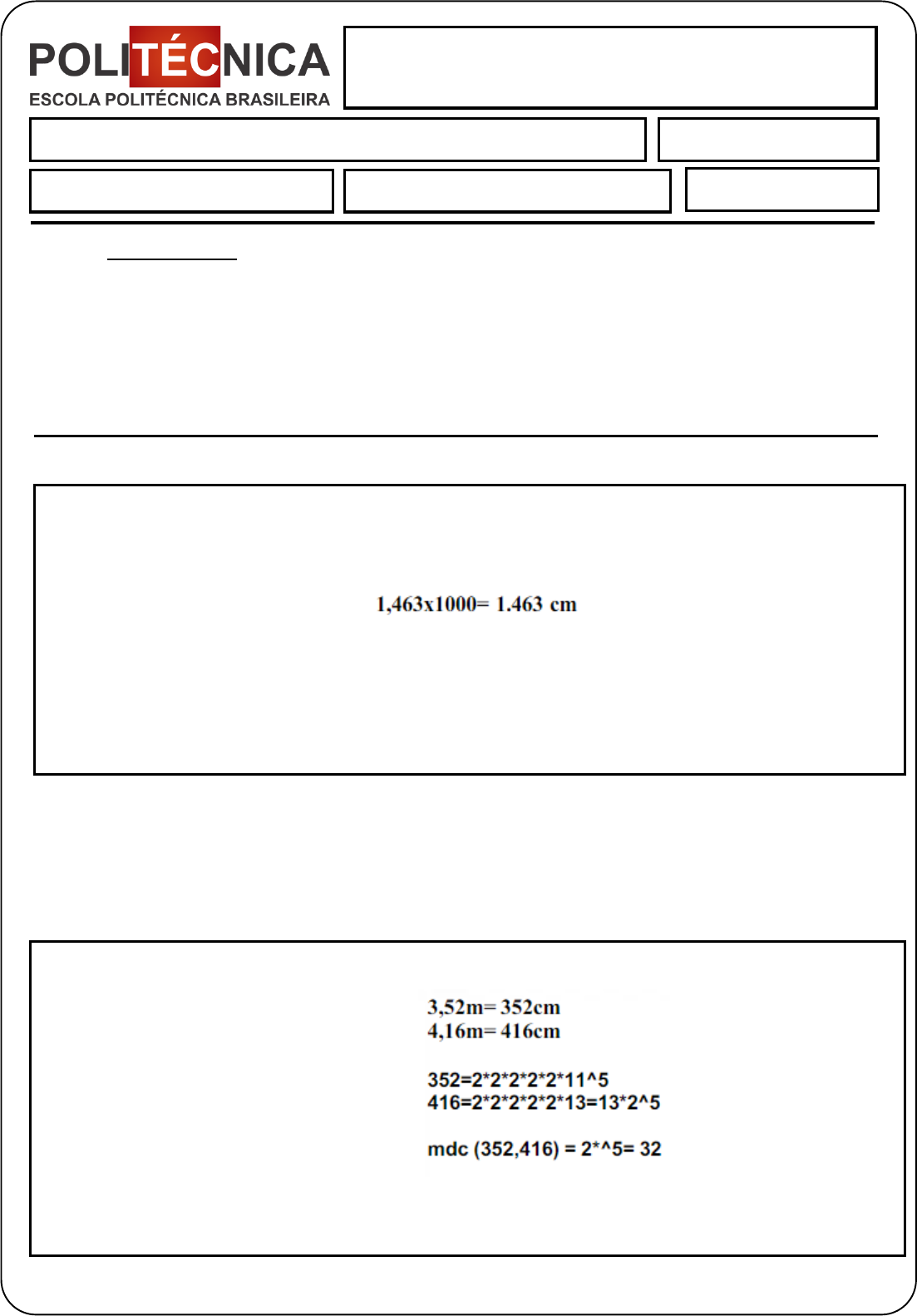 <p>Avaliação Final: Matemática Aplicada</p><p>1 – Marque a alternativa que equivale a conversão de 1,463 dam em cm:</p><p>a) 1.463cm</p><p>b) 146,3cm</p><p>c) 14,63cm</p><p>d) 14.630cm</p><p>2 - O piso de uma sala retangular, medindo 3,52 m × 4,16 m, será revestido com ladrilhos</p><p>quadrados, de mesma dimensão, inteiros, de forma que não fique espaço vazio entre</p><p>ladrilhos vizinhos. Os ladrilhos serão escolhidos de modo que tenham a maior dimensão</p><p>possível. Na situação apresentada, o lado do ladrilho deverá medir?</p><p>a) 28 cm</p><p>b) 30 cm</p><p>c) 32 cm</p><p>d) 34 cm</p><p>Matemática Aplicada</p><p>Aluno (a): VANDERSON TELMAN MARTCHUK Data:28 /06/2024</p><p>Avaliação Final NOTA:</p><p>INSTRUÇÕES:</p><p> Esta Avaliação Final contém 10 questões, totalizando 10 (dez) pontos.</p><p> Você deve preencher dos dados no Cabeçalho para sua identificação</p><p> Nome / Data de entrega</p><p> Utilize o espaço delimitado abaixo de cada questão para desenvolver seus cálculos.</p><p> Só será avaliada a questão que apresentar o seu respectivo desenvolvimento.</p><p> Ao terminar grave o arquivo com o nome Avaliação Final (nome do aluno).</p><p> Salve o arquivo no formato .pdf e envie pelo sistema.</p><p>SÓ SERÁ AVALIADA A QUESTÃO QUE APRESENTAR O SEU RESPECTIVO DESENVOLVIMENTO!</p><p>RESPOSTA A</p><p>SÓ SERÁ AVALIADA A QUESTÃO QUE APRESENTAR O SEU RESPECTIVO DESENVOLVIMENTO!</p><p>RESPOSTA C</p><p>Avaliação Final: Matemática Aplicada</p><p>3 - Calcule e marque a resposta correta para o cálculo de</p><p>912</p><p>921</p><p>:</p><p>a) 9-9</p><p>b) 99</p><p>c) 1-9</p><p>d) 933</p><p>4 – Calcule e marque a resposta correta para o cálculo de √√103𝑥100³</p><p>23</p><p>:</p><p>a) 10𝑥10</p><p>1</p><p>2</p><p>b) 1.000</p><p>c) 101/2</p><p>d) 100</p><p>5 – Calcule as raízes da seguinte equação: 𝑥2 + 2𝑥 − 3 = 0</p><p>a) -3 e 1</p><p>b) 1 e 3</p><p>c) -3</p><p>d) 2</p><p>SÓ SERÁ AVALIADA A QUESTÃO QUE APRESENTAR O SEU RESPECTIVO DESENVOLVIMENTO!</p><p>RESPOSTA A</p><p>SÓ SERÁ AVALIADA A QUESTÃO QUE APRESENTAR O SEU RESPECTIVO DESENVOLVIMENTO!</p><p>RESPOSTA A</p><p>SÓ SERÁ AVALIADA A QUESTÃO QUE APRESENTAR O SEU RESPECTIVO DESENVOLVIMENTO!</p><p>RESPOSTA A</p><p>Avaliação Final: Matemática Aplicada</p><p>6 – Calcule e dê resultado em Notação Científica da seguinte operação: (5𝑥105) − (5𝑥106):</p><p>a) −4,5𝑥106</p><p>b) 0</p><p>c) 4,5𝑥10−1</p><p>d) 1𝑥1011</p><p>7 – Marque a alternativa que equivale a conversão de 54321 cm² em km²</p><p>a) 0,00054321 km²</p><p>b) 0,0000054321 km²</p><p>c) 0,000054321 km²</p><p>d) 0,00000054321 km²</p><p>8 – Qual o valor da área de uma circunferência com diâmetro de 9 cm?</p><p>a) 28,3 cm²</p><p>b) 254,5 cm²</p><p>c) 63,6 cm²</p><p>d) 127,2 cm²</p><p>SÓ SERÁ AVALIADA A QUESTÃO QUE APRESENTAR O SEU RESPECTIVO DESENVOLVIMENTO!</p><p>RESPOSTA A</p><p>SÓ SERÁ AVALIADA A QUESTÃO QUE APRESENTAR O SEU RESPECTIVO DESENVOLVIMENTO!</p><p>RESPOSTA B</p><p>SÓ SERÁ AVALIADA A QUESTÃO QUE APRESENTAR O SEU RESPECTIVO DESENVOLVIMENTO!</p><p>RESPOSTA C</p><p>Avaliação Final: Matemática Aplicada</p><p>9 – Calcule e marque a resposta correta para √72/3</p><p>1</p><p>3</p><p>:</p><p>a) 7</p><p>b) 79/2</p><p>c) 7²</p><p>d) 72/9</p><p>10 – Em uma disputa de tiro, uma catapulta, operando durante 6 baterias de 15 minutos</p><p>cada, lança 300 pedras. Quantas pedras lançará em 10 baterias de 12 minutos cada?</p><p>a) 625 pedras</p><p>b) 600 pedras</p><p>c) 400 pedras</p><p>d) 500 pedras</p><p>SÓ SERÁ AVALIADA A QUESTÃO QUE APRESENTAR O SEU RESPECTIVO DESENVOLVIMENTO!</p><p>RESPOSTA C</p><p>SÓ SERÁ AVALIADA A QUESTÃO QUE APRESENTAR O SEU RESPECTIVO DESENVOLVIMENTO!</p><p>RESPOSTA C</p><p>Avaliação Final: Matemática Aplicada</p><p>Boa Prova!</p>