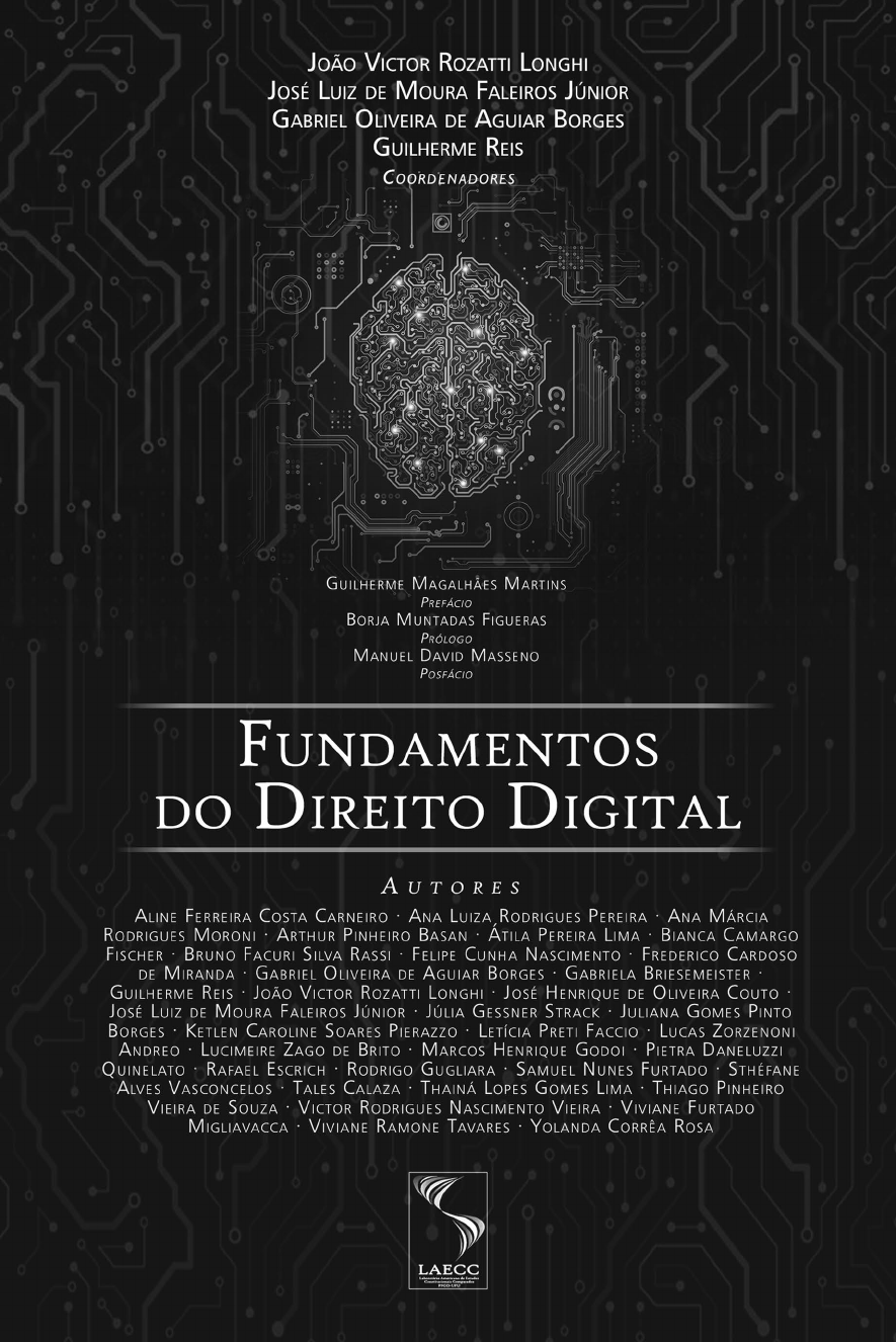 <p>O Laboratório Americano de Estudos Constitucionais Comparados -</p><p>LAECC procura aprofundar as discussões temáticas comparativas entre</p><p>os vários sistemas constitucionais americanos. O grupo desenvolve</p><p>abordagens comparativas em 4 diferentes linhas, procurando cobrir</p><p>todas as dimensões materiais do constitucionalismo e fomentar a pro-</p><p>dução científica nos diversos ramos do direito, sempre primando pela</p><p>abordagem de abrangência interdisciplinar.</p><p>Fundamentos do Direito Digital</p><p>Apoio Alexandre Walmott Borges</p><p>Hugo França Pacheco</p><p>José Luiz de Moura Faleiros Júnior</p><p>Moacir Henrique Júnior</p><p>Ricardo Padovini Pleti Ferreira</p><p>Concepção e coordenação</p><p>João Victor Rozatti Longhi</p><p>José Luiz de Moura Faleiros Júnior</p><p>Organização,</p><p>edição e revisão textual</p><p>Gabriel Oliveira de Aguiar Borges</p><p>Guilherme Reis</p><p>Capa José Luiz de Moura Faleiros Júnior</p><p>Projeto gráfico e diagramação José Luiz de Moura Faleiros Júnior</p><p>Figura da capa Jakarin / VectorStock.com</p><p>Laboratório Americano de Estudos Constitucionais Comparados</p><p>CNPJ/MF nº 33.097.820/0001-00</p><p>Rua Johen Carneiro, 377, Uberlândia – MG</p><p>CEP 38.400-070</p><p>www.laecc.org.br</p><p>Dados Internacionais de Catalogação na Publicação (CIP)</p><p>________________________________________________________________________________</p><p>F981</p><p>2020</p><p>Fundamentos do direito digital / João Victor Rozatti Longhi, José Luiz de</p><p>Moura Faleiros Júnior; Gabriel Oliveira de Aguiar Borges, Guilherme Reis</p><p>(Coordenadores). Uberlândia: LAECC, 2020.</p><p>480 p.</p><p>Inclui bibliografia.</p><p>ISBN: 978-65-99099-21-2</p><p>1. Direito Digital. 2. Filosofia da Tecnologia. 3. Filosofia da Informação. 4.</p><p>Sociedade da Informação. I. Longhi, João Victor Rozatti. II. Faleiros</p><p>Júnior, José Luiz de Moura. III. Borges, Gabriel Oliveira de Aguiar.</p><p>IV. Reis, Guilherme.</p><p>CDD: 340 / CDU: 34:004.738.5</p><p>________________________________________________________________________________</p><p>Catalogação na fonte</p><p>/</p><p>Conselho Editorial</p><p>Laboratório Americano de Estudos Constitucionais Comparados - LAECC</p><p>http://laecc.org.br/conselho-editorial</p><p>ADAILTON BORGES DE OLIVEIRA</p><p>Doutorando no Programa de Biocombustíveis do Instituto de Química da Universidade Federal de</p><p>Uberlândia – UFU. Presidente/coordenador da Comissão Permanente de Sindicância e Inquérito</p><p>da Universidade Federal de Uberlândia – UFU.</p><p>ALESSANDRA SILVEIRA</p><p>Doutora em Direito pela Universidade de Coimbra – UC. Professora da Universidade do Minho –</p><p>Portugal.</p><p>ALEXANDRE DE SÁ AVELAR</p><p>Doutor em História pela Universidade Federal Fluminense – UFF. Professor da Universidade</p><p>Federal de Uberlândia – UFU.</p><p>ALEXANDRE WALMOTT BORGES</p><p>Doutor em Direito pela Universidade Federal de Santa Catarina – UFSC e em História pela Univer-</p><p>sidade Federal de Uberlândia – UFU. Professor da Universidade Federal de Uberlândia – UFU.</p><p>ALFREDO JOSÉ DOS SANTOS</p><p>Doutor em Direito pela Pontifícia Universidade Católica de São Paulo - PUC/SP. Professor da</p><p>Universidade Estadual Paulista - UNESP Campus Franca.</p><p>ALMIR GARCIA FERNANDES</p><p>Doutor em Direito Comercial pela Pontifícia Universidade Católica de São Paulo. Professor do</p><p>Centro Universitário do Planalto de Araxá – UNIARAXÁ.</p><p>ANTONIO MADRID PÉREZ</p><p>Doutor em Direito pela Universitat de Barcelona – UB. Professor da Universidade de Barcelona –</p><p>UB. Professor do curso de Mestrado Interuniversitário organizado pelas universidades: Universidad</p><p>Rey Juan Carlos, Universidad Carlos III de Madrid, Universitat Autònoma de Barcelona e Universi-</p><p>tat de Barcelona.</p><p>BERNARDO WALMOTT BORGES</p><p>Doutor em Física pela Universidade Federal de Santa Catarina – UFSC. Professor da Universidade</p><p>Federal de Santa Catarina – UFSC.</p><p>BORJA MUNTADAS FIGUERAS</p><p>Doutor em Filosofía Contemporánea y Tradición Clásica pela Universitat de Barcelona – UB.</p><p>Professor e investigador em Filosofía Moderna y Contemporánea na Universitat La Salle, Campus</p><p>Barcelona, na Universitat de Barcelona – UB e Professor Convidado na Universidade Federal de</p><p>Uberlândia – UFU.</p><p>DANIEL USTÁRROZ</p><p>Doutor e Mestre em Direito Civil pela Universidade Federal do Rio Grande do Sul – UFRGS. Pro-</p><p>fessor Adjunto de Direito Civil na Pontifícia Universidade Católica do Rio Grande do Sul – PUCRS.</p><p>DIVA JÚLIA SOUSA DA CUNHA SAFE COELHO</p><p>Pós-Doutora em Direito Constitucional Comparado pela Universidade Federal de Uberlândia –</p><p>UFU e Doutora em Ciudadania y Derechos Humanos pela Universidad de Barcelona – UB. Profes-</p><p>sora da Universidade Federal de Goiás – UFG.</p><p>FABIANA ANGÉLICA PINHEIRO CÂMARA</p><p>Doutora em História Social pela Universidade Federal de Uberlândia – UFU. Mestre em Gestão</p><p>Internacional e Desenvolvimento Econômico pela Universidade de Reading – Inglaterra.</p><p>FRANCIELLE VIEIRA OLIVEIRA</p><p>Doutoranda em Ciências Jurídicas Públicas no âmbito do Doutorado Europeu da Universidade do</p><p>Minho – Portugal.</p><p>FRANCISCO ILÍDIO FERREIRA ROCHA</p><p>Doutor em Direito Penal pela Pontifícia Universidade Católica de São Paulo – PUC/SP. Professor</p><p>do Centro Universitário do Planalto de Araxá – UNIARAXÁ.</p><p>GONÇAL MAYOS SOLSONA</p><p>Doutor e Mestre em História da Filosofia pela Universitat de Barcelona – UB. Professor Titular na</p><p>Faculdade de Filosofia da Universitat de Barcelona – UB.</p><p>ILTON NORBERTO ROBL FILHO</p><p>Doutor e Mestre em Direito pela Universidade Federal do Paraná – UFPR. Professor Adjunto da</p><p>Faculdade de Direito da UFPR e do Instituto Brasiliense
