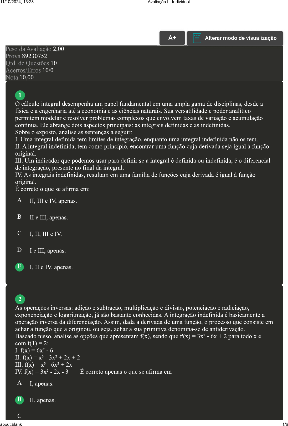 <p>11/10/2024, 13:28 Avaliação Individual A+ Alterar modo de visualização Peso da Avaliação 2,00 Prova 89230752 Qtd. de Questões 10 Acertos/Erros 10/0 Nota 10,00 1 O cálculo integral desempenha um papel fundamental em uma ampla gama de disciplinas, desde a física e a engenharia até a economia e as ciências naturais. Sua versatilidade e poder analítico permitem modelar e resolver problemas complexos que envolvem taxas de variação e acumulação contínua. Ele abrange dois aspectos principais: as integrais definidas e as indefinidas. Sobre exposto, analise as sentenças a seguir: I. Uma integral definida tem limites de integração, enquanto uma integral indefinida não os tem. II. A integral tem como princípio, encontrar uma função cuja derivada seja igual à função original. III. Um indicador que podemos usar para definir se a integral é definida ou indefinida, é diferencial de integração, presente no final da integral. IV. As integrais indefinidas, resultam em uma família de funções cuja derivada é igual à função original. É correto que se afirma em: A II, III e IV, apenas. B II e III, apenas. C I, II, III e IV. D III, apenas. E I, II e IV, apenas. 2 As operações inversas: adição e subtração, multiplicação e divisão, potenciação e radiciação, exponenciação e logaritmação, já são bastante conhecidas. A integração indefinida é basicamente a operação inversa da diferenciação. Assim, dada a derivada de uma função, processo que consiste em achar a função que a originou, ou seja, achar a sua primitiva denomina-se de antiderivação. Baseado nisso, analise as opções que apresentam f(x), sendo que f(x) 3x2 6x + 2 para todo X e com I. II. f(x) III. f(x) IV. f(x) 3x2 É correto apenas que se afirma em A I. apenas. B II, apenas. C about:blank 1/6</p><p>11/10/2024, 13:28 Avaliação Individual II, apenas. D II e IV, apenas. E II e III, apenas. 3 Frações parciais são uma técnica fundamental no cálculo integral, utilizada para decompor uma fração em uma soma de frações mais simples. Esse método é especialmente útil para integrar funções racionais do tipo f(x) p(x)/q(x), tornando-as mais fáceis de serem manipuladas e integradas. Através da decomposição em frações parciais, é possível resolver integrais que seriam difíceis ou impossíveis de serem calculadas de outra forma. Considerando as informações apresentadas, avalie as asserções a seguir e a relação proposta entre elas. I. Considerando polinômio q(x) este será decomposto em quatro partes. PORQUE II. O polinômio q(x) apresenta um fator linear e um fator quadrático irredutível que se repete por três vezes. A respeito dessas asserções, assinale a opção correta: A As asserções I e II são verdadeiras, e a II é uma justificativa correta da I. B A asserção I é uma proposição verdadeira e a II é uma proposição falsa C As asserções I e II são verdadeiras, mas a II não é uma justificativa correta da I. D As asserções I e II são falsas. E A asserção I é uma proposição falsa e a II é uma proposição verdadeira. 4 Em situações em que uma função possui partes de sua representação gráfica acima e abaixo do eixo das abscissas, surge um conceito crucial denominado "saldo de área". Este conceito implica que ao calcular a integral de tal função em um intervalo de integração, resultado não apenas representa a área total sob gráfico, mas também considera a diferença entre as áreas acima e abaixo do eixo das abscissas. Desta forma, analise a representação gráfica de uma função f e sendo a, C e d, as áreas positivas desta função nos respectivos intervalos (-3, -1), (-1, 2), (2, 4) e (4, 6): about:blank 2/6</p><p>11/10/2024, 13:28 Avaliação Individual 3 2 a 1 C 3 -2 0 1 2 3 4 5 6 -1 b d -2 -3 Considerando as informações apresentadas, avalie as asserções a seguir e a relação proposta entre elas. I. A integral definida de -3 até 6 desta função, apresentará como resultado, a soma de a+b+c+d PORQUE II. Ao calcular a área da curva no intervalo de -3 até 6, devemos separar cálculo em quatro partes, respeitando as partes acima e abaixo do eixo das abscissas. A respeito dessas asserções, assinale a opção correta: A A asserção I é uma proposição verdadeira e a II é uma proposição falsa. B As asserções I e II são falsas. C A asserção I é uma proposição falsa e a II é uma proposição verdadeira. D As asserções I e II são verdadeiras, e a II é uma justificativa correta da I. E As asserções I e II são verdadeiras, mas a II não é uma justificativa correta da I. 5 A resolução de integrais requer a aplicação meticulosa de métodos analíticos e estratégias de simplificação, visando encontrar soluções que capturem com precisão os aspectos fundamentais das funções em estudo, sendo uma habilidade essencial em diversas áreas da matemática e ciências aplicadas. Portanto, utilizando das técnicas e métodos desenvolvidos no estudo das integrais, assinale entre as opções a seguir, qual delas apresenta a primitiva da função f(x) = 4xex2 A 2ex2 + C. B C 2xex2 D E + about:blank 3/6</p><p>11/10/2024, 13:28 Avaliação Individual 6 No estudo do cálculo integral, destaca-se método de integração por partes, derivado do princípio da derivação do produto de funções. Este método, em suma, envolve a transformação da integração de uma função complexa em duas ou mais integrais mais simples, tornando mais acessível processo de resolução. Sendo a integral analise as opções que apresentam argumentos válidos, sobre a resolução dessa integral pelo método de integração por partes: I. Devemos assumir inicialmente II. Necessitaremos utilizar por três vezes método para resolver a integral. III. Na segunda vez que aplicamos método, devemos utilizar dx. IV. A integral de deve ser resolvido pelo método da substituição. É correto que se afirma em: A II e III, apenas. B