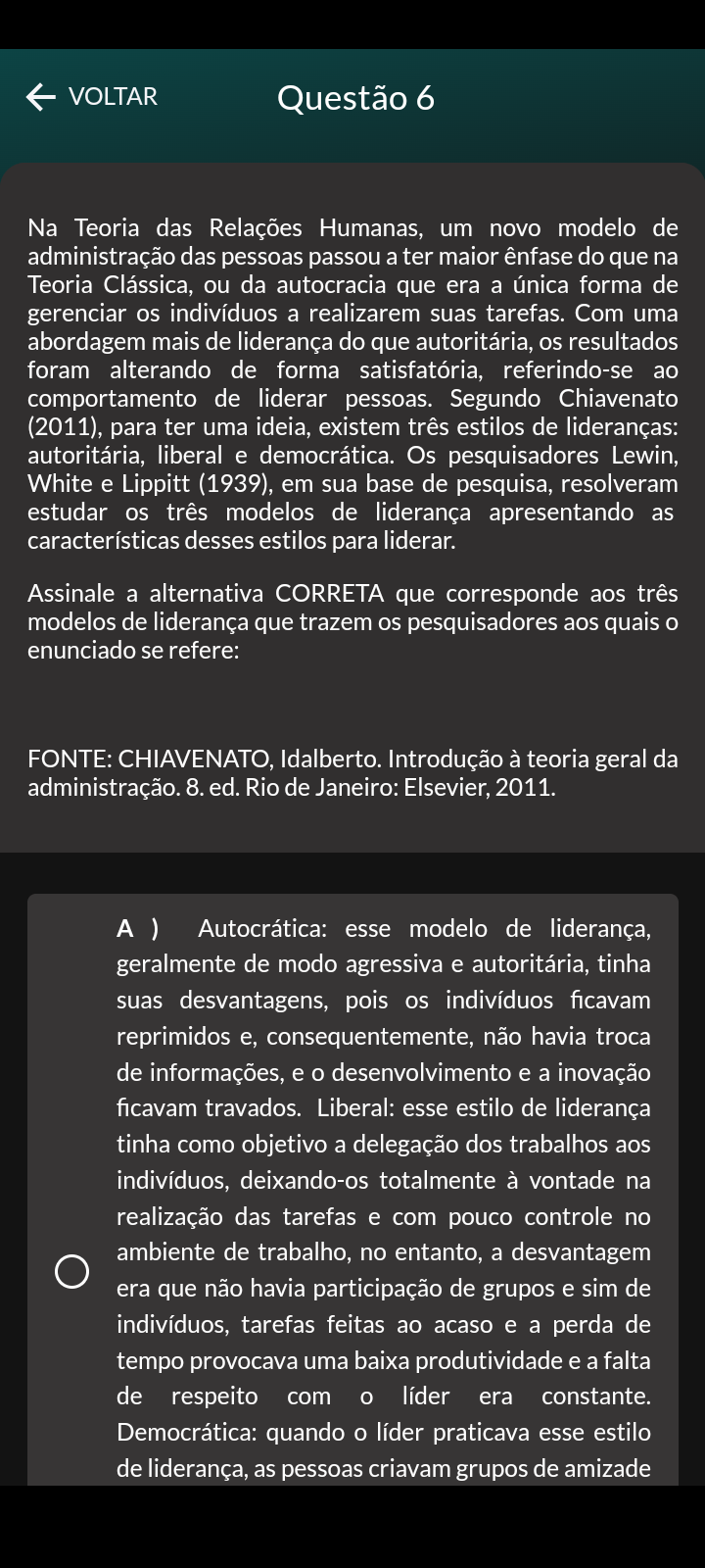 <p>VOLTAR Questão 6 Na Teoria das Relações Humanas, um novo modelo de administração das pessoas passou a ter maior ênfase do que na Teoria Clássica, ou da autocracia que era a única forma de gerenciar os indivíduos a realizarem suas tarefas. Com uma abordagem mais de liderança do que autoritária, os resultados foram alterando de forma satisfatória, referindo-se ao comportamento de liderar pessoas. Segundo Chiavenato (2011), para ter uma ideia, existem três estilos de lideranças: autoritária, liberal e democrática. Os pesquisadores Lewin, White e Lippitt (1939), em sua base de pesquisa, resolveram estudar os três modelos de liderança apresentando as características desses estilos para liderar. Assinale a alternativa CORRETA que corresponde aos três modelos de liderança que trazem os pesquisadores aos quais enunciado se refere: FONTE: CHIAVENATO, Idalberto. Introdução à teoria geral da administração. 8. ed. Rio de Janeiro: Elsevier, 2011. A ) Autocrática: esse modelo de liderança, geralmente de modo agressiva e autoritária, tinha suas desvantagens, pois os indivíduos ficavam reprimidos e, consequentemente, não havia troca de informações, e desenvolvimento e a inovação ficavam travados. Liberal: esse estilo de liderança tinha como objetivo a delegação dos trabalhos aos indivíduos, deixando-os totalmente à vontade na realização das tarefas e com pouco controle no ambiente de trabalho, no entanto, a desvantagem era que não havia participação de grupos e sim de indivíduos, tarefas feitas ao acaso e a perda de tempo provocava uma baixa produtividade e a falta de respeito com líder era constante. Democrática: quando líder praticava esse estilo de liderança, as pessoas criavam grupos de amizade</p>