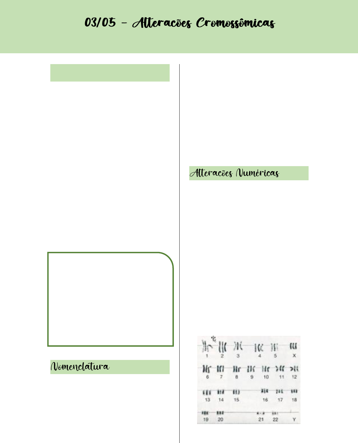 <p>Manifestações Craniofaciais das</p><p>Alterações Cromossômicas</p><p>• Alterações numéricas:</p><p>variação do número (pra</p><p>mais ou pra menos).</p><p>• Alterações estruturais:</p><p>alteração/dano na estrutura</p><p>interna (pedaço perdido,</p><p>acrescentado, danificado).</p><p>- Antes da divisão celular, os</p><p>cromossomos que estavam</p><p>totalmente desespiralados /</p><p>desenovelados passam a ficar bem</p><p>condensados → característica que</p><p>requer para a divisão celular.</p><p>- Se não ocorrer essa condensação</p><p>dos cromossomos → não</p><p>conseguiriam se dividir</p><p>adequadamente → vários erros.</p><p>Qual a melhor fase da mitose para</p><p>análise dos cromossomos?</p><p>Metáfase, porque eles estão bem</p><p>condensados e situados na região</p><p>equatorial da célula → consegue</p><p>observar se tem todos os</p><p>cromossomos, se não tá faltando ou</p><p>sobrando algum/ns e se a estrutura</p><p>deles está adequada.</p><p>46, XY → homem normal: no que diz</p><p>respeito a número e estrutura dos</p><p>cromossomos.</p><p>46, XX → mulher normal.</p><p>47, XY + 21 → homem portador de S.</p><p>de Down: porque há 47</p><p>cromossomos – alteração numérica</p><p>pra mais no cromossomo 21</p><p>(Trissomia do 21).</p><p>46, XX, 5p- ou 46, XX del (5p) →</p><p>mulher normal quanto ao número</p><p>de cromossomos – porém portadora</p><p>da S. Miado de Gato, tem uma</p><p>deleção (del) no braço curto do</p><p>cromossomo de número 5 (5p-).</p><p>- Aneuploidias: envolve apenas 1</p><p>cromossomo.</p><p> S. de Down → acomete só o</p><p>21 → para mais.</p><p> S. de Turner → acomete o</p><p>cromossomo X → para menos</p><p>- Poliploidias: condições</p><p>incompatíveis com a vida humana</p><p>→ individuo nasce com vários</p><p>cromossomos de todos os tipos.</p><p>- Os organismos que podem ser</p><p>triploides, hexaploides são</p><p>organismos vegetais → nós humanos</p><p>somos diploides (no máximo</p><p>aneuploidia de 1 cromossomo)</p><p>ESTER ABREU DA GRAÇA TEIXEIRA – S3, PE MANHÃ</p><p>Como surge uma alteração</p><p>cromossômica numérica</p><p>(aneuploidia)?</p><p>- Pode surgir por conta da não-</p><p>disjunção:</p><p>• Das cromátides-irmãs durante</p><p>a mitose.</p><p>• Dos cromossomos homologos</p><p>na meiose I.</p><p>• Das cromátides irmãs na</p><p>meiose II.</p><p>Mitose errada</p><p>- Durante a mitose errada acontece</p><p>a não-disjunção das cromátides-</p><p>irmãs.</p><p>Meiose errada</p><p>- Meiose I: não-disjunção dos</p><p>cromossomos homólogos →</p><p>gerando gametas errados (sem</p><p>cromossomo e com cromossomo a</p><p>mais).</p><p>- Meiose II: não-disjunção das</p><p>cromátides-irmãs.</p><p>- Quando a falha é na meiose, é</p><p>melhor que seja na meiose II →</p><p>porque há 50% de chance de ter</p><p>gametas com o número de</p><p>cromossomos normais.</p><p>- Quando é na meiose I nunca vai ter</p><p>gameta normal → porque ou vai ter</p><p>gameta sem cromossomo ou</p><p>gameta com cromossomo a mais.</p><p>- Uma mulher normal (2n)</p><p>produzindo dois gametas femininos</p><p>(ovócitos) → no momento da</p><p>produção tem que ir um</p><p>cromossomo de cada para as duas</p><p>células-filha (gametas).</p><p>- Na bolinha amarela foram 2</p><p>cromossomos 21 e na verde não foi</p><p>nenhum.</p><p>- Quando o ovócito amarelo for</p><p>fertilizado por um espermatozoide →</p><p>que vai trazer um 21 → surge a</p><p>trissomia.</p><p>- Isso também pode acontecer com</p><p>os cromossomos sexuais → cada</p><p>gameta deve conter apenas 1</p><p>cromossomo sexual:</p><p>Mulher: só um X.</p><p>Homem: só um Y ou só um X.</p><p>- Se não houver a não-disjunção dos</p><p>gametas (um X vai pra um gameta</p><p>e o outro vai pra outro gameta) → se</p><p>2 X vierem pro mesmo gameta →</p><p>trissomia.</p><p>Síndrome de Klinefelter</p><p>- O indivíduo tem dois X (pode ser</p><p>por conta da não-disjunção dos</p><p>cromossomos da mulher ou do</p><p>homem).</p><p>- O homem tem XY → quando ele vai</p><p>produzir seus espermatozoides →</p><p>ocorre a disjunção deles e cada</p><p>espermatozoide produzido só pode</p><p>ter ou um X ou um Y.</p><p>- Se vier um XY juntos no mesmo</p><p>espermatozoide → não-disjunção.</p><p>- A mulher é XX → um X vai pra um</p><p>óvulo e o outro vai pro outro óvulo →</p><p>supondo que houve a não-</p><p>disjunção desses gametas → os dois</p><p>X foram pra um só juntos e nenhum</p><p>X pro outro.</p><p>- Se o gameta com XX for</p><p>fecundado com o espermatozoide</p><p>que tá portando o cromossomo X →</p><p>surge a Trissomia do X (XXX) →</p><p>mulher nasce com triplo X.</p><p>- Se o gameta sem nenhum</p><p>cromossomo sexual for fecundado</p><p>pelo espermatozoide que tá</p><p>portando o X → nasce o X0 (só um X)</p><p>→ mulher portadora da S. de Turner.</p><p>- Se o gameta com XX for</p><p>fecundado pelo espermatozoide</p><p>portando o cromossomo Y → nasce</p><p>XXY (sempre homem) → S. de</p><p>Klinefelter.</p><p>- Se o gameta sem nenhum</p><p>cromossomo sexual for fecundado</p><p>pelo espermatozoide que tá</p><p>portando o Y → nasce Y0 (ovo</p><p>inviável) → não compatível com a</p><p>vida.</p><p>- Trissomia do cromossomo 21.</p><p>- Alteração cromossômica numérica</p><p>→ aneuploidia.</p><p>- Muito comum → 1:700 nascidos.</p><p>Etiologia</p><p>• Trissomia livre do</p><p>cromossomo 21</p><p>- Não-disjunção dos cromossomos</p><p>durante a meiose (I ou II) gerando</p><p>gametas com os dois cromossomos</p><p>21.</p><p>- Ocorre em 92-95% dos casos:</p><p>comum.</p><p>- Problema dos gametas ou do pai</p><p>ou da mãe → gerando número</p><p>errado dos cromossomos.</p><p>• Mosaicismo</p><p>- Ocorre em 1 a 2% dos casos (mais</p><p>raro).</p><p>- Menos anomalias físicas e</p><p>capacidade intelectual mais</p><p>elevada.</p><p>- Acontece após a fertiliza