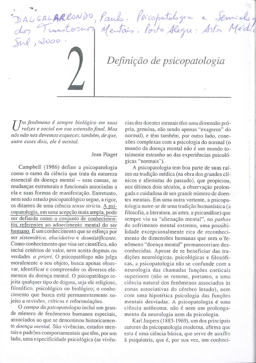 <p>e Porto Alegre 2000 2 Definição de psicopatologia U fenômeno é sempre biológico em suas cias dos doentes mentais têm uma dimensão pró- raízes e social em sua extensão final. Mas pria, genuína, não sendo apenas "exageros" do nós não nos devemos esquecer, também, de que, normal), e têm também, por outro lado, cone- entre esses dois, ele é mental. xões complexas com a psicologia do normal (o mundo da doença mental não é um mundo to- Jean Piaget talmente estranho ao das experiências psicoló- gicas "normais"). Campbell (1986) define a psicopatologia A psicopatologia tem boa parte de suas raí- como o ramo da ciência que trata da natureza zes na tradição médica (na obra dos grandes clí- essencial da doença mental suas causas, as nicos e alienistas do passado), que propiciou, mudanças estruturais e funcionais associadas a nos últimos dois séculos, a observação prolon- ela e suas formas de manifestação. Entretanto, gada e cuidadosa de um grande número de doen- nem todo estudo psicopatológico segue, a rigor, tes mentais. Em uma outra vertente, a psicopa- os ditames de uma ciência sensu strictu. A psi- tologia nutre-se de uma tradição humanística (a copatologia, em uma acepção mais ampla, pode filosofia, a literatura, as artes, a psicanálise) que ser definida como o conjunto de conhecimen- sempre viu na "alienação mental", no pathos tos referentes ao adoecimento mental do ser do sofrimento mental extremo, uma possibi- humano. É um conhecimento que se esforça por lidade excepcionalmente rica de reconheci- ser sistemático, elucidativo e desmistificante. mento de dimensões humanas que sem o "fe- Como conhecimento que visa ser científico, não nômeno "doença mental" permaneceriam des- inclui critérios de valor, nem aceita dogmas ou conhecidas. Apesar de se beneficiar das tra- verdades a priori. O psicopatólogo não julga dições neurológicas, psicológicas e filosófi- moralmente o seu objeto, busca apenas obser- cas, a psicopatologia não se confunde com a var, identificar e compreender os diversos ele- neurologia das chamadas funções corticais mentos da doença mental. O psicopatólogo re- superiores (não se resume, portanto, a uma jeita qualquer tipo de dogma, seja ele religioso, ciência natural dos fenômenos associados às filosófico, psicológico ou biológico; o conhe- zonas associativas do cérebro lesado), nem cimento que busca está permanentemente su- com uma hipotética psicologia das funções jeito a revisões, críticas e reformulações. mentais desviadas. A psicopatologia é uma O campo da psicopatologia inclui um gran- ciência autônoma, não é nem um prolonga- de número de fenômenos humanos especiais, mento da neurologia nem da psicologia. associados ao que se denominou historicamen- Karl Jaspers (1883-1969), um dos principais te doença mental. São vivências, estados men- autores da psicopatologia moderna, afirma que tais e padrões comportamentais que têm, por um esta é uma ciência básica, que serve de auxílio lado, uma especificidade psicológica (as vivên- à psiquiatria, que é, por sua vez, um conheci-</p><p>PSICOPATOLOGIA E SEMIOLOGIA DOS TRANSTORNOS MENTAIS 23 mento aplicado a uma prática profissional e so- de sua biografia, isso nunca explicará totalmente cial concreta. a vida e a obra de Van Gogh. Sempre resta algo Jaspers é muito claro em relação aos limites que transcende à psicopatologia, e, mesmo, à da psicopatologia: embora o objeto de estudo ciência, e que permanece no domínio do misté- da psicopatologia seja o homem na sua totali- rio. dade ("nosso tema é homem todo em sua en- fermidade" Jaspers, 1913), os limites da cia psicopatológica consistem precisamente em FORMA E CONTEÚDO DOS SINTOMAS que nunca se pode reduzir inteiramente ser humano a conceitos psicopatológicos. O domí- Quando se estuda os sintomas psicopatoló- nio da psicopatologia, segundo ele, estende-se gicos costuma-se enfocar dois aspectos básicos; a "todo fenômeno psíquico que se possa apre- a forma dos sintomas, isto é, sua estrutura bási- ender em conceitos de significação constantes ca, relativamente semelhante nos diversos pa- e com possibilidade de comunicação". Assim, cientes (alucinação, delírio, idéia obsessiva, la- a psicopatologia, enquanto ciência, exige um bilidade afetiva, etc.) e seu conteúdo, ou seja, pensamento rigorosamente conceitual, que seja aquilo que preenche a alteração estrutural (con- sistemático e que possa ser comunicado de modo teúdo de culpa, religioso, de perseguição, etc.). inequívoco. Na prática profissional, entretanto, O conteúdo é, geralmente, mais pessoal, depen- participam ainda opiniões instintivas, uma in- dendo da história de vida do paciente, de seu tuição pessoal que nunca se pode universo cultural e personalidade prévia ao Assim, a ciência psicopatológica é tida como adoecimento. uma das abordagens possíveis do homem men- talmente doente, mas não a única e exclusiva. Em todo indivíduo oculta-se algo que não Quadro 2.1 Temas existenciais que se pode conhecer, pois a ciência requer um pen- se expressam no conteúdo dos sintomas psicopatológicos samento conceitual sistemático, pensamento que cristaliza, que torna evidente, mas também que Temas centrais para que busca e deseja ser humano aprisiona o conhecimento. Quanto mais concei- tualiza, afirma Jaspers, "quanto mais reconhe- Sexo Alimentação Prazer ce e caracteriza o típico, que se acha de acor- Conforto físico do com os princípios, tanto mais reconhece que, em todo indivíduo, oculta-se algo que não pode Dinheiro Segurança/controle Poder sobre o outro conhecer". a psicopatologia sempre per- Prestígio de, obrigatoriamente, aspectos essenciais do ho- mem, principalmente nas dimensões existenci- ais, estéticas, éticas e metafísicas. O filósofo Gadamer (1990) afirma que, "diante de uma Quadro 2.2 Temores que obra de arte, experimentamos uma verdade ina- se expressa