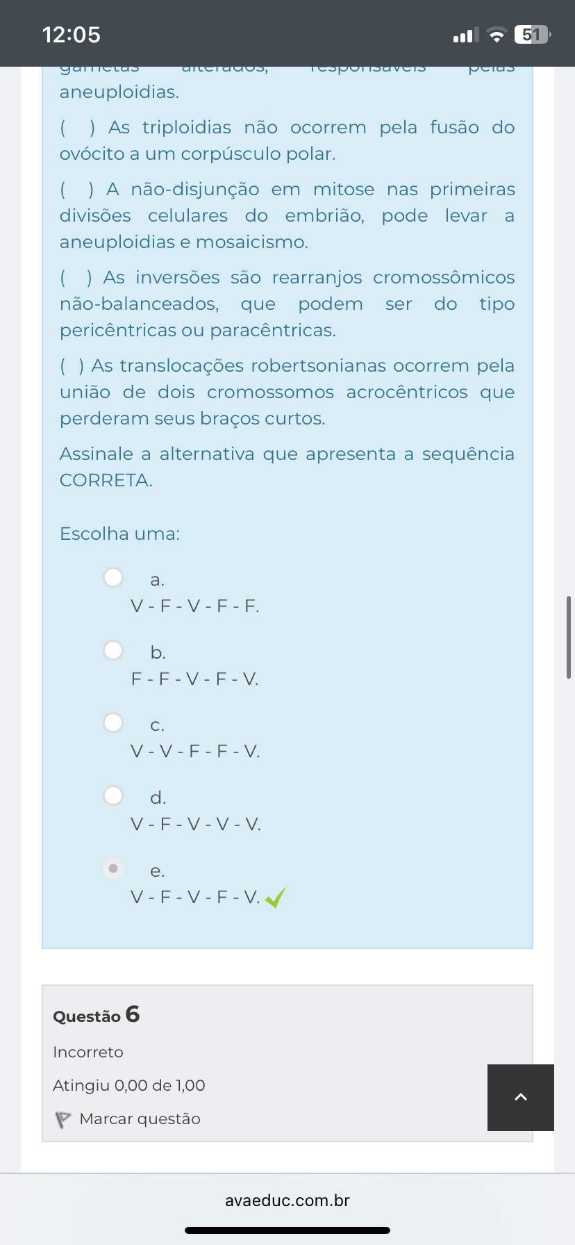<p>12:05 51 aneuploidias. ( ) As triploidias não ocorrem pela fusão do a um corpúsculo polar. ( ) A não-disjunção em mitose nas primeiras divisões celulares do embrião, pode levar a aneuploidias e mosaicismo. ( ) As inversões são rearranjos cromossômicos não-balanceados, que podem ser do tipo pericêntricas ou paracêntricas. As translocações robertsonianas ocorrem pela união de dois cromossomos acrocêntricos que perderam seus braços curtos. Assinale a alternativa que apresenta a sequência CORRETA. Escolha uma: a. b. - C. - - V. d. e. V-F-V-F - V. Questão 6 Incorreto Atingiu 0,00 de 1,00 ^ Marcar questão avaeduc.com.br</p>