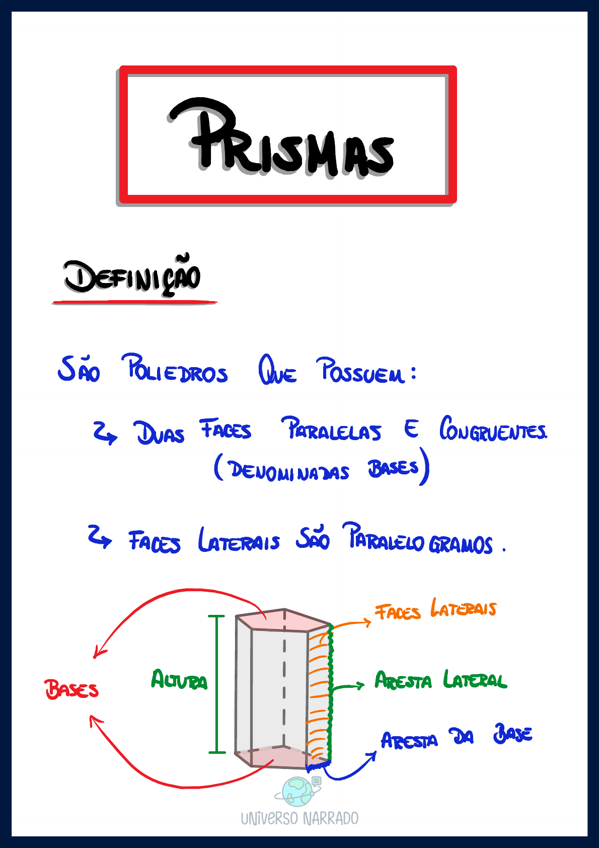 <p>PRISMAS DEFINIÇÃO POLIEDROS QUE : DUAS FACES PARALELAS E (DENOMINADAS BASES) FACES LATERAIS SAO PARALELO GRAMOS FACES LATERAIS I BASES ALTURA ARESTA LATERAL ARESTA DA BASE NARRADO</p><p>CLASSIFICAÇÃO Dos PRISMAS QUANTO A INCLINAÇÃO DAS ARESTAS LATERAIS ALTURA a # 90° 7 x PRISMA PRISMA RETO OBSERVATIONS ALTURA : DISTANCIA ENTRE Os DA ARESTAS LATERAIS: PARALEAS NARRADO</p><p>QUANTO Ao POLIGONO DA BASE PRISMA TRIANGULAR I L PRISMA PENTAGONAL HEXAGONAL NARRADO</p><p>REGULAR E Uu PRISMA RETO BASE E Um POLIGONO REGULAR. FRIANGULO EQUILATERO P NARRADO</p><p>EXEMPLO PRISMA POSSUI 7 CLASSIFIQUE ESSE PRISMA. FACES DA BASE : FACES LATERAIS : 5 PRISMA PENTAGONAL NARRADO</p><p>EXEMPLO PRISMA TEM n FACES CALCULE NUMERO DE ARESTAS. 5 5 5 ARESTIAS n BASE SUPERIOR n BASE INPERIOR 3n ARESTAS n As BASES NARRADO</p><p>EXEMPLO VERIFIQUE QUAIS SOLIDOS ABAIXO SAO CLASSIFIQUE -OS E IDENTIFIQUE SUAS ALTURAS. h PRISMA PRISMA QUATRILATERAL PRISMA PENTAGONAL NARRADO</p><p>DE Uu PRISMA TRANSVERSAL PARALELA BASES. RETA PERPENDICULAR As ARESTAS LATERAIS NARRADO</p><p>EXEMPLO DESENNE Uu PRISMA PENTAGONAL RETO E Uu TRIANGULAR E UMA TRANSVERSAL Eu CADA DELES. UNIVERSO NARRADO</p><p>VOLUME Ab: DA BASE h: ALTURA I 4cm 4cm Ab = 12cm 6 Ab = = V2= 12.4 V2= 12.4 V2 48cm3 NARRADO</p><p>AREAS AT = 2Ab + AL AT : AREA TOTAL : AREA DA BASE AL : AREA LATERAL 5 BASE PRISMA TRIANGULAR S 8 3 RETO 4 3 = + 3.8 + 5.8 = 8(4+3+5) = 96 AT = AT = 108 Ab = 3.4 = 6 NARRADO</p><p>EXEMPLO CALCULE VOLUME E A AREA TOTAL DO PRISMA TRAPEZOIDAL 8 10 5 5 z NARRADO</p><p>z 5 ht 4 5 A6 = 3 3 8 Ab = = 20 x V = Ab.h V= 20.10 V= 200 AT= + AL AL = 2.10 + 5.10 10(2+5+8+5) = 200 AT = AT= 240 NARRADO</p><p>EXEMPLO CALCULE 0 VOLUME E A AREA TOTAL DE UM PRISMA HEXAGONAL REGULAR LADO DA BASE E ALTURA 8. 8 4 4 4 Ab = 6. = 6. 4 4 4 4 Ab = 4 V = V 24 V= NARRADO</p><p>AT = AL AL = PERIMETRO base h AL = 192 AT= + 192 AT = 192 AT= NARRADO</p><p>EXEMPLO CALCULE 0 VOLUME Do SOLIDO. 12 z 10 ALTURA 6 4 = = 40 4 8 A2 = 4 = 48 10 Ab = + As 4 Ab = 88 V = Ab.h V= 88.6 V= 528 NARRADO</p><p>EXEMPLO CALCULE 0 VOLUME DE PRISMA AREA DA BASE E ARESTAS RAIS MEDEM 30 E 60° 0 PLANO DA BASE. Sen 60° = h 30 30 30 = h h 30 15 60° h= 15 J3 V = Ab.h V= V= NARRADO</p><p>EXEMPLO CALCULE x DE 0 VOLUME SEJA 8. x 450 3 45° 3 Ab = (B.b)h x 3 450 Ab = (2x+3+3) x x 450 Ab = 3 4 V= Ab.h = - 4=0 S=-3 P= - 4 X2 =-4 NARRADO</p><p>TRONCO DE PRISMA TRIANGULAR FACE PARALELA A BASE ALTURA hu a c hu = 3 Ab VT = Ab.hu OBSERVATION FACES LATERAIS: NARRADO</p><p>6 6 20 15 10 6 hu= hu= 15 3 = 6'5 4 = NARRADO</p><p>TRONCO DE PRISMA GERAIS E SE TRONCO FOR TRIANGULAR ? SUBDIVIDIR Eu TRIANGULAR a c a d b NARRADO</p><p>EXEMPLO CALCULE 0 VOLUME DO TRONCO DE PRISMA TRIANGULAR ABAIXO. 8 6 4 Ab = 10 = 8+6+4 6 3 V = V= 10.6 V= 60 NARRADO</p><p>EXEMPLO CALCULE 0 VOLUME DO TRONCO DE PRISMA DE BASE QUADRADA 24 18 10 4 A1=8 4 Az=8 4 NARRADO</p><p>24 24 18 16 10 10 Ab=8 =8 hus = 24+18+10 huz = 3 3 = 52 hmz = 50 3 3 V1 = 8.52 = 416 V2 = 8.50 = 400 3 3 3 3 VT = VT 416 + 400 = 816 3 3 3 VT=272 NARRADO</p><p>EXEMPLO UM PRISMA TRIANGULAR REGULAR ARESTA DA BASE MEDE a E INTERSECTADO POR PLANO OBTENDO TRONCO DE ARESTAS LATERAIS GUAIS A x, y E CALCULE A AREA LATERAL. z y a a a NARRADO</p><p>As = (x y)a z y ax ay 7 a = (x + zla z A2 = ax + az a A3 = y A3 ay az a = ax t ay + ax+az + ay+az AL = axtay az NARRADO</p><p>PRISMAS IMPORTANTES PRISMAS FACES PARALELOGRAMOS. PARALELEPÍPEDO PARALELEPÍPEDO - RETO RETO RETO NARRADO</p><p>RETO RETANGULO c D b a V = Ab.h V=abc AREA : + 2bc + TOTAL AT = + = D c NARRADO</p><p>CUBO a a a 6a D NARRADO</p><p>EXEMPLO CALCULE A AREA TOTAL E O VOLUME DE PARALELEPIPEDO RETO CUJAS ARESTAS MEDEM E 5. CALCULE 0 COMPRIMENTO DA DIAGONAL. 3 4 5 V = 3.4.5 V = 60 AT = t 3.5 + 4.5) AT = 94 D = 50 50 D 25 5 5 5 1 NARRADO</p><p>EXEMPLO CALOULE A TANGENTE DO ANGULO QUE A DIAGONAL DO RETO A a 450 30° 450 a a y 30° a x NARRADO</p><p>tg 30° = a x V3 = a 3 = 3a x = 13 2 a y 4a av tgo = a = I za NARRADO</p><p>EXEMPLO SEJA Uu PARALELEPIPEDO RETO PERIMETRO DA 14 DIAGONAL : 13 ALTURA : 12 CALCULE 13 2 = 12 & + d 169 = 144 12 25 = d 13 d=5 d NARRADO</p><p>BASE a +26 = 14 b - a a = 5 5 7-a a + - a A = a 7 + a=3 b=3 V=a.b.c V= 3.4.12 V=144 NARRADO</p><p>EXEMPLO Dois CUBOS Com ARESTAS 6 E 10 SAO FUNDIDOS E DEPOIS MOLDADOS Com Um PARA- LELEPIPEDO RETO DE ARESTAS 4, 16 E X. CALCULE x. 6 4 16 10 16.4.x = 3 + 103 3 64x = 12.16 = 1216 64 NARRADO</p><p>EXEMPLO CALCULE A AREA E O VOLUME DE Um CUBO DE DIAGONAL d. d a= d V3 V3 a a= 3 3 z 3 V= 3 V = g 2 A = A= A= NARRADO</p><p>EXEMPLO QUAL A MENOR A FORMIGA DEVE ANDAR PARA IR DO VERTICE "A" VERTICE B PELA Su- B a ? a A a NARRADO</p><p>B s R a A a P R s B x a A a P a x 2 = a + (2a)2 x = 5a = NARRADO</p><p>EXEMPLO Ao INCLINAR SOBRE A ARESTA DER- 3/4 Do CALOULE 0 ANGULO DE Q 8 B / 4 P 4 A VTOTAL = 4.4.8 VTOTAL = 128 VDERRAMADO = I VDERRAMADO = 32 4 NARRADO</p><p>PRISMA TRIANGULAR Q R x A = x.4 4 Ab = 2x = 4 VPRISMA = tgo = 4 = 4 = O = NARRADO</p>