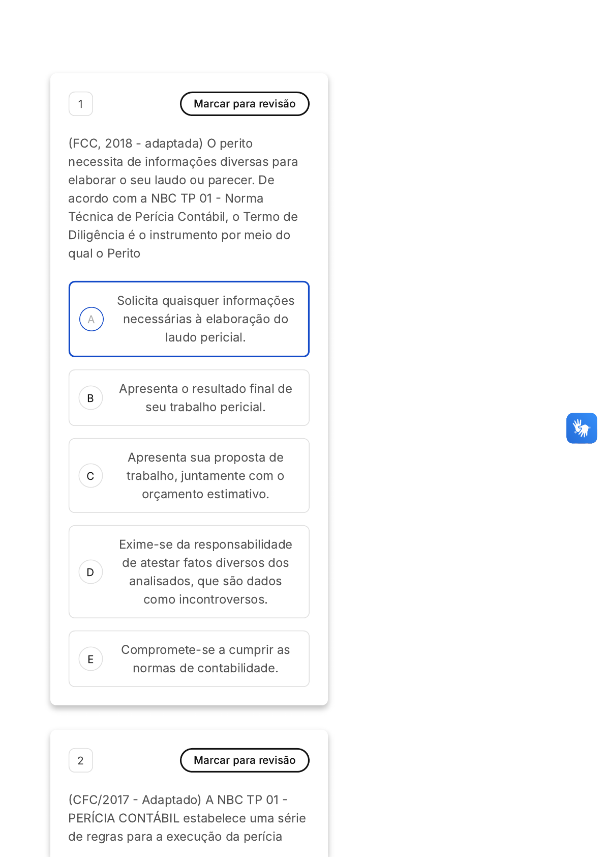<p>A</p><p>B</p><p>C</p><p>D</p><p>E</p><p>1 Marcar para revisão</p><p>�FCC, 2018 - adaptada) O perito</p><p>necessita de informações diversas para</p><p>elaborar o seu laudo ou parecer. De</p><p>acordo com a NBC TP 01 � Norma</p><p>Técnica de Perícia Contábil, o Termo de</p><p>Diligência é o instrumento por meio do</p><p>qual o Perito</p><p>Solicita quaisquer informações</p><p>necessárias à elaboração do</p><p>laudo pericial.</p><p>Apresenta o resultado final de</p><p>seu trabalho pericial.</p><p>Apresenta sua proposta de</p><p>trabalho, juntamente com o</p><p>orçamento estimativo.</p><p>Exime-se da responsabilidade</p><p>de atestar fatos diversos dos</p><p>analisados, que são dados</p><p>como incontroversos.</p><p>Compromete-se a cumprir as</p><p>normas de contabilidade.</p><p>2 Marcar para revisão</p><p>�CFC/2017 � Adaptado) A NBC TP 01 �</p><p>PERÍCIA CONTÁBIL estabelece uma série</p><p>de regras para a execução da perícia</p><p>A</p><p>B</p><p>C</p><p>D</p><p>E</p><p>contábil. Sobre esse documento é</p><p>CORRETO afirmar que:</p><p>Em relação à execução da</p><p>perícia contábil, o perito-</p><p>assistente não pode, em</p><p>nenhuma hipótese, manter</p><p>contato com o advogado da</p><p>parte que o contratou.</p><p>Os peritos não são obrigados a</p><p>consignar as suas conclusões</p><p>no final do laudo pericial</p><p>contábil ou do parecer técnico-</p><p>contábil, visto que em várias</p><p>situações o laudo pode ser</p><p>inconclusivo.</p><p>Quando se tratar de laudo</p><p>pericial contábil, assinado em</p><p>conjunto pelos peritos, a</p><p>responsabilidade caberá apenas</p><p>ao perito assistente.</p><p>Termo de diligência é o</p><p>instrumento por meio do qual o</p><p>perito solicita documentos,</p><p>coisas, dados e informações</p><p>necessárias à elaboração do</p><p>laudo pericial contábil e do</p><p>parecer técnico-contábil.</p><p>O termo de diligência não serve</p><p>para formalizar e comprovar o</p><p>trabalho de campo.</p><p>3 Marcar para revisão</p><p>A</p><p>B</p><p>C</p><p>D</p><p>E</p><p>�Adaptado de UECE�CEV/2017� A</p><p>perspectiva da Mediação de Conflitos</p><p>possui uma forma específica de proceder</p><p>em determinadas situações. Diante de</p><p>uma situação conflituosa, na perspectiva</p><p>da mediação de conflitos, o</p><p>procedimento correto a ser assumido é:</p><p>Ignorar a existência da mesma</p><p>Responder de forma violenta,</p><p>para cessá-la de imediato</p><p>Estabelecer diálogo como</p><p>forma de solução</p><p>Silenciar até que a situação por</p><p>si só se desfaça</p><p>Pedir que não conversem mais</p><p>4 Marcar para revisão</p><p>O perito contábil tem um papel essencial</p><p>na produção do laudo pericial. Sobre</p><p>isso, analise as afirmações a seguir. I.</p><p>Quando não for possível concluir o laudo</p><p>pericial contábil no prazo fixado pela</p><p>autoridade competente, deve o perito</p><p>nomeado requerer a sua dilação antes de</p><p>vencido aquele, apresentando os motivos</p><p>que ensejaram a solicitação. II. O perito</p><p>não deve prestar esclarecimentos sobre</p><p>o conteúdo do laudo pericial contábil ou</p><p>do parecer pericial contábil, em</p><p>atendimento à determinação da</p><p>autoridade competente. III. O perito deve</p><p>comprovar sua habilitação por intermédio</p><p>de Certidão de Regularidade Profissional</p><p>https://www.qconcursos.com/questoes-de-concursos/bancas/uece-cev</p><p>A</p><p>B</p><p>C</p><p>D</p><p>E</p><p>emitida pelos Conselhos Regionais de</p><p>Contabilidade ou do Cadastro Nacional</p><p>de Peritos Contábeis do CFC. O perito</p><p>pode anexá-las no primeiro ato de sua</p><p>manifestação e na apresentação do</p><p>laudo ou parecer. Diante das afirmativas,</p><p>assinale a opção correta:</p><p>I</p><p>II</p><p>III</p><p>II e III</p><p>I e III</p><p>5 Marcar para revisão</p><p>�CFC/2012 - adaptada) De acordo com</p><p>NBC TP 01 ¿ Perícia Contábil, o</p><p>planejamento deve ser elaborado com</p><p>base nos quesitos e/ou no objeto da</p><p>perícia.</p><p>Em relação aos objetivos do</p><p>planejamento da perícia, julgue os itens</p><p>abaixo como verdadeiros �V) ou Falsos</p><p>�F) e, em seguida, assinale a opção</p><p>CORRETA.</p><p>( ) Conhecer o objeto da perícia, a fim de</p><p>permitir a adoção de procedimentos que</p><p>conduzam à revelação da verdade, a qual</p><p>subsidiará o juízo, o árbitro ou o</p><p>interessado a tomar a decisão a respeito</p><p>da lide.</p><p>A</p><p>B</p><p>C</p><p>D</p><p>E</p><p>( ) Estabelecer condições para que o</p><p>trabalho seja cumprido no prazo</p><p>estabelecido.</p><p>( ) Identificar a legislação aplicável ao</p><p>objeto da perícia.</p><p>( ) Identificar fatos que possam vir a ser</p><p>importantes para a solução da demanda</p><p>de forma que não passem despercebidos</p><p>ou não recebam a atenção necessária.</p><p>A sequência CORRETA é:</p><p>V, V, V, V.</p><p>F, F, F, V.</p><p>F, V, V, F.</p><p>V, F, F, F.</p><p>V, V, V, F.</p><p>6 Marcar para revisão</p><p>�Adaptada de FCC, 2018 - adaptada)</p><p>Para desenvolver e fundamentar o seu</p><p>laudo ou o seu parecer o perito necessita</p><p>adotar procedimentos ao longo do seu</p><p>trabalho. Acerca dos procedimentos em</p><p>perícia contábil e suas definições, no que</p><p>se refere às normas vigentes, assinale a</p><p>alternativa correta.</p><p>Prova AV Perícia Contábil e Arbitragem</p><p>A</p><p>B</p><p>C</p><p>D</p><p>E</p><p>Indagação é a busca de</p><p>informações mediante</p><p>entrevista com conhecedores</p><p>do objeto ou fato relacionado à</p><p>perícia.</p><p>Arbitramento é o ato de atestar</p><p>a informação trazida ao laudo</p><p>pericial contábil pelo Perito-</p><p>contador, conferindo-lhe</p><p>caráter de autenticidade pela fé</p><p>pública atribuída a este</p><p>profissional.</p><p>Mensuração é a determinaçã
