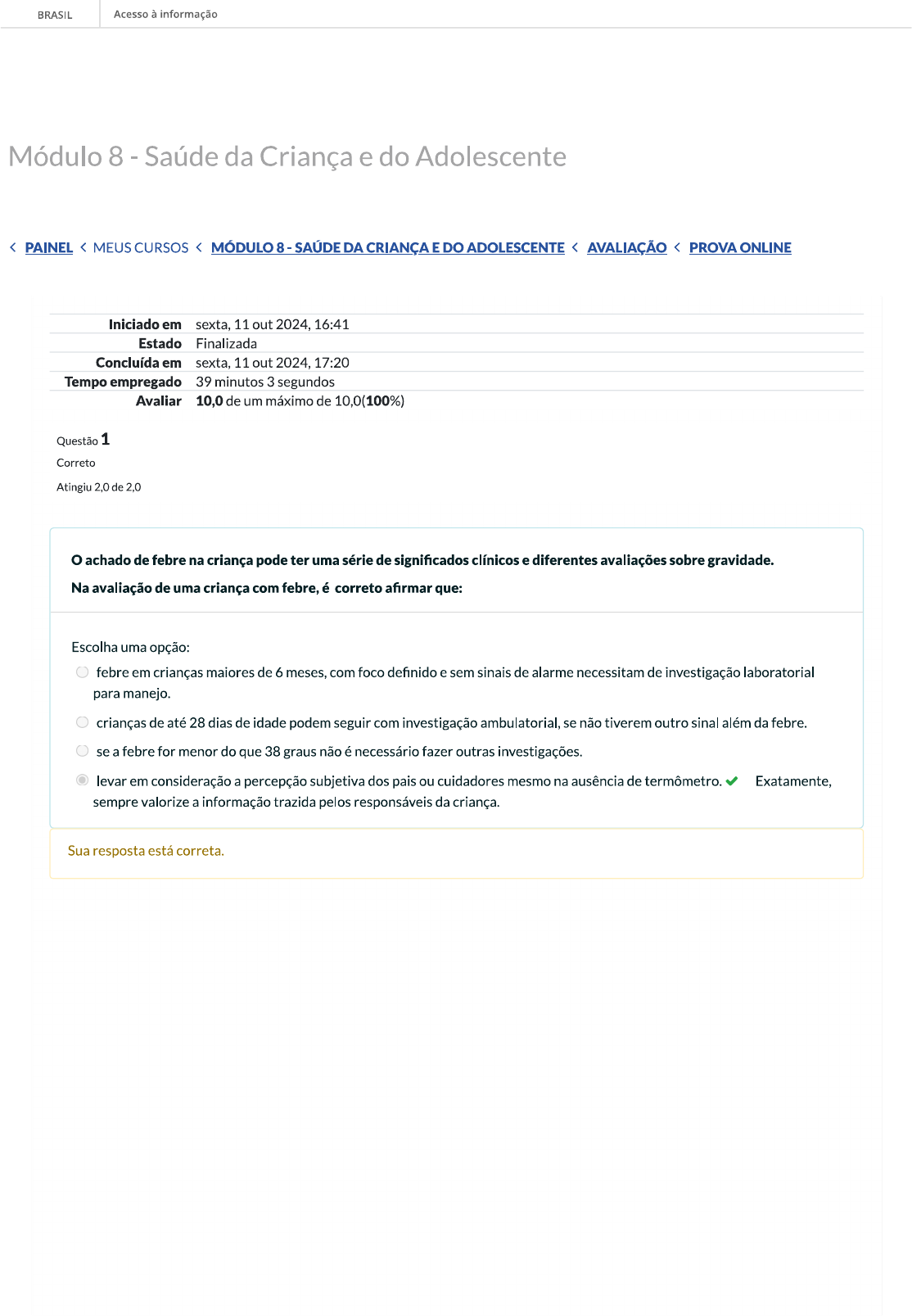 <p>BRASIL Acesso à informação Módulo 8 Saúde da Criança e do Adolescente</p><p>BRASIL Acesso à informação Correto Atingiu 2,0 de 2,0 Considere que você está acompanhando uma criança de 5 anos de idade cujos pais trouxeram queixa de enurese iniciada há cerca de 1 mês. Avaliando a abordagem dessa queixa, está correto inferir que: Escolha uma opção: o primeiro passo é iniciar tratamento com Desmopressina 200mcg, até a dose de 400mcg para evitar novos episódios de enurese. é importante descartar a possibilidade de doenças sistêmicas antes de instituir um tratamento específico. É isso mesmo, descartar causas sistêmicas direciona os possíveis manejos. o sistema de recompensa é uma estratégia que auxilia o manejo e deve vir com alguma penalidade para que a criança aprenda sobre o controle do o uso de alarmes/ despertadores para acordar a criança à noite para urinar é uma estratégia que deve ser usada se o tratamento farmacológico falhar. Sua resposta está correta. Questão 3 Correto Atingiu 2,0 de 2,0 Leia o texto a seguir: A dermatite de fraldas é um problema comum para crianças de um ano de idade ou mais, em uso de causada pelo contato das eliminações (urina e fezes) com a pele da pelve, períneo e face interna das coxas, bem como com o uso de lenços umedecidos ou outros produtos irritativos. Costuma a área de dobras, a não ser que esteja associada à candidíase. A pele apresenta-se eritematosa, brilhante, com descamação. o tratamento consiste em Escolha uma opção: fraldas - preservar - orientar sobre uso de fraldas bem absorventes, trocas frequentes e proteção da pele com cremes de barreira. Muito bem, essa é a sequência. fraldas - acometer - orientar sobre uso de fraldas bem absorventes, trocas frequentes e proteção da pele com cremes de barreira. fraldas preservar uso de pomada de corticoide local, associada a nistatina e antibiótico tópicos. roupas íntimas, em vez de fraldas - preservar uso de pomada de corticóide local, associada a nistatina e antibiótico Sua resposta está correta.</p><p>BRASIL Acesso à informação Correto Atingiu 2,0 de 2,0 A diarreia aguda persiste como um dos principais agravos em crianças no Brasil, podendo resultar em internações e até mesmo mortes. Nesse contexto, há indicações para o uso de antibióticos em crianças com quadro de diarreia aguda. Tais indicações são quadro de diarreia: Escolha uma opção: aquosa, com a presença de febre e dor abdominal sem sinais de defesa. aguda com presença de sangue e muco, sugerindo origem infecciosa por Shigella. Muito bem, essa é uma indicação. aguda em criança que teve contato com alimentos contaminados na creche. com muco, sinais de desidratação leves com presença de vômitos. Sua resposta está correta. Questão 5 Correto Atingiu 2,0 de 2,0 Na amamentação, problemas e dificuldades na pega levam a diminuição na produção de leite, machucam os mamilos e o ganho de peso do bebê fica abaixo do esperado. Para uma amamentação eficaz é importante que você avalie com a mãe a pega da boca da criança na mama e o posicionamento do bebê no colo da nutriz. Nessa perspectiva, analise as afirmações a seguir. 1 A sucção é um ato reflexo do recém-nascido, porém sua boca deve ter uma abertura que consiga abocanhar o mamilo e a aréola formando um lacre e garantindo formação do vácuo. 2 - A língua da criança auxilia na retirada do leite. 3 - o rosto do bebê deve ficar de frente para a mama e o seu corpo próximo ao corpo da mãe. 4 A cabeça e o tronco do bebê precisam estar alinhados, e o bebê bem apoiado. 5 Mães e bebês podem adotar outras posições em que ambos se sintam confortáveis, e que inclusive possam contribuir para maior adesão ao aleitamento. Está correto o que é dito em: Escolha uma opção: 2, 4 e 5, apenas. 1 e 4, apenas. Muito bem, todas estão corretas. 1, 2 e 3, apenas. Sua resposta está correta. Fórum avaliativo Seguir para...</p><p>BRASIL Acesso à informação</p>