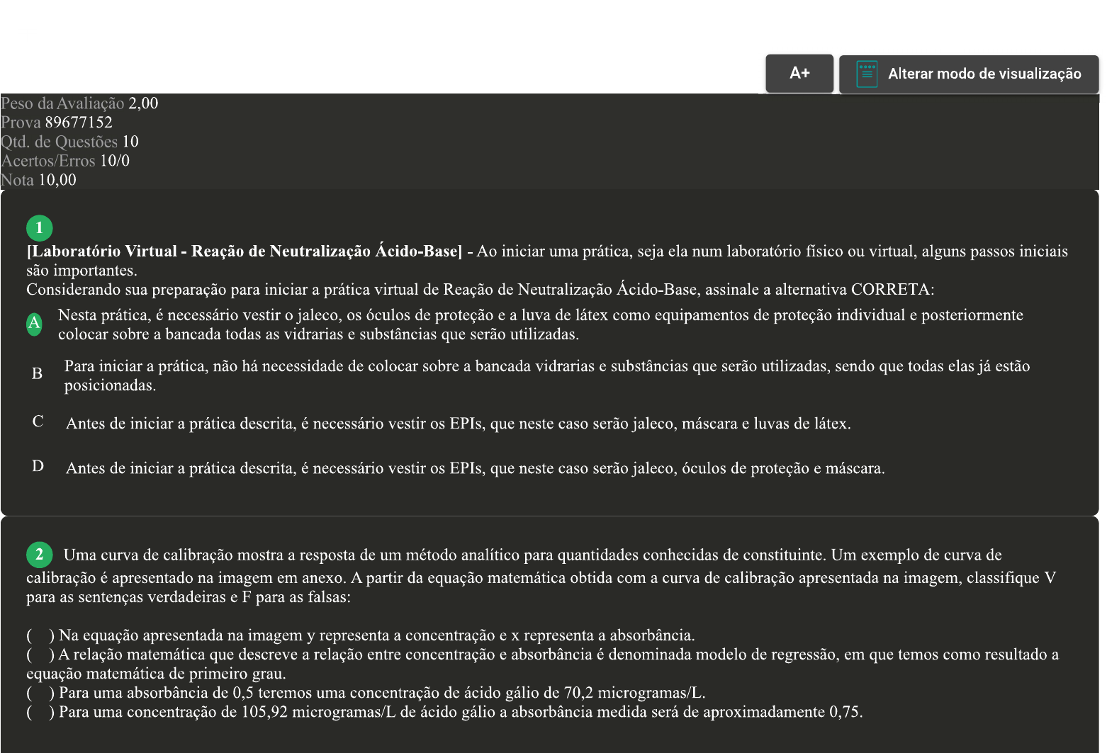 <p>A+ Alterar modo de visualização Peso da Avaliação 2,00 Prova 89677152 Qtd. de Questões 10 Acertos/Erros 10/0 Nota 10,00 1 Virtual Reação de Neutralização Ao iniciar uma prática, seja ela num laboratório físico ou virtual, alguns passos iniciais são importantes. Considerando sua preparação para iniciar a prática virtual de Reação de Neutralização assinale a alternativa CORRETA: Nesta prática, é necessário vestir jaleco, os óculos de proteção e a luva de látex como equipamentos de proteção individual e posteriormente colocar sobre a bancada todas as vidrarias e substâncias que serão utilizadas. B Para iniciar a prática, não há necessidade de colocar sobre a bancada vidrarias e substâncias que serão utilizadas, sendo que todas elas já estão posicionadas. C Antes de iniciar a prática descrita, é necessário vestir os EPIs, que neste caso serão jaleco, máscara e luvas de látex. D Antes de iniciar a prática descrita, é necessário vestir os EPIs, que neste caso serão jaleco, óculos de proteção e máscara. 2 Uma curva de calibração mostra a resposta de um método analítico para quantidades conhecidas de constituinte. Um exemplo de curva de calibração é apresentado na imagem em anexo. A partir da equação matemática obtida com a curva de calibração apresentada na imagem, classifique V para as sentenças verdadeiras e F para as falsas: ( ) Na equação apresentada na imagem y representa a concentração e X representa a absorbância. ( ) A relação matemática que descreve a relação entre concentração e absorbância é denominada modelo de regressão, em que temos como resultado a equação matemática de primeiro grau. ) Para uma absorbância de 0,5 teremos uma concentração de ácido gálio de 70,2 microgramas/L. ( ) Para uma concentração de 105,92 microgramas/L de ácido gálio a absorbância medida será de aproximadamente 0,75.</p><p>CURVA DE CALIBRAÇÃO DO PADRÃO ÁCIDO GÁLICO to 40 70 CONCENTRAÇÃO Fonte: Joyce Kimberlly Santos da Efeito do Processamento e Armazenamento nos Compostos Fenólicos Presentes no Assinale a alternativa que apresenta a sequência CORRETA: Dunal) 2015. A F-F-F-V B F-V-V-V D 3 A calibração de vidrarias de um laboratório é um passo de grande importância, uma vez que influencia diretamente os resultados de precisão e exatidão de um método analítico. O processo de calibração de vidrarias envolve a medida do volume transferido/contido em uma determinada vidraria (volumétrica ou graduada) para cálculo do volume exato que este material transfere ou contém. Considerando os processos para calibração de um balão volumétrico e suas etapas, ordene os itens a seguir: I- Em posse dos valores de densidade e de massa de água, determina-se volume através da fórmula da densidade. Enche-se balão volumétrico com água destilada (anota-se a temperatura em que se encontra a água destilada) até quase atingir o menisco. Completar volume e aferir menisco do balão volumétrico. Anotar a massa correspondente à massa da vidraria com água. Estando balão limpo, seco e vazio, colocamos a tampa nele. Sem tocá-lo diretamente com as mãos, coloque-o sobre a balança analítica previamente tarada. Anotar a massa da vidraria vazia. IV- Calcula-se a massa de água contida na vidraria. V- Descobre-se valor da densidade da água para a temperatura na qual ela se encontra (valor tabelado).</p><p>Assinale a alternativa CORRETA: FONTE: GUARDA, Ananda Fagundes. Química Analítica Quantitativa. Indaial: Uniasselvi, 2019. A II V. B V II I IV III. C I. D I - V III - II IV. 4 O tratamento estatístico dos dados é essencial numa análise quantitativa, sendo assim é importante considerarmos uso de notação científica, visto que muitas vezes trabalhamos com números extremamente pequenos. Com base na notação científica, analise as sentenças a seguir: I- Notação é uma maneira de escrevermos números muito grandes ou muito pequenos de uma maneira mais simples. II- Na notação científica, escrevemos um número simples, chamado de mantissa, multiplicado por uma potência de 10, com um determinado expoente. III- O número 0,000563 representado corretamente na forma de notação científica é 5,63.10^-4. IV- O número 7890000 representado corretamente na forma de notação científica é 7,89.10^-2. Assinale a alternativa CORRETA: A Somente a sentença II está correta. B Somente a sentença IV está correta. C As sentenças I e IV estão corretas. D As sentenças I, II e III estão corretas. 5 A Química Analítica Quantitativa tem por objetivo a determinação da quantidade de um ou mais componentes de uma amostra. Essa determinação pode ser crucial em certas situações, como, por exemplo, ao se analisar a presença e a quantidade de metais pesados em Considerando a importância das determinações em analítica, classifique V para as sentenças verdadeiras e F para as falsas:</p><p>( ) Os métodos clássicos de análise foram as primeiras técnicas de análise quantitativa. ) O uso de métodos clássicos de análise envolve uso de reagentes de alto custo. ( ) Os métodos clássicos envolvem procedimentos manuais. ( ) Uma das desvantagens do uso dos métodos clássicos é sua baixa sensibilidade na determinação do analito. Assinale a alternativa que apresenta a sequência CORRETA: A B C F-V-F-V D V-F-V-V 6 "A química analítica é uma ciência de medição que consiste em um conjunto de ideias e métodos poderosos que são úteis em todos os campos da ciência e medicina" (SKOOG et al., s.p.). Ao considerar funcionamento das análises realizadas por esta área é importante que tenhamos conhecimentos de alguns conceitos. Com base nesses conceitos, analise as sentenças a seguir: I- O analito é a espécie química que está presente na amostra, qual se deseja qualificar (conhecer a identidade) e quantificar (conhecer a quantidade). II- A matriz é a porção representativa retirada de um todo. 