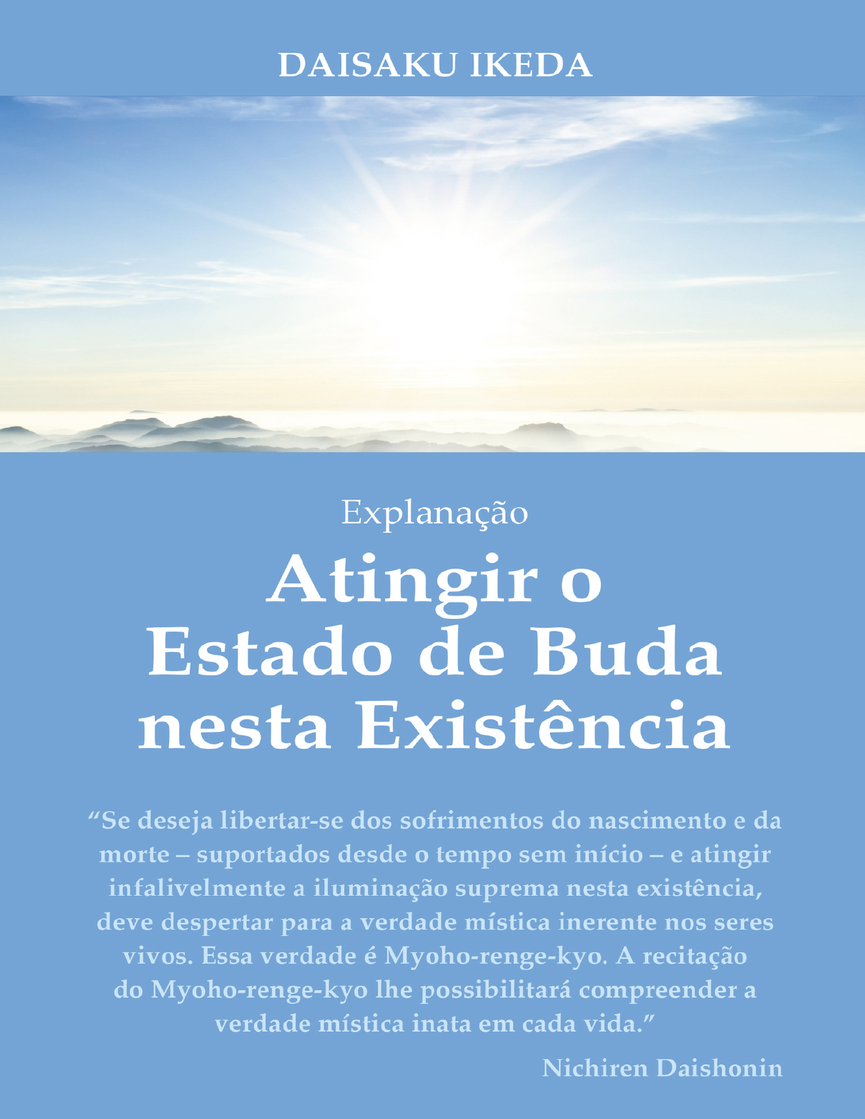<p>ATINGIR O ESTADO DE BUDA</p><p>NESTA EXISTÊNCIA</p><p>DAISAKU IKEDA</p><p>Editora Brasil Seikyo</p><p>São Paulo – Agosto de 2021</p><p>Copyright © S oka Gakkai</p><p>Título original: Issho Jobutsu Sho Kogi</p><p>Departamento de Livros</p><p>Editora Brasil Seikyo</p><p>Foto da capa: Getty Images</p><p>1a edição</p><p>Todos os direitos desta edição reservados à</p><p>Editora Brasil S eikyo Ltda.</p><p>Rua Tamandaré, 1.040, Liberdade, São Paulo, SP</p><p>CEP 01525-000 – Tel. (11) 3349-1900</p><p>www.brasilseikyo.com.br</p><p>publicacao@brseikyo.com.br</p><p>SUMÁRIO</p><p>Escrito de Nichiren Daishonin</p><p>Atingir o Estado de Buda nesta Existência</p><p>Parte 1</p><p>O atingir do estado de buda nesta existência</p><p>Parte 2</p><p>O significado da recitação do daimoku</p><p>Parte 3</p><p>A Lei Mística existe dentro do coração</p><p>Parte 4</p><p>Mudança em nossa atitude básica</p><p>Parte 5</p><p>Recitar daimoku com vigor e coragem</p><p>Parte 6</p><p>Natureza mística da vida</p><p>Parte 7</p><p>Fé para atingir o estado de buda nesta existência</p><p>Glossário</p><p>Abreviaturas utilizadas nesta obra:</p><p>CEND Coletânea dos Escritos de Nichiren Daishonin, v. I (São Paulo:</p><p>Editora Brasil Seikyo, 2014); v. II (2017).</p><p>LSOC The Lotus Sutra and Its Opening and Closing Sutras</p><p>[O Sutra do Lótus e seus Sutras de Abertura e Conclusão],</p><p>tradução de Burton Watson (Tóquio: Soka Gakkai, 2009).</p><p>OTT The Record of the Orally Transmitted Teachings [Registro</p><p>dos Ensinamentos Transmitidos Oralmente], tradução</p><p>de Burton Watson (Tóquio: Soka Gakkai, 2004).</p><p>ESCRITO DE NICHIREN DAISHONIN</p><p>ATINGIR O ESTADO DE BUDA NESTA</p><p>EXISTÊNCIA</p><p>(CEND, v. I, p. 3-5)</p><p>Se deseja libertar-se dos sofrimentos do nascimento e da morte – suportados desde o tempo</p><p>sem início – e atingir infalivelmente a iluminação suprema nesta existência, deve despertar para a</p><p>verdade mística inerente nos seres vivos. Essa verdade é Myoho-renge-kyo. A recitação do Myoho-</p><p>renge-kyo lhe possibilitará compreender a verdade mística inata em cada vida.</p><p>O Sutra do Lótus é o rei dos sutras – verdadeiro e correto tanto nas palavras como nos</p><p>princípios. Suas palavras são a realidade fundamental e essa realidade é a Lei Mística (myoho). É</p><p>chamada de Lei Mística porque revela o princípio da relação mútua e inclusiva de um único</p><p>momento da vida e todos os fenômenos. Eis por que este sutra constitui a sabedoria de todos os</p><p>budas.</p><p>A vida em cada momento abarca o corpo, a mente, o sujeito e o meio ambiente dos seres</p><p>sensíveis nos dez mundos. Também abrange os seres insensíveis nos três mil mundos, incluindo as</p><p>plantas, o céu, a terra e até as minúsculas partículas de pó. A vida em cada momento permeia todos</p><p>os fenômenos e é revelada neles. Despertar para este princípio corresponde à relação mútua e</p><p>inclusiva de um único momento da vida e todos os fenômenos. Contudo, mesmo que recite e acredite</p><p>no Myoho-renge-kyo, se pensa que a Lei existe fora de seu coração, o senhor não está abraçando a</p><p>Lei Mística, mas um ensinamento inferior. “Ensinamento inferior” refere-se a outros preceitos além</p><p>deste sutra [Sutra do Lótus], que são meios e provisórios. Nenhum desses meios ou ensinamentos</p><p>provisórios conduz diretamente à iluminação e, sem um caminho direto à iluminação, o senhor não</p><p>conseguirá atingir o estado de buda, mesmo que pratique existência após existência por incontáveis</p><p>kalpa. Dessa forma, atingir o estado de buda nesta existência seria impossível. Assim, quando o</p><p>senhor recita myoho e pronuncia renge,[1] deve ter a profunda fé de que o Myoho-renge-kyo é sua</p><p>própria vida.</p><p>Jamais pense que os oitenta mil ensinamentos sagrados expostos pelo buda Shakyamuni durante</p><p>toda a existência dele ou que os budas e bodisatvas das dez direções e das três existências se</p><p>encontram em algum lugar fora do senhor. A prática dos ensinamentos budistas não o libertará do</p><p>sofrimento de nascimento e morte se não compreender a verdadeira natureza da vida. Se buscar a</p><p>iluminação fora de si, então, mesmo que realize dez mil práticas e dez mil boas ações, tudo será em</p><p>vão. Isso se compara ao caso de um homem pobre que passa dia e noite contando a riqueza do</p><p>vizinho, mas não consegue obter sequer uma ínfima quantia em benefício próprio. É por essa razão</p><p>que a escola Tiantai afirma: “Se não despertar para a própria natureza, não conseguirá erradicar os</p><p>graves crimes de sua vida”.[2] Esta passagem significa que, se as pessoas não despertarem para a</p><p>natureza da própria vida, a prática será algo austero, angustiante e sem fim. Portanto, esse tipo de</p><p>pessoa, mesmo que estude o budismo, é considerada não budista. Em Grande Concentração e</p><p>Discernimento, Tiantai declara que, embora essas pessoas estudem o budismo, suas concepções</p><p>não diferem daquelas não budistas.</p><p>Se o senhor invocar o nome do Buda,[3] recitar o sutra ou simplesmente oferecer flores e</p><p>incenso, todos esses atos virtuosos trarão benefícios e fincarão raízes do bem em sua vida. Deve se</p><p>empenhar na fé com essa convicção. No Sutra Vimalakirti consta que, ao buscarmos a condição de</p><p>absoluta liberdade dos budas na mente dos mortais comuns, descobrimos que eles são entidades da</p><p>iluminação e que os sofrimentos de nascimento e morte são nirvana. Consta também que, se a</p><p>mente das pessoas é impura, sua terra é igualmente impura. Mas, se sua mente é pura, assim é sua</p><p>terra. Portanto, não há duas terras – pura e impura. A diferença reside apenas no bem e no mal da</p><p>própria mente.</p><p>Isso se aplica tanto aos budas como aos mortais comuns. Quando 