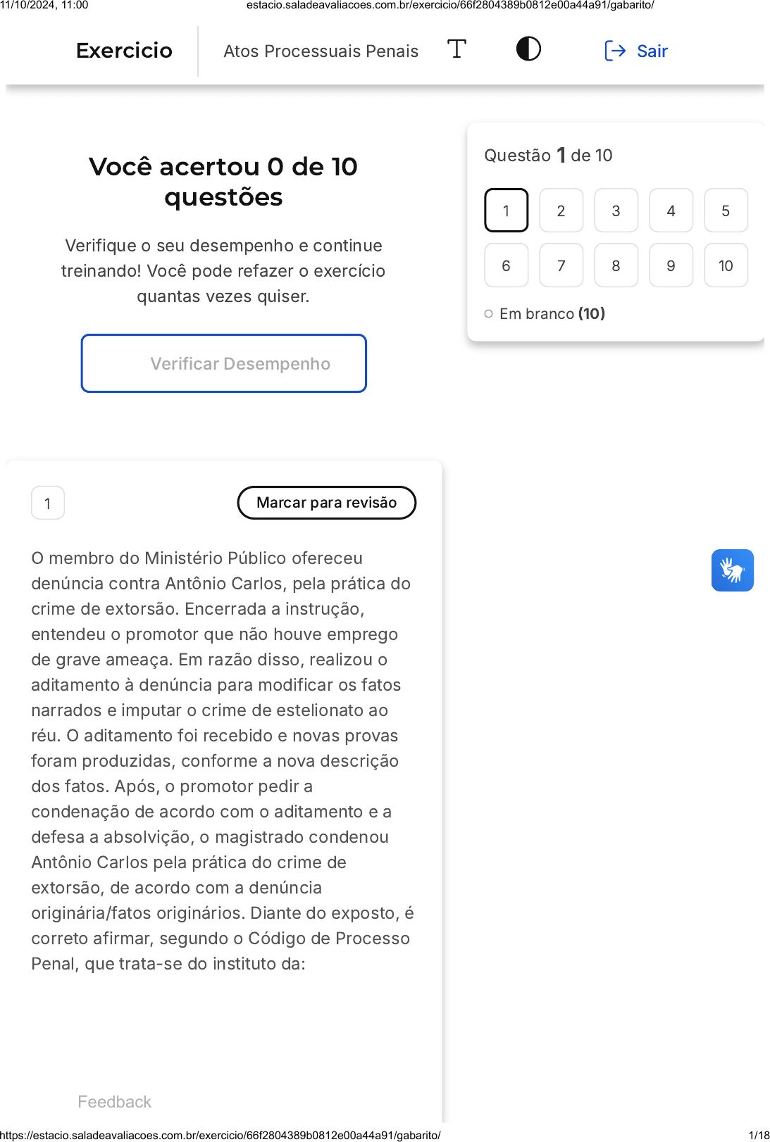 <p>Você acertou 0 de 10</p><p>questões</p><p>Verifique o seu desempenho e continue</p><p>treinando! Você pode refazer o exercício</p><p>quantas vezes quiser.</p><p>Verificar Desempenho</p><p>1 Marcar para revisão</p><p>O membro do Ministério Público ofereceu</p><p>denúncia contra Antônio Carlos, pela prática do</p><p>crime de extorsão. Encerrada a instrução,</p><p>entendeu o promotor que não houve emprego</p><p>de grave ameaça. Em razão disso, realizou o</p><p>aditamento à denúncia para modificar os fatos</p><p>narrados e imputar o crime de estelionato ao</p><p>réu. O aditamento foi recebido e novas provas</p><p>foram produzidas, conforme a nova descrição</p><p>dos fatos. Após, o promotor pedir a</p><p>condenação de acordo com o aditamento e a</p><p>defesa a absolvição, o magistrado condenou</p><p>Antônio Carlos pela prática do crime de</p><p>extorsão, de acordo com a denúncia</p><p>originária/fatos originários. Diante do exposto, é</p><p>correto afirmar, segundo o Código de Processo</p><p>Penal, que trata-se do instituto da:</p><p>Questão 1 de 10</p><p>Em branco �10�</p><p>1 2 3 4 5</p><p>6 7 8 9 10</p><p>Feedback</p><p>Exercicio Atos Processuais Penais Sair</p><p>11/10/2024, 11:00 estacio.saladeavaliacoes.com.br/exercicio/66f2804389b0812e00a44a91/gabarito/</p><p>https://estacio.saladeavaliacoes.com.br/exercicio/66f2804389b0812e00a44a91/gabarito/ 1/18</p><p>A</p><p>B</p><p>C</p><p>D</p><p>E</p><p>Mutatio libelli, não podendo o</p><p>magistrado condenar Antônio Carlos</p><p>pelo crime de extorsão, uma vez que</p><p>são garantias do réu: ter a certeza de</p><p>que não poderá ser condenado sem</p><p>que tenha tido oportunidade de</p><p>defender-se da imputação e que será</p><p>julgado apenas nos limites do pedido</p><p>do autor da ação penal.</p><p>Mutatio libelli, podendo o magistrado</p><p>condenar Antônio Carlos pelo que</p><p>quiser.</p><p>Mutatio libelli, podendo o magistrado</p><p>condenar Antônio Carlos pelo crime</p><p>de extorsão qualificada.</p><p>Emendatio libelli, não podendo o</p><p>magistrado condenar Antônio Carlos</p><p>pelo crime de extorsão, por ser mais</p><p>grave.</p><p>Emendatio libelli, podendo o</p><p>magistrado, conforme o art. 383 do</p><p>CPP, condenar Antônio Carlos pelo</p><p>crime de extorsão, em razão da</p><p>máxima: "dá-me os fatos que te darei</p><p>o direito".</p><p>Questão não respondida</p><p>Opa! A alternativa correta é a letra</p><p>A. Confira o gabarito comentado!</p><p>Gabarito Comentado</p><p>Na situação apresentada, ocorreu o</p><p>instituto da Mutatio libelli, que é realizada</p><p>11/10/2024, 11:00 estacio.saladeavaliacoes.com.br/exercicio/66f2804389b0812e00a44a91/gabarito/</p><p>https://estacio.saladeavaliacoes.com.br/exercicio/66f2804389b0812e00a44a91/gabarito/ 2/18</p><p>A</p><p>B</p><p>pelo Ministério Público e está prevista no</p><p>art. 384 do Código de Processo Penal</p><p>�CPP�. Este artigo estabelece que, após o</p><p>encerramento da instrução probatória, se o</p><p>Ministério Público entender cabível uma</p><p>nova definição jurídica do fato, em</p><p>consequência de prova existente nos autos</p><p>de elemento ou circunstância da infração</p><p>penal não contida na acusação, deverá</p><p>aditar a denúncia ou queixa. Nesse caso, o</p><p>juiz ficará adstrito aos termos do</p><p>aditamento, conforme o parágrafo 4º do</p><p>mesmo artigo. Portanto, o magistrado não</p><p>poderia condenar Antônio Carlos pelo</p><p>crime de extorsão, uma vez que são</p><p>garantias do réu: ter a certeza de que não</p><p>poderá ser condenado sem que tenha tido</p><p>oportunidade de defender-se da imputação</p><p>e que será julgado apenas nos limites do</p><p>pedido do autor da ação penal.</p><p>2 Marcar para revisão</p><p>�CESPE�CEBRASP/2022 � Adaptada) Imagine a</p><p>situação na qual o acusado foi citado</p><p>pessoalmente na ação penal, mas não</p><p>compareceu em juízo, nem tampouco</p><p>apresentou justificativa. Nesse caso,</p><p>O processo seguirá sem a presença</p><p>dele.</p><p>Ele será citado por edital, pelo prazo</p><p>de 15 dias.</p><p>11/10/2024, 11:00 estacio.saladeavaliacoes.com.br/exercicio/66f2804389b0812e00a44a91/gabarito/</p><p>https://estacio.saladeavaliacoes.com.br/exercicio/66f2804389b0812e00a44a91/gabarito/ 3/18</p><p>C</p><p>D</p><p>E</p><p>O processo ficará suspenso por prazo</p><p>indeterminado.</p><p>Será determinada a produção</p><p>antecipada das provas.</p><p>O prazo prescricional será</p><p>interrompido.</p><p>Questão não respondida</p><p>Opa! A alternativa correta é a letra</p><p>A. Confira o gabarito comentado!</p><p>Gabarito Comentado</p><p>De acordo com o artigo 367 do Código de</p><p>Processo Penal �CPP�, o processo seguirá</p><p>sem a presença do acusado que, após ser</p><p>citado ou intimado pessoalmente para</p><p>qualquer ato, deixar de comparecer sem</p><p>motivo justificado, ou, no caso de mudança</p><p>de residência, não comunicar o novo</p><p>endereço ao juízo. Portanto, a alternativa</p><p>correta é a A� "O processo seguirá sem a</p><p>presença dele".</p><p>3 Marcar para revisão</p><p>O princípio da congruência, também conhecido</p><p>por princípio da correlação ou adstrição, possui</p><p>relação direta com o princípio do contraditório.</p><p>Sobre o tema, marque a opção correta.</p><p>11/10/2024, 11:00 estacio.saladeavaliacoes.com.br/exercicio/66f2804389b0812e00a44a91/gabarito/</p><p>https://estacio.saladeavaliacoes.com.br/exercicio/66f2804389b0812e00a44a91/gabarito/ 4/18</p><p>A</p><p>B</p><p>C</p><p>D</p><p>E</p><p>A emendatio libelli não pode ser</p><p>conhecida pelo juiz para adequar o</p><p>pedido à classificação do delito.</p><p>O juiz do feito pode realizar, de ofício,</p><p>a mutatio libelli se for colhida prova</p><p>sobre elementar não contida no</p><p>pedido.</p><p>É possível que o próprio juiz, de ofício,</p><p>adite a denúncia