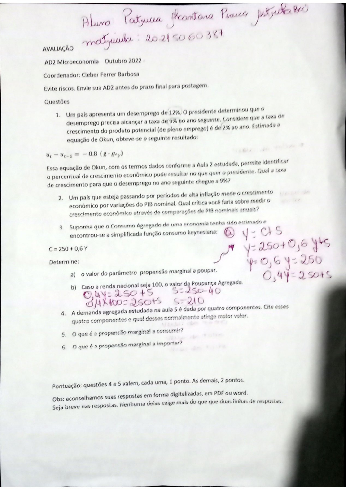 <p>: AVALIAÇÃO AD2 Microeconomia Outubro 2022 Cleber Ferrer Barbosa Evite Envie sua AD2 antes do prazo final para Questões 1. Um país apresenta um desemprego de presidente determinou que desemprego precisa alcançar a taxa de 9% no ano seguinte. Considere que a taxa de crescimento do produto potencial (de pleno emprego) é de 2% Estimada a equação de Okun, obteve-se seguinte resultado: gay) Essa equação de Okun, com os termos dados conforme a Aula 2 permite identificar de crescimento econômico pode resultar no que quer de crescimento para que desemprego no ano seguinte chegue a 9%? 2. Um país que esteja passando por de alta inflação mede o crescimento econômico por variações do PIB nominal. Qual crítica você faria sobre medir crescimento econômico através de comparações de PIB anuals? 3 Suponha que Consumo Agregado de uma economia tenha estimado encontrou-se a simplificada função consumo C = 250 + 0,6 Y Determine: 0,6y=250 a) valor do parâmetro propensão marginal a b) Caso a renda nacional seja 100, valor da Poupança Agregada. S=210 4. A demanda agregada na aula 5 é dada por quatro Cite esses quatro componentes e qual desses normalmente atinge 5. que é a propensão marginal a consumir? 6 que é a propensão marginal a importar? Pontuação: questões 4 e 5 valem, cada uma, 1 ponto. As demais, 2 Obs: aconselhamos suas respostas em forma digitalizadas, em PDF ou word. Seja breve Nenhuma exige mais do que que de</p><p>ut- (g-gry) 0,016 + 0,016 g=5,75% 2 : Resp: Na Realidade, ataxa de i pode OPIB, Pois e a dos Bens l servi Pois do PIB Tende Quest - Consumo, gastos do governo as liquidas Resp: Quando se no Consumo de Quando um em unda Questao- 6: Resp: a tendencia uma Economia Tem para importan a medida do que OPIB</p>