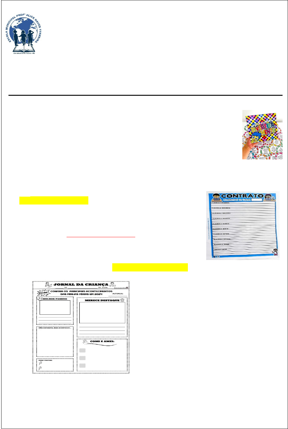 <p>ESCOLA MUNICIPAL PROFESSORA ALICE NAVES FERREIRA</p><p>EDUCAÇÃO INFANTIL E ENSINO FUNDAMENTAL (ANOS INICIAIS)</p><p>AUTORIZADA PELA PORTARIA Nº 121/2007</p><p>Parecer 1245 de 21/12/2006 – CEE/MG</p><p>Plano de Aula – Semanal</p><p>05/08/2024 à 09/08/2024</p><p>Professora: Roberta Aparecida Hipólito Trovó Turma: 5°ano 4</p><p>Coordenadora: Marise de Pádua Arantes</p><p>SEGUNDA-FEIRA – 05/08/2024</p><p>Entrada;</p><p>Calendário;</p><p>Leitura deleite – Sugestão (caixa de livro)</p><p>Módulo I: Iniciar a aula com uma dinâmica do filme divertidamente.</p><p>Propor uma roda de conversa e explorar a dinâmica.</p><p>I – Língua Portuguesa (Gênero textual contrato) Construir um contrato sobre as regras da sala, combinados e realizar as assinaturas.</p><p>· Sugestão: Momento dinâmico e deixar que cada aluno escreva um pouquinho no cartaz.</p><p>· FIXAR NA SALA.</p><p>Módulo ll: EDUCAÇÃO FÍSICA</p><p>Módulo III – Língua Portuguesa:</p><p>· Realizar a atividade do JORNAL DA CRIANÇA após escrever 2° semestre e colar a atividade no caderno.</p><p>RECREIO (9:15 às 9:30)</p><p>Módulo IV e V – Matemática e Ciências:</p><p>Passar no quadro: Escrever a data e 2° semestre.</p><p>Aproveitar o momento e observar as crianças.</p><p>Ciências: Observar se foi trabalhado o sistema reprodutor, conforme o plano anterior.</p><p>Dever 05/08/24</p><p>Passar no quadro</p><p>Estudar e copiar as tabuadas do 2,3,4,5,6,7,8,9</p><p>TERÇA – FEIRA 06/08/2024</p><p>Módulo I: AULA DE MÚSICA</p><p>Entrada (passar a rotina no quadro)</p><p>- Leitura deleite – Sugestão (Tudo bem ser diferente)</p><p>Módulo II: – Língua Portuguesa</p><p>Língua portuguesa (leitura e oralidade leitura e interpretação)</p><p>Sugestão da Marise no grupo.</p><p>Módulo III: AULA DE INFORMÁTICA</p><p>- RECREIO (9:30 às 9:45)</p><p>Módulo IV – História - Geografia</p><p>Livro Pitanguá Mais: O tempo- páginas – 69, 70, 71.</p><p>Livro: Pitanguá Mais: Formação e crescimento das cidades- páginas 52, 53 e 54.</p><p>Observar se foi trabalhado, conforme o plano anterior.</p><p>Módulo V: Matemática</p><p>Passar no quadro</p><p>Pratique as divisões efetuando os cálculos abaixo:</p><p>a) 197:11= d) 6426:3=</p><p>b) 225:12= e) 9427:4=</p><p>c)8794:2= f) 84242:7=</p><p>Dever 09/06/24 (sistema de numeração decimal)</p><p>1)</p><p>2) Escolha 3 números e escreva por extenso.</p><p>QUARTA-FEIRA 07/08/2024</p><p>Módulo l: EDUCAÇÃO FÍSICA</p><p>Entrada;</p><p>• Entrada (passar a rotina do dia no quadro)</p><p>• Calendário</p><p>Leitura deleite – Olimpíadas</p><p>Módulo II Língua Portuguesa (leitura, oralidade e interpretação).</p><p>Passar no quadro</p><p>Observar se foi trabalhado a ORTOGRAFIA DO O/U do plano anterior.</p><p>(caso não tenha sido, realizar a troca)</p><p>· Módulo III- Geografia / Português</p><p>Livro: Pitanguá Mais: Formação e crescimento das cidades páginas – 52, 53 e 54.</p><p>Livro de língua portuguesa - A conquista- Por que a voz dos adolescentes muda? páginas 199, 200 e 201.</p><p>Observar se foi trabalhado, conforme o plano anterior</p><p>-Módulo IV-V – Matemática / Matemática</p><p>· RECREIO (9h ás 9:15)</p><p>Passar no quadro</p><p>As quatro operações:</p><p>Resolva as operações.</p><p>a) 32.421 + 7.330 + 225 = b) 321.120 + 112.421 =</p><p>c) 624.421 – 135.245 = d) 25.689 -12.215 =</p><p>e) 545 X 36 = f) 478 X 57 =</p><p>g) 4.864: 2 = h) 1236: 12 =</p><p>Dever 07/08/2024</p><p>1- Ortografia- Encontre as palavras incorretas e corrija-as, reescrevendo:</p><p>2- Escreva frases.</p><p>QUINTA – FEIRA 06/08/2024</p><p>- Entrada (passar a rotina no quadro)</p><p>- Calendário</p><p>- Leitura deleite – Símbolos Olímpicos</p><p>Módulo I: – Matemática( situações problemas e operações e gráfico).</p><p>Passar no quadro</p><p>1</p><p>Realizar as atividades sobre o gráfico:</p><p>Aproveitar o momento para observar como estão na interpretação de gráficos.</p><p>Livro Aprender juntos- Frações- páginas: 132,133,134 e 135</p><p>Módulo ll: AULA DE BIBLIOTECA</p><p>Módulo lll: - Geografia</p><p>Livro: Pitanguá Mais:– Formação e crescimento das cidades- página - 64, 65, 66, 67.</p><p>· RECREIO (9h ás 9:15)</p><p>Módulo lV: História</p><p>História - Livro Pitanguá Mais: Diferentes tipos de calendário- páginas – 72, 73, 74, 75, 76.</p><p>Observar se foi trabalhado, conforme o</p><p>plano anterior</p><p>Dever 08/08/2024</p><p>SEXTA-FEIRA 09/08/2024</p><p>Entrada (passar a rotina no quadro)</p><p>· Calendário</p><p>· Leitura deleite (Livro da caixa)</p><p>Módulo I: Língua Portuguesa</p><p>Ortografia u/o final da palavra (passar no quadro)</p><p>DITADO</p><p>Marcos e seus animais</p><p>Marcos é um garoto que gosta de animais.</p><p>Ele encontrou um esqueleto de um urubu em uma tribo.</p><p>O canguru foi até o bebedouro e encontrou o tatu comendo caju.</p><p>Marcos pegou sua moto no domingo e foi para Aracaju ver o touro Ferdinando. Ele é mesmo um garoto incrível</p><p>Módulo ll: Produção de texto</p><p>Módulo lll: Matemática( álgebra e números)</p><p>Livro: Aprender Juntos – Situações com adição e subtração –páginas 37 e 38. Passar no quadro</p><p>1- Arme e efetue as operações:</p><p>a) 2346 x 5 b) 6543 x 9 c) 2345 x 23 d) 14016: 24 d) 6832 :3 e) 6909 :8</p><p>- RECREIO 9H15 ÀS 9H30</p><p>Módulo lV: História</p><p>Livro Pitanguá Mais: diferentes tipos de calendários- página – 72, 73,74, 75, 76.</p><p>Módulo V: Ensino Religioso</p><p>Passar no quadro</p><p>• Leia o acróstico e responda as perguntas: Todo tempo é tempo e solidariedade:</p><p>image5.jpeg</p><p>image6.jpeg</p><p>image7.jpeg</p><p>image8.jpeg</p><p>image9.jpeg</p><p>image10.jpeg</p><p>image11.jpeg</p><p>image12.jpeg</p><p>image13.jpeg</p><p>image14.jpeg</p><p>image15.jpeg</p><p>image16.jpeg</p><p>image17.jpeg</p><p>image18.jpeg</p><p>image19.jpeg</p><p>image20.jpeg</p><p>image21.jpeg</p><p>image22.jp