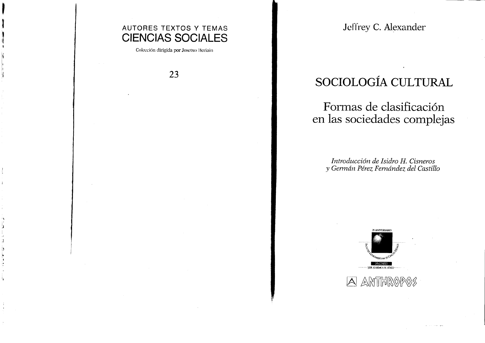 <p>AUTORES TEXTOS Y TEMAS</p><p>CIENCIAS SOCIALES</p><p>Colccción dirigida por Joscl.xo Ilcriair-r</p><p>23</p><p>Jcf'ft^ey C. Alexander</p><p>SOCIOLOGÍA CULTURAL</p><p>Formas de clasificación</p><p>en las sociedades complejas</p><p>Introducción de Isidro H. Cisneros</p><p>y Germán Pérez Fernández de| Castillo</p><p>.m</p><p>reffi6r</p><p>. - !ü^ürÍM(^{x,\lÉxro.. ..</p><p>A ANTHROPE'</p><p>!</p><p>i</p><p>I</p><p>i</p><p>!</p><p>!</p><p>I</p><p>Sociología cultural : Formas de clasificaclón t,¡¡ lns sociedades complejas /</p><p>Jeffrey C. Alexander; introducción de Isidro H. Clsncros v 6ennán Pérez</p><p>Femández del Castillo. - Rubí (Barcelona) : Anthropos lllitolinl ; México :</p><p>FLACSO,2OOO</p><p>XI\I + 271p. ;20 cm. - (Autores, Textos y Temas. Clcnclus Soci¡les ;23)</p><p>ISBN 84-7ó58-571 -3</p><p>l. Sociología cultural 2. Cienciro Sociales - Metodología 3. Tr:rrlilirirr</p><p>dwkheinriana 4.Srciedad: formasdeclasifieción 5.Patronesculttu:rh.s l.(lisncros,</p><p>I.H., int. II. Pérez Femández del Castillo, G., int. IU. FLACSO (Méxiqr) lV. l ltrlo</p><p>V. Colemión</p><p>316.7</p><p>'"4,)</p><p>L</p><p>¡</p><p>tt]</p><p>()t</p><p>[,'f Fir *'&</p><p>A*&</p><p>de,ffisl5</p><p>t</p><p>t</p><p>I</p><p>.i</p><p>l{</p><p>t</p><p>v</p><p>t</p><p>j</p><p>,)</p><p>l</p><p>FACULTAD</p><p>FaLlTlcAs</p><p>Traducción del original inglés: Celso Sánchez Capdequí</p><p>Primera edición: 2000</p><p>O Jeffrey C. Alexander, 2000</p><p>O FLACSO,2OOO</p><p>O de la Introducción Isidro H. Cisneros y Germán Pérez Femández</p><p>del Castillo, 2000</p><p>O Anthropos Editorial, 2000</p><p>Edita: Anthrcpos Editorial. Rubí (Barcelona)</p><p>En coedición con la Facultad Latinoamericana de Ciencias Sociales,</p><p>México D.F-</p><p>ISBN: 84-7658-571-3</p><p>Depósito legal: B. 48.950-1.999</p><p>Diseño, realización y coordinación: Plural, Servicios Editoriales</p><p>(Nariño, S.L.), Rubí. Tel. y fax 93 697 22 96</p><p>Impresión: Edim, S. C. C.L. Badajoz, 1 47. Barcelona</p><p>In-rpreso en España - Printed in Spain</p><p>Tqlos los derechos reseruados. Esta publicrción no puede ser reprcducida, ni en todo ni en</p><p>parte, ni reg¡strada en, o tmnsmitida por, un sistena de recuperación de información, en</p><p>ninguna fb|nra ni por ningúrn medio, wa mecánico, fotoqufmico, elctrónico, magnético, elec-</p><p>lrr)ól)lico, por lotocopia, o ctnlquier otro, sin el pemiso previo por esrito de la editorial.</p><p>CP 1685 i;i</p><p>To María Pía kua,</p><p>lbr all that she has given me</p><p>I</p><p>I</p><p>INTRODUCCIÓN</p><p>La obra que el lector tiene en slrs manos representa una</p><p>contribución fundamental en el desarrollo que la teorfa socioló-</p><p>gica contemporánea ha experimentado dnrante los frltirnos</p><p>años. A esta renovación de los paradigmas constittrtivos de la</p><p>sociologla, Jeffrey C. Alexander ha realizado importantes con-</p><p>tribuciones, reafirmando su presencia indiscutible en el campo</p><p>de las ciencias sociales de nuestro tiempo. Considerado ya</p><p>como un autor clásico y como uno de los padres del neofuncio-</p><p>nalismo en sociología, el autor de esta obra nos propone un</p><p>nuevo acercamiento a uno de los debates centrales en torno a la</p><p>sociología cultural. Una sociologÍa que ubica el significado cul-</p><p>turalmente mediado en el centro de los estudios sociales. posee-</p><p>dor de una formación típica del intelec[ral cosmopolita, Ale-</p><p>xander promueve el diálogo entre el pensamiento social eu-</p><p>ropeo y la tradición sociológica anglosajona en relación con el</p><p>viraje paulatino que la disciplina ha conocido hacia el campo de</p><p>la cultura. Esta sociología ctrltural se articula sobre las estructu-</p><p>r-urs subjetivas de la üda cotidiana. En este sentido, Alexander</p><p>considera necesario evitar el error muy difundido en la ciencia</p><p>social racional, según el cual es posible intentar explicar las ins-</p><p>tancias de subjetividad a través de una ncausalidad objetiva,</p><p>clue estaría reflejando las para la teorfa sociológica a partir</p><p>de un nuevo acercamiento a la temática de la cultura y su rela-</p><p>ción con la üda social. Siguiendo una larga tradición teórica en</p><p>sociología que parte desde É,mile Durkheim hasta Max Weber</p><p>y desde Talcott Parsons hasta Jiirgen Habermas, incorporando</p><p>desde luego una amplísima gama de intelectuales y estudiosos</p><p>de la üda social, Alexander analiza desde una perspectiva inno-</p><p>vadora tanto los nexos entre cultura, significado y strbjetiüdad,</p><p>como los vÍnculos entre valores, códigos y discursos narrativos.</p><p>La perspectiva de Alexander propone la idea de que la dimen-</p><p>sión mística y subjetiva amplía los espacios del pensamiento</p><p>cútico, de la responsabilidad y de la solidaridad. Hablar de so-</p><p>ciología cultural, sostiene Alexander, quiere decir hacer referen-</p><p>cia al programa fuerte de la sociologÍa en un momento como el</p><p>actual caractenzado por el cambio de época. El modo como la</p><p>cultura interviene en los hechos sociales constituye el funda-</p><p>mento no de una hipotética sociología de Ia cultura sino de una</p><p>real y ügorosa sociología cultural. Representante de un tipo de</p><p>intelectual innovador en estos momentos de declive del pensa-</p><p>miento, Jeffrey C. Alexander fonnula preguntas incisivas y plan-</p><p>tea respuestas conüncentes respecto al papel de la cultura y de</p><p>las mediaciones simbólicas en la construcción de sentido en la</p><p>sociología.</p><p>El conjunto de ensayos aquí reunidos tiene un hilo conduc-</p><p>tor representado por el análisis cultural de los fenómenos socia-</p><p>les o, dicho de otro modo, por la relación entre cultura, acción y</p><p>sistema social. Este enfoque constituye el núcleo de la sociolo-</p><p>gía cultural, es decir, de aquella perspectiva analÍtica en donde</p><p>la cult