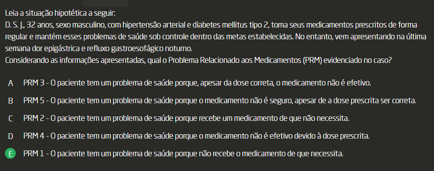 <p>Leia a situação hipotética a seguir: D.S. J., 32 anos, sexo masculino, com hipertensão arterial e diabetes mellitus tipo 2, toma seus medicamentos prescritos de forma regular e mantém esses problemas de saúde sob controle dentro das metas estabelecidas. No entanto, vem apresentando na última semana dor epigástrica e refluxo gastroesofágico noturno. Considerando as informações apresentadas, qual Problema Relacionado aos Medicamentos (PRM) evidenciado no caso? A PRM 3 - paciente tem um problema de saúde porque, apesar da dose correta, medicamento não é efetivo. B PRM 5 - paciente tem um problema de saúde porque medicamento não é seguro, apesar de a dose prescrita ser correta. PRM 2 - paciente tem um problema de saúde porque recebe um medicamento de que não necessita. D PRM 4 - paciente tem um problema de saúde porque medicamento não é efetivo devido à dose prescrita. E PRM 1 - paciente tem um problema de saúde porque não recebe medicamento de que necessita.</p>