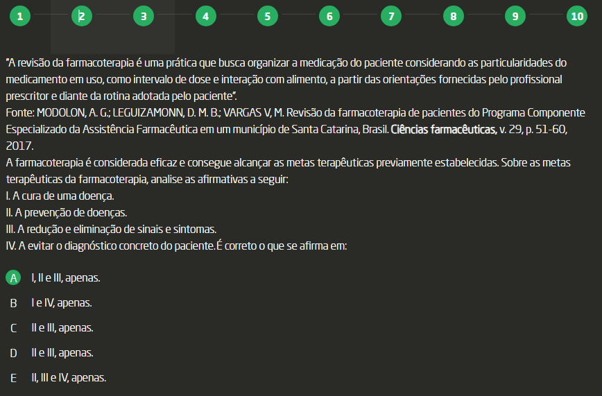 <p>1 3 4 5 6 7 8 9 10 "A revisão da farmacoterapia é uma prática que busca organizar a medicação do paciente considerando as particularidades do medicamento em uso, como intervalo de dose e interação com alimento, a partir das orientações fornecidas pelo profissional prescritor e diante da rotina adotada pelo Fonte: MODOLON, A. G.; LEGUIZAMONN, D. M. VARGAS V, M. Revisão da farmacoterapia de pacientes do Programa Componente Especializado da Assistência Farmacêutica em um município de Santa Catarina, Brasil. Ciências farmacêuticas, V. 29, p. 51-60, 2017. A farmacoterapia é considerada eficaz e consegue alcançar as metas terapêuticas previamente estabelecidas. Sobre as metas terapêuticas da farmacoterapia, analise as afirmativas a A cura de uma doença. II. A prevenção de doenças. III. A redução e eliminação de sinais e sintomas. IV. A evitar diagnóstico concreto do paciente.É correto que se afirma em: A I, II e III, apenas. B I e IV, apenas. e III, apenas. D II e III, apenas. E II, III e IV, apenas.</p>