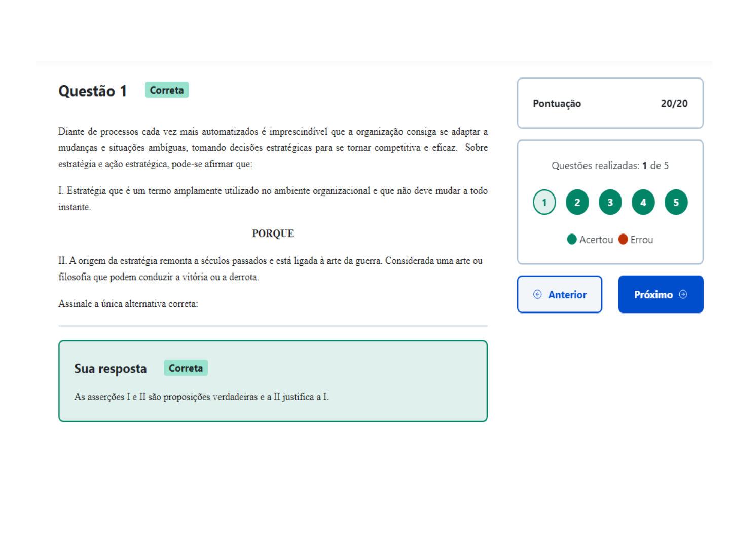 <p>Questão 1 Correta Pontuação 20/20 Diante de processos cada vez mais automatizados é imprescindível que a organização consiga se adaptar a mudanças e situações ambíguas, tomando decisões estratégicas para se tornar competitiva e eficaz. Sobre estratégia e ação estratégica, pode-se afirmar que: Questões realizadas: 1 de 5 I. Estratégia que é um termo amplamente utilizado no ambiente organizacional e que não deve mudar a todo instante. 1 2 3 4 5 PORQUE Acertou Errou II. A origem da estratégia remonta a séculos passados e está ligada à arte da guerra. Considerada uma arte ou filosofia que podem conduzir a vitória ou a derrota. Anterior Próximo Assinale a única alternativa correta: Sua resposta Correta As asserções I e II são proposições verdadeiras e a II justifica a I.</p><p>Em entrevista à revista Times, de maio de 1994, Mandela disse: "Quando você deseja que um rebanho se mova em determinada direção, você fica Alguns membros mais enérgicos do rebanho vão para frente, e o resto do gado os segue. Você, na verdade, os está dirigindo de trás." Com um sorriso, "É assim Pontuação 20/20 que um líder deveria fazer o seu trabalho." (SENGEL, 1994). De acordo com as teorias recentes sobre liderança, avalie as afirmativas abaixo no que diz respeito à correspondência entre a perspectiva mencionada por Nelson Mandela e o tipo de liderança. Questões realizadas: 2 de 5 I. A perspectiva mencionada está relacionada à liderança carismática ou referencial, em que os seguidores 1 2 3 4 5 atribuem ao líder capacidades heroicas ou extraordinárias de liderança quando observam determinados comportamentos. Sob essa liderança, os profissionais sentem-se motivados a fazer esforço maior e, como gostam de seu líder, sentem mais satisfação no trabalho. Acertou Errou II. A referida fala do líder africano aponta para a liderança coercitiva, baseada na habilidade de influenciar por meio de potencial punição e, portanto, baseada no temor. Anterior Próximo III. trecho mencionado caracteriza a liderança democrática, situação em que o líder tem a habilidade de construir relações humanas e participativas, como comunicação de apoio e de equipe. Sob essa liderança, os liderados têm espaço para o IV. A perspectiva de Mandela remete à liderança autocrática, contexto em que o líder se preocupa mais com a tarefa que com o grupo e, assim, tende a focalizar o trabalho, o cumprimento de metas e a superação de padrões, enfatizando a distribuição de tarefas e a responsabilidade individual. É correto apenas o que se afirma em: Sua resposta Correta I e III, apenas.</p><p>Questão 3 Correta Pontuação 20/20 fato de os trabalhadores de hoje serem fundamentais na busca de vantagem competitivas levou a criação da administração estratégica de recursos humanos. De que forma a área de gestão de pessoas pode participar da formulação estratégica das empresas? Questões realizadas: 3 de 5 Assinale a única alternativa correta: 1 2 3 4 5 Acertou Errou Sua resposta Correta A gestão de pessoas pode participar fornecendo informações relacionadas a força de trabalho e pode desenvolver táticas e ações para sobrepujar as fraquezas identificadas e potencializar os pontos fortes Anterior Próximo € através de treinamento e valorização das competências.</p><p>Questão 4 Correta Pontuação 20/20 A descrição da é um dos pontos-chaves na compreensão das ações humanas, funcionando como um padrão coletivo que identifica os grupos, suas maneiras de perceber, pensar, sentir e agir. "Mais do que um conjunto de regras, de hábitos e de artefatos, significa a construção de significados Questões realizadas: 4 de 5 partilhados pelo conjunto de pessoas pertencentes a um mesmo grupo social" (Pires, J.C.S; Macedo, K.B., 2006, p. 83). 1 2 3 4 5 Escolha a alternativa que preenche corretamente a lacuna: Acertou Errou Sua resposta Correta + Anterior Próximo Cultura.</p><p>Questão 5 Correta Pontuação 20/20 Um bom gestor é fundamental no processo de gerar valor sustentável através do pois, ao liderar de maneira eficaz, ajuda a conquistar as metas estabelecidas, a motivar e avaliar os resultados. Esse conjunto de competências faz toda a diferença no desempenho da organização. Questões realizadas: 5 de 5 Com relação a Gestão estratégica de Pessoas, escolha a alternativa correta que preenche a lacuna indicada no 1 2 3 4 5 texto: Acertou Errou Sua resposta Correta € Anterior Concluir Capital intelectual.</p>