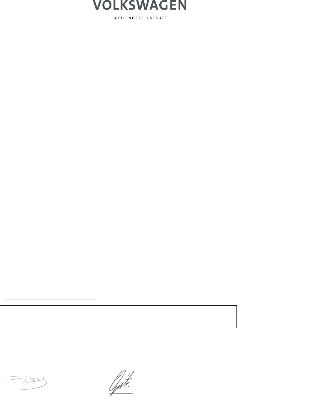 <p>VOLKSWAGEN AKTIENGESELLSCHAFT 38436 WOLFSBURG DEUTSCHLAND</p><p>IHRE ZEICHEN</p><p>IHRE NACHRICHT</p><p>UNSERE ZEICHEN</p><p>DURCHWAHL</p><p>TELEFAX</p><p>E-MAIL</p><p>DATUM</p><p>VOLKSWAGEN AKTIENGESELLSCHAFT</p><p>38436 WOLFSBURG</p><p>DEUTSCHLAND</p><p>TELEFON +49 5361 9-0</p><p>TELEFAX +49 5361 9-28282</p><p>VW@VOLKSWAGEN.DE</p><p>VORSITZENDER DES AUFSICHTSRATS:</p><p>HANS DIETER PÖTSCH</p><p>VORSTAND:</p><p>OLIVER BLUME –</p><p>VORSITZENDER</p><p>ARNO ANTLITZ</p><p>RALF BRANDSTÄTTER</p><p>MANFRED DÖSS</p><p>MARKUS DUESMANN</p><p>GUNNAR KILIAN</p><p>THOMAS SCHÄFER</p><p>THOMAS SCHMALL-VON WESTERHOLT</p><p>HAUKE STARS</p><p>VOLKSWAGEN AKTIENGESELLSCHAFT</p><p>SITZ: WOLFSBURG</p><p>AMTSGERICHT BRAUNSCHWEIG</p><p>HRB 100484</p><p>To all business partners of the Volkswagen Group</p><p>K-MBS/ K-SK</p><p>March 30th, 2023</p><p>Reminder on the implementation of the TISAX certificate obligation in the supply chain</p><p>Dear Sir/Madam,</p><p>We refer to our letter dated November 28, 2022 (“increase of cyber security within the supply</p><p>chain”), in which we informed you that from January 1, 2023, a TISAX certificate obligation with the</p><p>assessment level "availability high" applies for all production material suppliers (hereinafter " P-sup-</p><p>pliers").</p><p>If you already meet the requirements set out in the above-mentioned letter or have already initiated</p><p>the activities outlined on schedule, you can regard this new letter as irrelevant. Otherwise the fol-</p><p>lowing applies:</p><p>The TISAX certificate with the assessment level of availability (“Availability High”) must be proven</p><p>by June 30, 2024 at the latest. An internal evaluation has shown that your company has not submit-</p><p>ted the declaration of consent. Due to the short transition period and the possibly high level of prep-</p><p>aration for certification, we ask you to initiate the TISAX certification immediately in order to avoid</p><p>delays on your part. Please take all relevant steps starting from the signed declaration of consent,</p><p>to the registration on the ENX platform to the status report of the TISAX process, in a timely manner.</p><p>We kindly ask you again to sign the "Declaration of consent for the assessment of information pro-</p><p>tection according to TISAX" by June 30, 2023 and send it back to the following mailbox:</p><p>fremdfirmenabnahme@volkswagen.de.</p><p>Please note that failure to comply with these measures regarding the TISAX certificate obligation</p><p>until June 30, 2024 will result in the exclusion of further nominations for all brands of the</p><p>Volkswagen Group!</p><p>If you require further information regarding P-supplier TISAX requirements, please read the en-</p><p>closed attachment carefully. If you have any further questions, please contact the mailbox men-</p><p>tioned above.</p><p>Yours sincerely,</p><p>ppa. i.V.</p><p>_________________________ _____________________________</p><p>Martin Fries Reinhard Opitz</p><p>Head of Group Procurement Head of Group Security</p><p>Supply Chain Know-how and prototype protection</p><p>Enclosure:</p><p>Support P-suppliers TISAX</p><p>mailto:fremdfirmenabnahme@volkswagen.de</p>