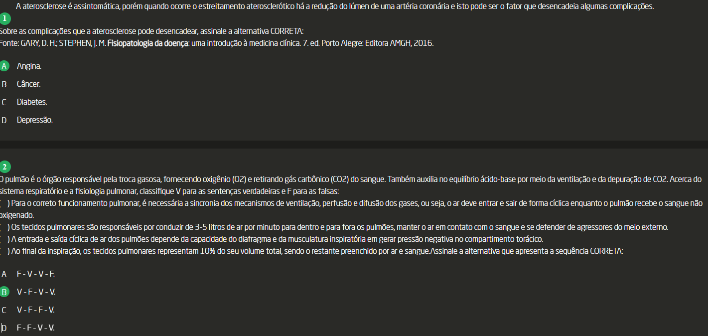 <p>A aterosclerose é assintomática porém quando ocorre estreitamento aterosclerótico há a redução do lúmen de uma artéria coronária e isto pode ser fator que desencadeia algumas complicações. 1 Sobre as complicações que a aterosclerose pode desencadear, assinale a alternativa Fonte: GARY, D. STEPHEN, M. Fisiopatologia da doença: uma introdução à medicina ed. Porto Alegre: Editora AMGH, 2016. A Angina. B C D 2 pulmão é órgão responsável pela troca gasosa, fornecendo oxigênio (02) e retirando gás carbônico (CO2) do sangue. Também auxilia no equilíbrio ácido-base por meio da ventilação e da depuração de CO2. Acerca do sistema respiratório e a fisiologia pulmonar, classifique V para as sentenças verdadeiras e F para as falsas: ) Para correto funcionamento pulmonar, é necessária a sincronia dos mecanismos de perfusão e difusão dos gases, ou seja, 0 an deve entrar e de forma cíclica enquanto pulmão recebe sangue não oxigenado. I ) Os tecidos pulmonares são responsáveis por conduzir de 3-5 litros de por minuto para dentro e para fora os manter em contato com sangue e se defender de agressores do meio externo. ) A entrada e saída cíclica de an dos pulmões depende da capacidade do diafragma e da musculatura inspiratória em gerar pressão negativa no compartimento torácico. I ) Ao final da inspiração, os tecidos pulmonares representam 10% do seu volume total, sendo restante preenchido por e sangue.Assinale a alternativa que apresenta a seguência CORRETA: A F-V-V-F B V-F-V-V D</p>