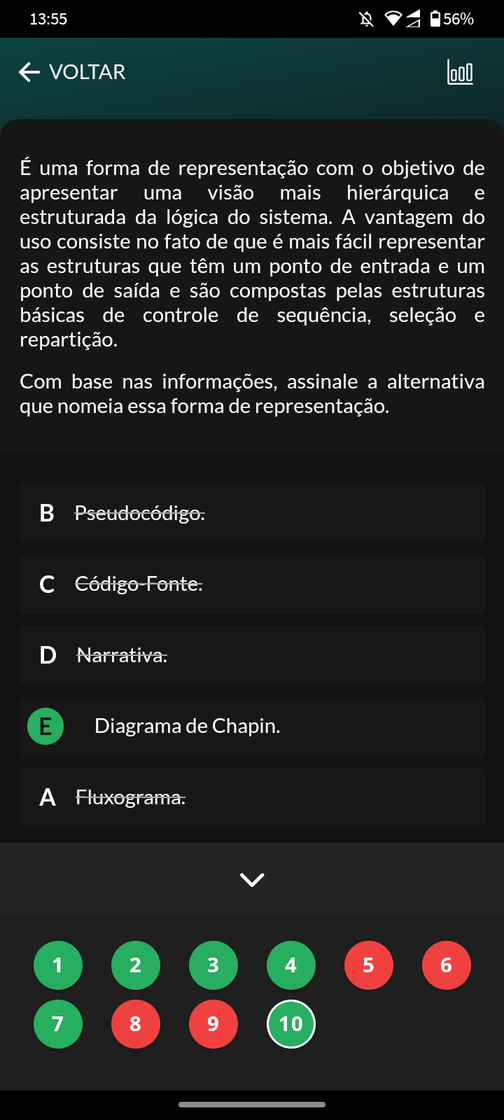 <p>13:55 56% VOLTAR É uma forma de representação com objetivo de apresentar uma visão mais hierárquica e estruturada da lógica do sistema. A vantagem do uso consiste no fato de que é mais fácil representar as estruturas que têm um ponto de entrada e um ponto de saída e são compostas pelas estruturas básicas de controle de sequência, seleção e repartição. Com base nas informações, assinale a alternativa que nomeia essa forma de representação. Pseudocódigo. D Narrativa. E Diagrama de Chapin. A Fluxograma. 1 2 3 4 5 6 7 8 9 10</p>