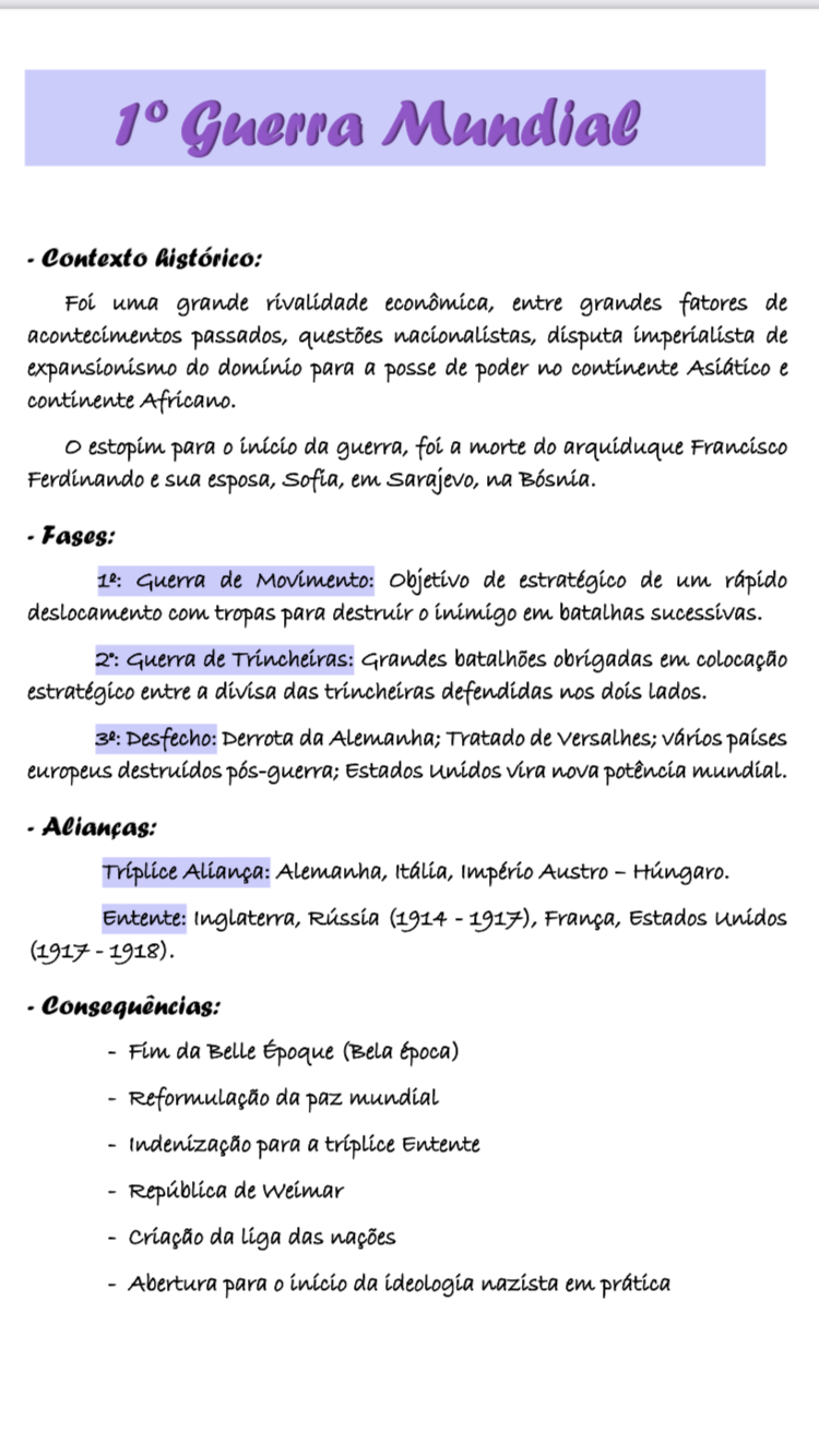 <p>Guerra Mundial Contexto histórico: Foi uma grande econômica, entre grandes fatores de acontecimentos passados, questões nacionalistas, disputa de do para a posse de poder no continente Asiático e continente Africano. estopim para início da guerra, foi a morte do arquiduque Francisco Ferdinando e sua esposa, em na Fases: Guerra de Movimento: Objetivo de estratégico de um rápido deslocamento com tropas para destruir inimigo em batalhas sucessivas. Guerra de Trincheiras: Grandes batalhões obrigadas em colocação estratégico entre a divisa das trincheiras nos lados. Desfecho: Derrota da Alemanha; Tratado de versalhes; vários países europeus destruídos pós-guerra; Estados unidos nova potência mundial. Alianças: Tríplice Alemanha, Austro - Hungaro. Entente: Inglaterra, Rússia (1914-1917), França, Estados unidos (1917-1918). - Fim da Belle (Bela - Reformulação da paz mundial - Indenização para a tríplice Entente - República de - da das - Abertura para início da ideologia nazista em prática</p>