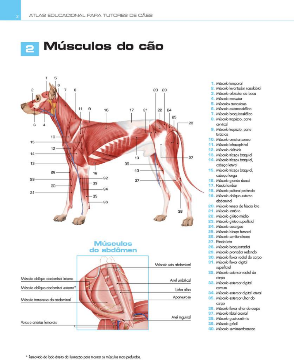 <p>2 ATLAS EDUCACIONAL PARA TUTORES DE CÃES Músculos do cão 1 5 6 1. temporal 2 7 8 20 23 2. levantador nasolabial 3. orbicular do boca 4. Músculo masseter 5. Músculos 11 9 16 17 21 22 24 7. 25 8. Músculo trapézio, parte 26 3 4 cervical 9. Músculo trapézio, parte 10 10. omotransverso 15 11. infraespinhal 12 12. deltoide 14 13. triceps braquial 19 27 14. Músculo triceps 13 39 lateral 28 40 15. triceps braquial, 18 cobeça longa 29 32 37 16. grande dorsal 33 30 17. Fáscia lombar 34 31 18. profundo 35 19. obliquo externo 36 abdominal 20. Músculo tensor da fáscia lata 38 21. 22. médio 23. superficial 24. coccigeo 25. biceps femoral 26. semitendinoso Músculos 27. Fáscia lata 28. Músculo do abdômen 29. pronador redondo 30. flexor radial do carpo reto abdominal 31. Músculo flexor digital superficial 32. extensor radial do obliquo abdominal interno Anel umbilical 33. Músculo extensor digital obliquo abdominal Linha comum 34. extensor digital lateral transverso do abdominal Aponeurose 35. extensor ulnar do 36. Músculo flexor ulnar do carpo 37. tibial cranial Anel inguinal 38. Músculo e artérias femorais 39. Músculo grácil 40. semimembranoso * Removido do lado diretto para mostrar mais</p><p>Ossos do cranio de osso temporal osso occiopital mandíbula osso palatino osso esfenoide osso pterigóide osso incisivo osso nasal maxila osso lacrimal osso zigomático osso frontal osso parietal osso interparietal bovino Vértebras Cervical Torácica Lombar Sacrais Caudais Crânio Mandíbula Tuberosidade Escápula Úmero Fêmur Ulna Patela Costelas Rádio Olécrano Tíbia Calcâneo Tarso Carpo Sobreosso Sobreosso Metacarpianos Metatarsianos Falange Falange proximal proximal Sesamoide proxima Sesamoide Falange média proximal Falange Falange média Falange distal distal Figura 6-7 Esqueleto equino. (Modificado de McBride Learning veterinary terminology, ed 2, Louis, Mosby.)</p><p>Osso coxal de um vista ventral Crista Tuberosidade sacral Tuberosidade coxal Faceta auricular Incisura Forame obturado Tuberosidade menor MEMBROS TORÁCICOS Cabeça do úmero Tuberosidade Colo do úmero deltoide Corpo do úmero Fossa do olécrano Epicôndilos EQUINO</p><p>VISTA LATERAL Espinha da Escápula Fossa Infra-espinhal Fossa Supra-espinhal Tuber da Espinha da Escápula Forame Nutrício Acrômio VISTA MEDIAL Fossa Subescapular Acrômio Tubérculo Supraglenoidal Processo Coracóide VISTA CRANIAL Sulco Intertubercular Tubérculo Maior Tubérculo Menor Face do Músculo Infra-espinhal Tuberosidade Deltóidea Tuberosidade Redonda Maior Crista do Fossa Radial Côndilo Capítulo Rafeel M.S.</p><p>VISTA LATERAL Tubérculo Maior Tubérculo Face do Músculo Menor Infra-espinhal Tuberosidade Crista do Deltóidea Úmero Sulco do Músculo Braquial VISTA CAUDAL Tubérculo Maior Cabeça do Umero Colo Tuberosidade Tuberosidade Deltóidea Redonda Maior Epicôndilo Lateral Epicôndilo Medial Fossa do Olécrano M VISTA DISTAL Tuberosidade Tuberosidade Deltóidea Redonda Maior Crista do Côndilo</p><p>VISTA DORSAL Tuberosidade Base Metacárpica Sulco Corpo Longitudinal Dorsal Canal Distal do Metacarpo Cabeça Fate M VISTA PALMAR Metacárpico V Canal Proximal do Metacarpo Sulco Longitudinal Palmar Canal Distal do Metacarpo Medial Lateral Refeel M VISTA DISTAL Sulco Longitudianal Dorsal Canal Distal do Metacarpo Lateral Medial Incisura Intertroclear Legenda: M S</p>