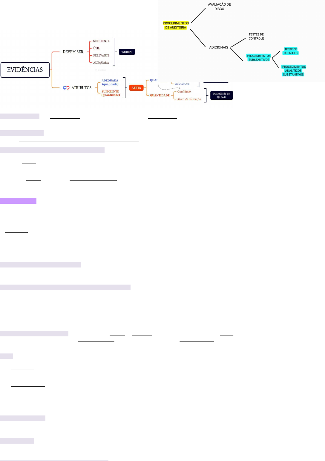 <p>Definição Auditoria: É um processo formal, que busca através de evidências, o exame objetivo de uma situação ou condição, baseado em</p><p>um critério pré-estabelecido que visa emitir opiniões ou comentários específicos de um objeto.</p><p>Objetivo da Auditoria: É minimizar o risco de distorção relevante dos relatórios contábeis, através de análises e seguindo as normas de</p><p>auditoria, aumentando o grau de confiança das demonstrações contábeis.</p><p>Diferenças entre Auditoria interna e auditoria externa:</p><p>A auditoria interna está preocupada também com os processos internos da organização, visando aperfeiçoá-los e age de maneira</p><p>preventiva.</p><p>já a auditoria externa é formada por auditores independentes e atua após a demonstrações contábeis já terem sido elaboradas pela</p><p>administração da organização, objetivando emitir uma opinião imparcial sobre as demonstrações, visando minimizar riscos de fraudes e</p><p>distorções relevantes.</p><p>Tipos de Auditoria:</p><p>▪ Financeira: Quando a organização audita seus saldos e projeções financeiros, atestando que, seus relatórios financeiros estão coerentes</p><p>com sua realidade financeira.</p><p>▪ Operacional: é relacionada a controle e eficiência em seus processos, é realizada para garantir o bom funcionamento dos processos</p><p>organizacionais, identificando se existe alguma falha ou melhoria que possa ser reparada ou realizada.</p><p>▪ De conformidade: É realizada para garantir que os relatórios financeiros estejam de acordo/em conformidade com as normas contábeis</p><p>de auditoria.</p><p>Objetivos Gerais do Auditor Independente: Obter evidências adequadas, para emitir uma opinião, obtendo de forma razoável a</p><p>segurança de que as demonstrações estejam livres de distorção relevante, apresentando um relatório sobre as mesmas, obtido através</p><p>das evidências.</p><p>Características das Evidências de Auditoria: adequação x suficiência:</p><p>▪ Adequação: Está relacionada com a qualidade das evidências. Quanto mais adequadas forem as evidências, menor será a quantidade</p><p>requisitada pelo auditor para que obtenha uma opinião sobre a análise.</p><p>▪ Suficiência: Está relacionada a quantidade de evidências necessárias para emissão de uma opinião, que está diretamente relacionada a</p><p>adequação, pois quanto menos adequadas forem as evidências, maior a quantidade delas para proporcionar maior confiança ao auditor.</p><p>Conceito de distorção em auditoria: Refere-se a qualquer omissão ou incorreção nas demonstrações financeiras que podem influenciar</p><p>nas decisões dos usuários. Chamamos de distorção relevante caso ela tenha potencial de afetar significativamente a opinião do usuário</p><p>sobre as demonstrações contábeis, afetando a tomada de decisão.</p><p>IOCCC: Princípios fundamentais de ética profissional:</p><p>Integridade: Ser honesto e direto em todas as atividades e relacionamentos profissionais.1.</p><p>Objetividade: Manter uma mente imparcial e evitar influências que possam comprometer o julgamento profissional.2.</p><p>Competência Profissional: Manter conhecimentos e habilidades adequados e atuar com cuidado e diligência.3.</p><p>Confidencialidade: Respeitar a privacidade das informações adquiridas durante a auditoria, não as divulgando sem autorização</p><p>apropriada.</p><p>4.</p><p>Comportamento Profissional: Atuar de acordo com as leis e regulamentos aplicáveis e evitar ações que desacreditem a profissão.5.</p><p>Planejamento de Auditoria. Papéis de Trabalho e Documentação de auditoria.</p><p>Fluxo do planejamento:</p><p>O planejamento em auditoria envolve a definição de objetivos, escopo, cronograma e alocação de recursos. Ele é essencial para garantir</p><p>que uma auditoria seja eficiente e focada nas áreas mais relevantes para a organização.</p><p>Estratégia Global:</p><p>Consiste na visão macro de auditoria, que abrange o desenvolvimento de uma abordagem geral para os riscos e objetivos de auditoria,</p><p>além de considerar fatores como complexidade e materiais críticos.</p><p>- Diferença entre Estratégia Global e Plano de Auditoria:</p><p>REV: Auditoria - Definições</p><p>domingo, 4 de agosto de 2024 10:47</p><p>Página 1 de Audit</p><p>- Diferença entre Estratégia Global e Plano de Auditoria:</p><p>Estratégia Global : Fornece diretrizes amplas sobre como os auditorias serão realizadas, incluindo a identificação de áreas de risco e</p><p>definição de recursos.</p><p>Plano de Auditoria : É mais detalhado e operacional, incluindo cronogramas específicos, natureza e extensão dos procedimentos de</p><p>auditoria a serem realizados.</p><p>- Atividades do Planejamento de Auditoria Operacional:</p><p>Envolve a identificação de riscos operacionais, a definição de objetivos específicos para cada área auditada e a alocação de recursos e</p><p>tempo para cada atividade, com foco na eficiência das operações.</p><p>- Planejamento da Auditoria de Conformidade (Regularidade)</p><p>Visa verificar se as atividades, registros e controles estão em conformidade com leis, regulamentos e normas regulamentares. O</p><p>planejamento aqui busca identificar as principais áreas de risco de não conformidade.</p><p>- Conceito de Documentação de Auditoria</p><p>A documentação de auditoria inclui todos os registros e papéis de trabalho que servem para comprovar as atividades realizadas pelo</p><p>auditor, suas conclusões e o suporte para a opinião emitida no relatório final.</p><p>- Prazo de retenção (guarda) da documentação de auditoria:</p><p>A guarda da documentação deverá ser feita por pelo menos 5 anos após a conclusão das auditorias.</p><p>- Classificação da documentação de auditoria quanto à natureza:</p><p>A documentação pode ser definida de acordo com sua natureza, como:</p><p>Evidências de suporte : Dad