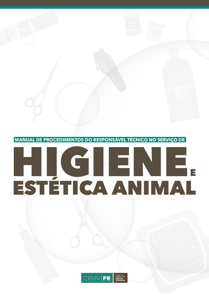 <p>MANUAL DE PROCEDIMENTOS DO RESPONSÁVEL TÉCNICO NO SERVIÇO DE HIGIENE E ESTÉTICA ANIMAL | CRMV-PR</p><p>1</p><p>CONSELHO REGIONAL DE MEDICINA VETERINÁRIA DO ESTADO DO PARANÁ</p><p>MANUAL DE PROCEDIMENTOS DO RESPONSÁVEL TÉCNICO</p><p>NO SERVIÇO DE HIGIENE E ESTÉTICA ANIMAL</p><p>2020</p><p>Curitiba, 2020</p><p>DIRETORIA EXECUTIVA</p><p>Gestão 2017-2020</p><p>Rodrigo Távora Mira</p><p>Médico Veterinário | CRMV-PR nº 03103</p><p>Presidente</p><p>Nilva Maria Freres Mascarenhas</p><p>Médica Veterinária | CRMV-PR nº 02275</p><p>Vice-Presidente</p><p>Leonardo Nápoli</p><p>Médico Veterinário | CRMV-PR nº 03350</p><p>Secretário-Geral</p><p>Carlos Frederico Grubhofer</p><p>Zootecnista | CRMV-PR nº 0273/Z</p><p>Tesoureiro</p><p>MANUAL DE PROCEDIMENTOS DO RESPONSÁVEL TÉCNICO NO SERVIÇO DE HIGIENE E ESTÉTICA ANIMAL | CRMV-PR</p><p>4</p><p>MANUAL DE PROCEDIMENTOS DO RESPONSÁVEL</p><p>TÉCNICO NO SERVIÇO DE HIGIENE E ESTÉTICA ANIMAL</p><p>Os serviços de Estética, Higiene e Embelezamento animal represen-</p><p>tam uma fatia significativa do mercado Pet nacional e estão diretamente</p><p>relacionados à prestação de assistência técnico-higiênica aos animais.</p><p>O presente manual tem por finalidade orientar os responsáveis técnicos</p><p>sobre os principais aspectos dessa atividade, a qual compreende a atuação</p><p>de diversos profissionais (banhistas, tosadores, recepcionistas, auxiliares).</p><p>Nesse sentido, o médico veterinário é fundamental na orientação a todos</p><p>os envolvidos no negócio e na segurança do animal, em sentido amplo. A</p><p>aplicação das recomendações abaixo demonstra à comunidade em geral a</p><p>preocupação com o bem-estar e a saúde dos animais.</p><p>Definição - Serviço de estética, higiene e embelezamento animal:</p><p>estabelecimento destinado à prestação de serviços de banho, tosa e embe-</p><p>lezamento de animais domésticos. (Código CNAE 9609-2/03)</p><p>Sinônimos - banho e tosa, “trimming” e “grooming”, estética animal.</p><p>MANUAL DE PROCEDIMENTOS DO RESPONSÁVEL TÉCNICO NO SERVIÇO DE HIGIENE E ESTÉTICA ANIMAL | CRMV-PR</p><p>5</p><p>ATRIBUIÇÕES DO RESPONSÁVEL TÉCNICO</p><p>O Responsável Técnico (RT) pelo banho e tosa, quando no exercício</p><p>de suas funções, deve:</p><p>1. Conhecer o Código de Proteção e Defesa do Consumidor:</p><p>a. Orientar sobre o serviço de atendimento ao consumidor,</p><p>assegurando informações pertinentes a quem solicitar e respeitando</p><p>os direitos como consumidores de serviços;</p><p>b. Cuidar para que os dispositivos promocionais da empresa</p><p>não contenham informações que caracterizem propaganda abusiva</p><p>e/ou enganosa, ou que contrariem o Código de Proteção e Defesa do</p><p>Consumidor.</p><p>2. Orientar e treinar a equipe de funcionários, ministrando-lhes</p><p>ensinamentos necessários à sua segurança e ao bom desempenho de suas</p><p>funções, especialmente acerca das atividades de manejo, práticas higiêni-</p><p>co-sanitárias, manipulação de produtos, técnicas de contenção de animais e</p><p>respeito ao bem-estar animal:</p><p>a. Realizar reciclagens desses treinamentos, assim como verifi-</p><p>cações do aprendizado e aplicações dos conhecimentos;</p><p>b. Orientar o proprietário do estabelecimento e os funcioná-</p><p>rios quanto à conservação, ao manuseio e ao uso correto dos produ-</p><p>tos de acordo com as especificações do fabricante, assim como os</p><p>riscos decorrentes de seu manuseio e uso;</p><p>c. Orientar sobre riscos das atividades que envolvam animais,</p><p>seus resíduos e os produtos de uso veterinário;</p><p>d. Orientar sobre vestimentas adequadas e uso de equipa-</p><p>mentos de proteção individual e coletiva;</p><p>e. Ter pleno conhecimento de todas as questões legais que</p><p>envolvem o uso de equipamentos;</p><p>f. Orientar os funcionários sobre etologia animal;</p><p>g. Orientar sobre zoonoses e outros riscos de acidentes com</p><p>animais.</p><p>3. Acatar as normas legais referentes aos serviços de vigilância sanitá-</p><p>MANUAL DE PROCEDIMENTOS DO RESPONSÁVEL TÉCNICO NO SERVIÇO DE HIGIENE E ESTÉTICA ANIMAL | CRMV-PR</p><p>6</p><p>ria, vigilância ambiental e demais órgãos de fiscalização:</p><p>a. Notificar as autoridades sanitárias competentes a ocorrência</p><p>de eventos de notificação obrigatória e de interesse à saúde pública.</p><p>4. Orientar sobre questões ambientais:</p><p>a. Adotar procedimentos de segurança no estabelecimento</p><p>quanto aos produtos que ofereçam risco ao meio ambiente, aos ani-</p><p>mais ou ao homem, especialmente quando da ocorrência de acidente</p><p>que provoque vazamento ou exposição do conteúdo do produto;</p><p>b. Elaborar e assegurar a execução do Plano de Gerenciamen-</p><p>to de Resíduos de Sólidos, quando se aplicar;</p><p>c. Orientar sobre o descarte das embalagens e resíduos;</p><p>d. Orientar sobre o destino adequado dos dejetos.</p><p>5. Orientar sobre os produtos de uso veterinário e os saneantes:</p><p>a. Permitir somente a utilização de produtos devidamente</p><p>registrados nos órgãos competentes;</p><p>b. Usar produtos destinados aos animais e compatíveis com a</p><p>espécie;</p><p>c. Assegurar que a armazenagem seja feita de acordo com as</p><p>recomendações de rotulagem ou bula do produto, especialmente no</p><p>que concerne à exposição à luz, à temperatura e à umidade;</p><p>d. Ter conhecimento sobre a origem, mecanismo de ação, vali-</p><p>dade e poder residual dos desinfetantes e demais produtos químicos</p><p>utilizados.</p><p>6. Assegurar a manutenção da saúde, segurança e bem-estar dos</p><p>animais no período de sua permanência no estabelecimento:</p><p>a. Orientar a disposição das gaiolas, de tal forma que essas</p><p>recebam ventilação adequada, assim como sobre o tamanho apro-</p><p>priado para o porte do animal;</p><p>b. Evitar a presenç