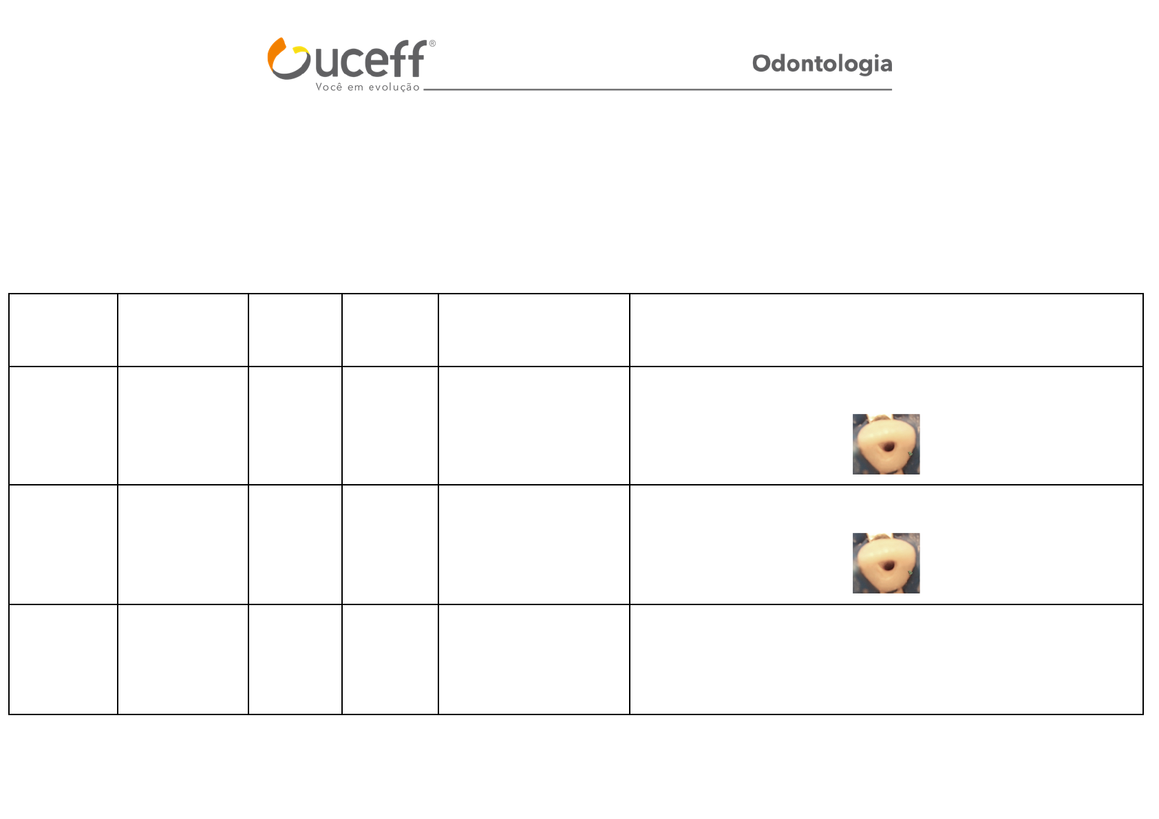 <p>Centro Universitário de Itapiranga UCEFF</p><p>Curso de Odontologia</p><p>Disciplina: Endodontia</p><p>Prof°: Fernanda Helaine Cidade e Mara Luiza Pilz Maldaner</p><p>Nome: Carla Weiss</p><p>Turma: 5º Semestre</p><p>Tabela Forma de Conveniência</p><p>Grupos de</p><p>elementos</p><p>dentários</p><p>Forma de</p><p>conveniência</p><p>Nº Canais Nº Raízes Possíveis Variações Localização das entradas</p><p>Incisivo</p><p>Central</p><p>Superior</p><p>Triangular com</p><p>base para a</p><p>incisal</p><p>1 canal 1 raiz Curvatura da raiz para</p><p>a vestibular</p><p>Localização a frente da cavidade de acesso em linha reta levando</p><p>em consideração o longo eixo do dente</p><p>Incisivo</p><p>Central</p><p>Inferior</p><p>Triangular com</p><p>base para a</p><p>incisal</p><p>1 canal 1 raiz Tendência de 2 canais</p><p>em 1 raiz</p><p>Localização a frente da cavidade de acesso em linha reta levando</p><p>em consideração o longo eixo do dente</p><p>Incisivo</p><p>Lateral</p><p>Superior</p><p>Triangular com</p><p>base para a</p><p>incisal</p><p>1 canal 1 raiz Curvatura para a distal</p><p>devido a posição das</p><p>arcadas, além de</p><p>incidencia de dentes</p><p>conoides ou</p><p>Localização a frente da cavidade de acesso em linha reta levando</p><p>em consideração o longo eixo do dente</p><p>invaginatos</p><p>Incisivo</p><p>Lateral</p><p>Inferior</p><p>Triangular com</p><p>base para a</p><p>incisal</p><p>1 canal 1 raiz Tendência de 2 canais</p><p>em 1 raiz</p><p>Localização a frente da cavidade de acesso em linha reta levando</p><p>em consideração o longo eixo do dente</p><p>Canino</p><p>Superior</p><p>Oval/</p><p>losangular</p><p>1 canal 1 raiz Dentes longos e a</p><p>porção cervical é</p><p>alongada e fina</p><p>Localização a frente da cavidade de acesso em linha reta levando</p><p>em consideração o longo eixo do dente</p><p>Canino</p><p>Inferior</p><p>Oval/</p><p>losangular</p><p>1 canal 1 raiz Incidência de mais de</p><p>um canal</p><p>Localização a frente da cavidade de acesso em linha reta levando</p><p>em consideração o longo eixo do dente</p><p>1º Pré</p><p>Molar</p><p>Superior</p><p>Ovalada/</p><p>circular</p><p>2 canais 2 raízes Pode haver alterações</p><p>no número de raízes</p><p>(1,2 ou 3) e pode conter</p><p>até 3 canais</p><p>Localização do canal vestibular está abaixo da cúspide vestibular e</p><p>do canal palatino abaixo da cúspide palatina</p><p>1º Pré Ovalada/ 1 canal 1 raiz Pode haver a incidência Localização a frente da cavidade de acesso em linha reta levando</p><p>Molar</p><p>Inferior</p><p>circular de mais de uma raiz,</p><p>sendo muito difícil de</p><p>tratar</p><p>em consideração o longo eixo do dente</p><p>2º Pré</p><p>Molar</p><p>Superior</p><p>Ovalada/</p><p>circular</p><p>½ canais 1 raiz Pode haver alterações</p><p>no número de raízes</p><p>(1,2 ou 3) e pode conter</p><p>até 3 canais</p><p>Localização a frente da cavidade de acesso em linha reta levando</p><p>em consideração o longo eixo do dente</p><p>2º Pré</p><p>Molar</p><p>Inferior</p><p>Ovalada/</p><p>circular</p><p>1 canal 1 raiz Pode haver a incidência</p><p>de mais de uma raiz,</p><p>sendo muito difícil de</p><p>tratar</p><p>Localização a frente da cavidade de acesso em linha reta levando</p><p>em consideração o longo eixo do dente</p><p>1º Molar</p><p>Superior</p><p>Trapezoidal</p><p>com base para</p><p>a vestibular</p><p>¾ canais 3 raízes Pode ocorrer a</p><p>incidência de 4 canais</p><p>Canal mésio- vestibular localiza-se abaixo da cúspide vestibular; O</p><p>canal disto- vestibular encontra-se ligeiramente para medial com</p><p>relação ao canal; A entrada do canal palatino está projetada abaixo</p><p>entre a fossa central e a cúspide palatina; E a entrada do canal</p><p>mésio- palatino está próxima do canal mésio- vestibular</p><p>1º Molar Trapezoidal ¾ canais 2 raízes Quando houver dois A entrada do canal mésio- vestibular está abaixo da cúspide mésio-</p><p>Inferior com base para</p><p>a medial</p><p>canais distais, ambos</p><p>estarão lado a lado na</p><p>mesma região do</p><p>assoalho da câmara</p><p>pulpar</p><p>vestibular; A entrada do canal mésio- lingual encontra-se abaixo da</p><p>cúspide lingual; A entrada do canal distal está aproximadamente 2</p><p>mm para distal da fossa central</p><p>2º Molar</p><p>Superior</p><p>Trapezoidal</p><p>com base para</p><p>a vestibular</p><p>¾ canais 3 raízes Pode ocorrer a</p><p>incidência de 4 canais</p><p>Canal mésio- vestibular localiza-se abaixo da cúspide vestibular; O</p><p>canal disto- vestibular encontra-se ligeiramente para medial com</p><p>relação ao canal; A entrada do canal palatino está projetada abaixo</p><p>entre a fossa central e a cúspide palatina; E a entrada do canal</p><p>mésio- palatino está próxima do canal mésio- vestibular</p><p>2° Molar</p><p>Inferior</p><p>Trapezoidal</p><p>com base para</p><p>a medial</p><p>¾ canais 2 raízes Quando houver dois</p><p>canais distais, ambos</p><p>estarão lado a lado na</p><p>mesma região do</p><p>assoalho da câmara</p><p>pulpar</p><p>A entrada do canal mésio- vestibular está abaixo da cúspide mésio-</p><p>vestibular; A entrada do canal mésio- lingual encontra-se abaixo da</p><p>cúspide lingual; A entrada do canal distal está aproximadamente 2</p><p>mm para distal da fossa central</p>