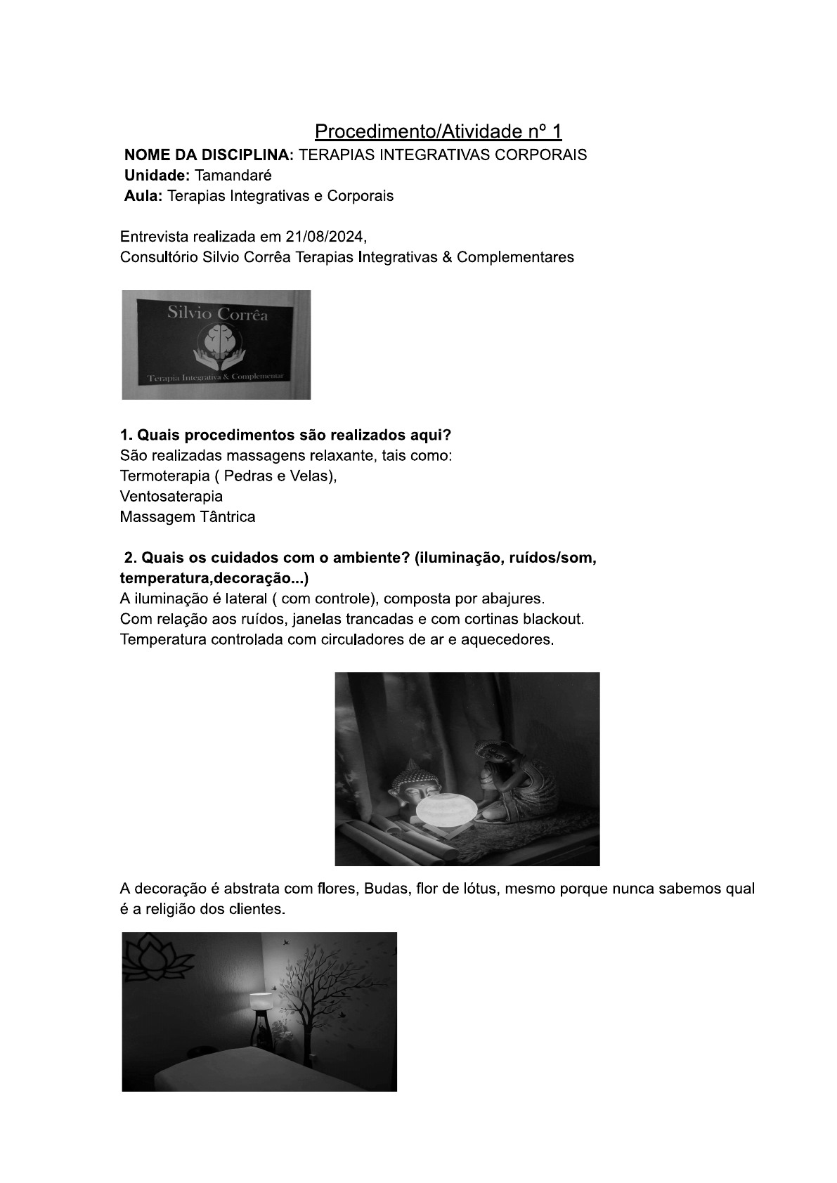 <p>Procedimento/Atividade n° 1 NOME DA DISCIPLINA: TERAPIAS INTEGRATIVAS CORPORAIS Unidade: Tamandaré Aula: Terapias Integrativas e Corporais Entrevista realizada em 21/08/2024, Consultório Silvio Corrêa Terapias Integrativas & Complementares Silvio Corrêa Terapia Integrativa & Complementar 1. Quais procedimentos são realizados aqui? São realizadas massagens relaxante, tais como: Termoterapia ( Pedras e Velas), Ventosaterapia Massagem Tântrica 2. Quais os cuidados com o ambiente? (iluminação, ruídos/som, A iluminação é lateral ( com controle), composta por abajures. Com relação aos ruídos, janelas trancadas e com cortinas blackout. Temperatura controlada com circuladores de ar e aquecedores. A decoração é abstrata com flores, Budas, flor de lótus, mesmo porque nunca sabemos qual é a religião dos clientes.</p><p>3. Como é a recepção do cliente? O mais acolhedor possível, deixando o mais confortável oferecendo água, chá, café, chocolate ou um doce à sua escolha. 4. É realizado algum tipo de avaliação antes dos procedimentos? Através de uma conversa informal, conseguimos coletar várias informações, na anamnese sempre são ocultados assuntos onde o paciente sente-se desconfortável em comentar. 5. Existe algum protocolo de atendimento? atendimento é sempre personalizado, procuramos sempre atender as necessidades do cliente. 6. Quais os cuidados com cliente durante a aplicação da massagem? É realizado um protocolo personalizado a cada cliente e massagem. Como por exemplo: - Cuidados biológicos, luvas, avental, para quem aplica a massagem; -Cuidados com o cliente, não expor usando toalha, lençol, cuidados com a pele, luzes adequadas ao procedimento, verificar a temperatura das pedras, o tempo das ventosas, auxiliar ao subir ou descer da maca, ajudar se necessário com o momento de se vestir.</p><p>7. Como é a finalização do atendimento? Geralmente em uma boa conversa se tem o feedback, procura saber se suas expectativas foram sanadas, orienta-se sobre cuidados pós sessão, explicando que cada massagem tem um cuidado diferente. Entrevista realizada por Tania Medeiros Entrevistado Silvio Corrêa Procedimento/Atividade n° 2 Realização Escalda-pés Material utilizado para escalda pés: 3 litros de água, alecrim, camomila, lavanda. Deixado os pés submersos por 15 min, massageando, após secar realizado massagem com creme. Resumo da atividade proposta: Sensação de relaxamento e bem-estar, alívio das dores no corpo, tensão muscular, irritabilidade, sensação de peso nas pernas e dores de cabeça. Procedimento/Atividade 3 Confecção das pindas massagem com pindas Material utilizado para confecção da pinda: alecrim, camomila, lavanda, hortelã e sal grosso</p><p>Procedimento/Atividade 4 Aplicação da Argiloterapia Realizados todos os procedimentos técnicos, desde paramentação a convidar cliente para consultório, realizar anamnese, deixá-la confortável para procedimento, realizado limpeza da pele, aplicação de argila rosa, esperado tempo para retirar a argila, após utilizado creme, tratamento teve cem por cento de eficácia. Procedimento/Atividade n° 5 Aplicação da Cromoterapia 1. Iluminação Colorida na Sala de Massagem Uso de Lâmpadas Coloridas: A iluminação do ambiente pode ser ajustada com lâmpadas coloridas ou filtros sobre as luminárias. Cada cor tem um efeito específico no corpo e na mente. Por exemplo: Azul: Promove relaxamento e calma, ideal para aliviar o estresse. Verde: Equilibra e harmoniza, trazendo uma sensação de serenidade. Vermelho: Estimula a energia e a vitalidade, ótimo para revitalizar. Amarelo: Incentiva a criatividade e o otimismo, além de ajudar na concentração. 2. Óleos Essenciais e Cremes com Cores Específicas Produtos Coloridos: Utilizar óleos ou cremes de massagem coloridos ou com embalagens que sugerem uma cor específica pode criar uma conexão visual e sensorial. A cor dos produtos pode ser escolhida de acordo com o objetivo da sessão de massagem. Essências: Embora não diretamente relacionado à cor, a associação de óleos essenciais com cromoterapia é comum, pois o aroma combinado com a cor pode Essas técnicas, quando aplicadas com conhecimento e intenção, podem enriquecer significativamente a experiência de uma massagem, ajudando o cliente a alcançar um estado de equilíbrio e bem-estar mais profundo. intensificar a sensação de bem-estar.</p>