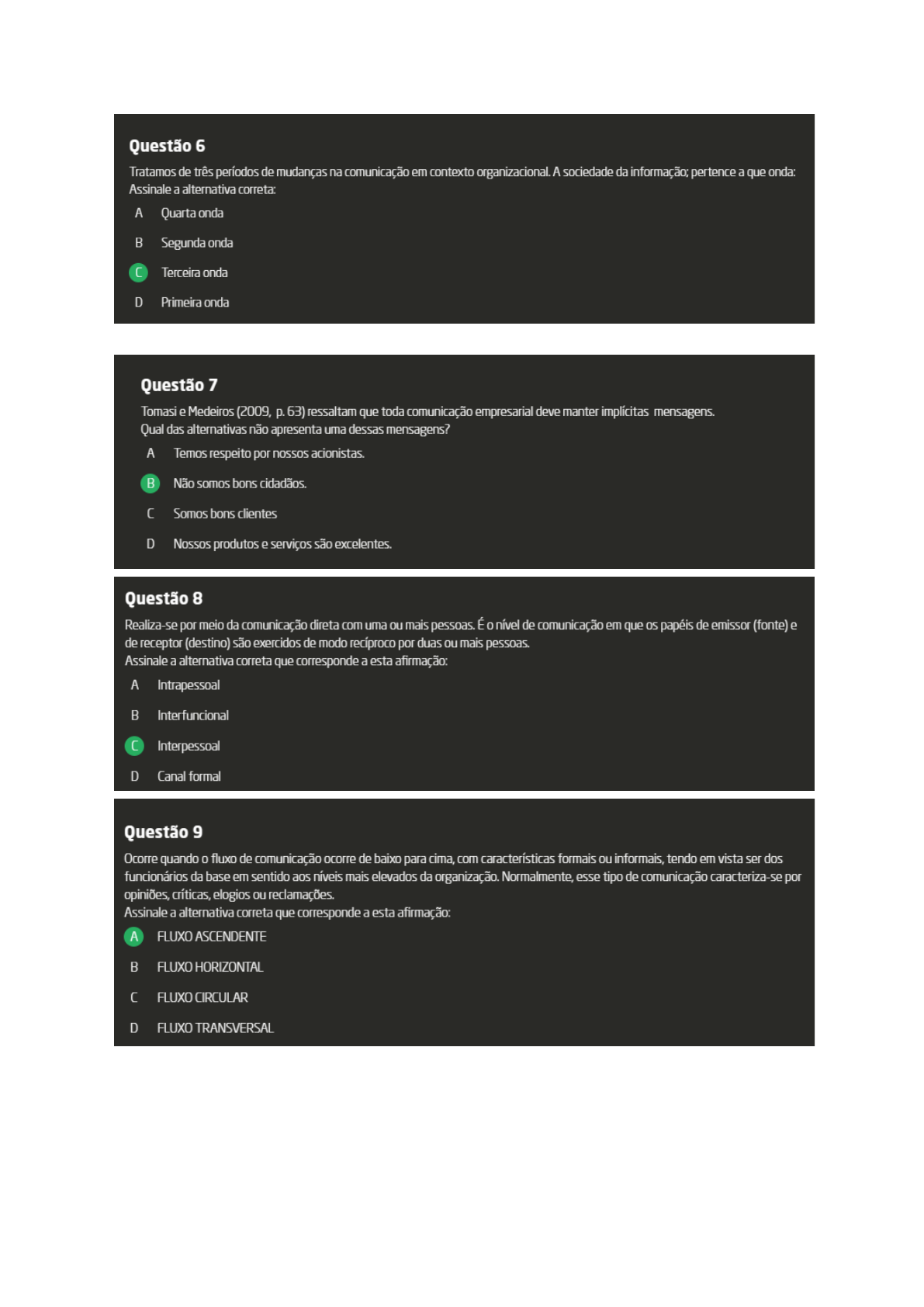 <p>Questão 6 Tratamos de três períodos de mudanças na comunicação em contexto organizacional. A sociedade da pertence a que onda: Assinale a alternativa correta: A Quarta onda B Segunda onda Terceira onda D Primeira onda Questão 7 Tomasi e Medeiros (2009, p. 63) ressaltam que toda comunicação empresarial deve manter implícitas mensagens. Qual das alternativas não apresenta uma dessas mensagens? A Temos respeito por nossos acionistas. B Não somos bons cidadãos. Somos bons clientes D Nossos produtos e serviços são excelentes. Questão 8 Realiza-se por meio da comunicação direta com uma ou mais pessoas. É nível de comunicação em que papéis de emissor (fonte) e de receptor (destino) são exercidos de modo recíproco por duas ou mais pessoas. Assinale a alternativa correta que corresponde a esta afirmação: A Intrapessoal B Interfuncional C Interpessoal D Canal formal Questão 9 Ocorre quando fluxo de comunicação ocorre de baixo para cima, com características formais ou informais, tendo em vista ser dos funcionários da base em sentido aos níveis mais elevados da organização. Normalmente, esse tipo de comunicação caracteriza-se por opiniões, críticas, elogios ou reclamações. Assinale a alternativa correta que corresponde a esta afirmação: A FLUXO ASCENDENTE B FLUXO HORIZONTAL FLUXO CIRCULAR D FLUXO TRANSVERSAL</p>