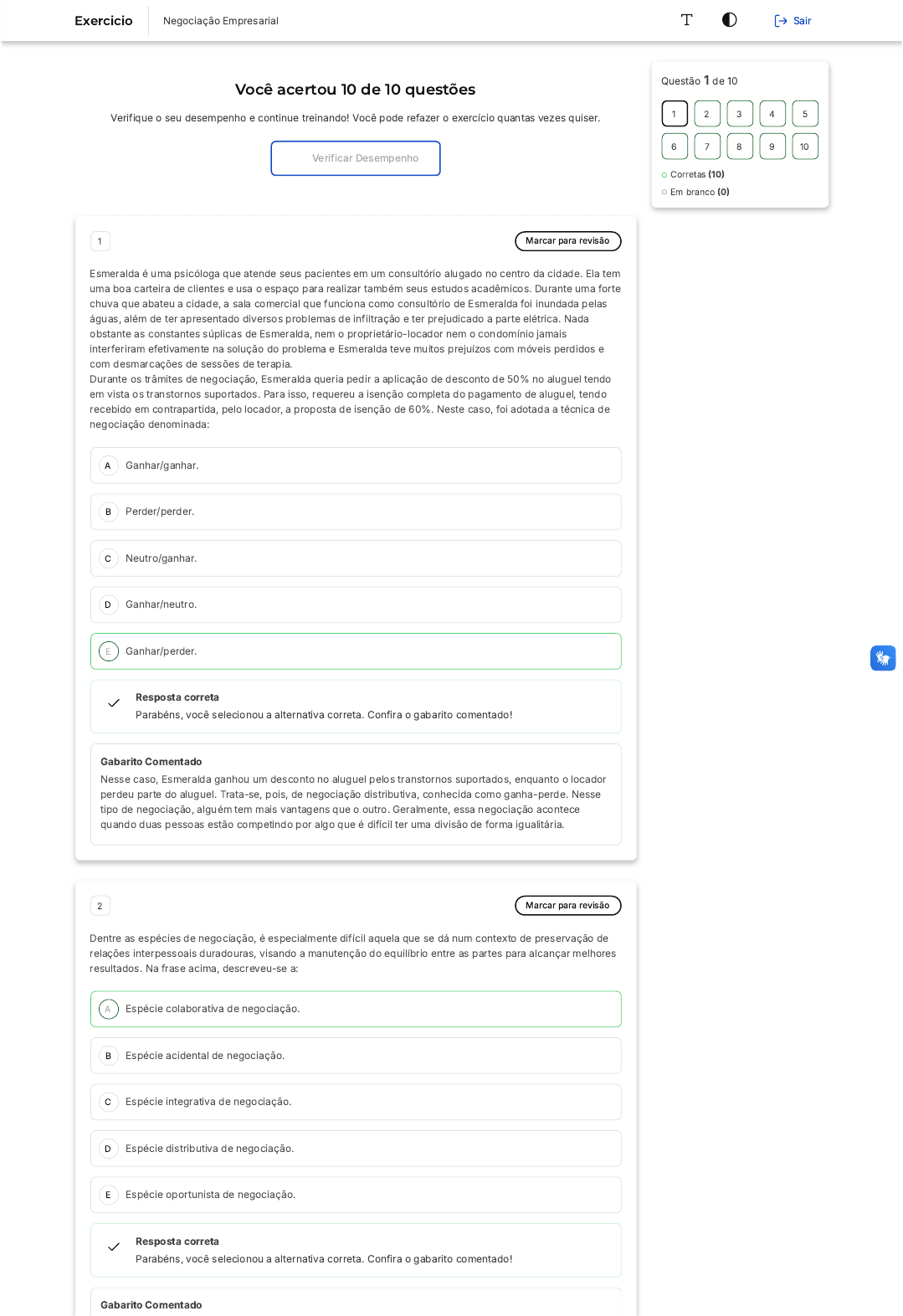 <p>Você acertou 10 de 10 questões</p><p>Verifique o seu desempenho e continue treinando! Você pode refazer o exercício quantas vezes quiser.</p><p>Verificar Desempenho</p><p>A</p><p>B</p><p>C</p><p>D</p><p>E</p><p>A</p><p>B</p><p>C</p><p>D</p><p>E</p><p>1 Marcar para revisão</p><p>Esmeralda é uma psicóloga que atende seus pacientes em um consultório alugado no centro da cidade. Ela tem</p><p>uma boa carteira de clientes e usa o espaço para realizar também seus estudos acadêmicos. Durante uma forte</p><p>chuva que abateu a cidade, a sala comercial que funciona como consultório de Esmeralda foi inundada pelas</p><p>águas, além de ter apresentado diversos problemas de infiltração e ter prejudicado a parte elétrica. Nada</p><p>obstante as constantes súplicas de Esmeralda, nem o proprietário-locador nem o condomínio jamais</p><p>interferiram efetivamente na solução do problema e Esmeralda teve muitos prejuízos com móveis perdidos e</p><p>com desmarcações de sessões de terapia.</p><p>Durante os trâmites de negociação, Esmeralda queria pedir a aplicação de desconto de 50% no aluguel tendo</p><p>em vista os transtornos suportados. Para isso, requereu a isenção completa do pagamento de aluguel, tendo</p><p>recebido em contrapartida, pelo locador, a proposta de isenção de 60%. Neste caso, foi adotada a técnica de</p><p>negociação denominada:</p><p>Ganhar/ganhar.</p><p>Perder/perder.</p><p>Neutro/ganhar.</p><p>Ganhar/neutro.</p><p>Ganhar/perder.</p><p>Resposta correta</p><p>Parabéns, você selecionou a alternativa correta. Confira o gabarito comentado!</p><p>Gabarito Comentado</p><p>Nesse caso, Esmeralda ganhou um desconto no aluguel pelos transtornos suportados, enquanto o locador</p><p>perdeu parte do aluguel. Trata-se, pois, de negociação distributiva, conhecida como ganha-perde. Nesse</p><p>tipo de negociação, alguém tem mais vantagens que o outro. Geralmente, essa negociação acontece</p><p>quando duas pessoas estão competindo por algo que é difícil ter uma divisão de forma igualitária.</p><p>2 Marcar para revisão</p><p>Dentre as espécies de negociação, é especialmente difícil aquela que se dá num contexto de preservação de</p><p>relações interpessoais duradouras, visando a manutenção do equilíbrio entre as partes para alcançar melhores</p><p>resultados. Na frase acima, descreveu-se a:</p><p>Espécie colaborativa de negociação.</p><p>Espécie acidental de negociação.</p><p>Espécie integrativa de negociação.</p><p>Espécie distributiva de negociação.</p><p>Espécie oportunista de negociação.</p><p>Resposta correta</p><p>Parabéns, você selecionou a alternativa correta. Confira o gabarito comentado!</p><p>Gabarito Comentado</p><p>Questão 1 de 10</p><p>Corretas �10�</p><p>Em branco �0�</p><p>1 2 3 4 5</p><p>6 7 8 9 10</p><p>Exercicio Negociação Empresarial Sair</p><p>A</p><p>B</p><p>C</p><p>D</p><p>E</p><p>A</p><p>B</p><p>C</p><p>D</p><p>E</p><p>A espécie de negociação descrita no enunciado é a colaborativa. Esta é caracterizada pela busca de</p><p>manutenção de relações interpessoais duradouras e equilíbrio entre as partes para alcançar resultados</p><p>benéficos para todos os envolvidos. É considerada uma das mais desafiadoras devido à necessidade de</p><p>preservar interesses de longo prazo. Diferentemente da negociação acidental, que ocorre com alguém que</p><p>provavelmente não será visto novamente, ou da integrativa, que não estabelece uma relação duradoura</p><p>com a outra parte, a negociação colaborativa visa a um relacionamento contínuo e equilibrado. A</p><p>negociação distributiva, por outro lado, é aquela em que uma parte tem vantagem sobre a outra, comum</p><p>quando duas pessoas disputam algo difícil de dividir, resultando em um ganho maior para um dos lados.</p><p>3 Marcar para revisão</p><p>Cristiano foi a uma loja de colchão a fim de adquirir um modelo novo para si e sua esposa Juliana. Chegando lá,</p><p>foi atendido pelo vendedor Marcos, que passou a exibir os modelos e seus respectivos preços. Sabendo que</p><p>os preços praticados na loja são um pouco acima da média do mercado, e visando a não afugentar o cliente,</p><p>Marcos decide estabelecer uma conexão íntima com Cristiano, criando empatia na relação vendedor-freguês e</p><p>estabelecendo um laço em comum. A essa técnica, dá-se o nome de:</p><p>MACNA.</p><p>Negociação distributiva.</p><p>Rapport.</p><p>ZOPA.</p><p>Espelhamento.</p><p>Resposta correta</p><p>Parabéns, você selecionou a alternativa correta. Confira o gabarito comentado!</p><p>Gabarito Comentado</p><p>Rapport é a técnica desenvolvida para uma parte estabelecer laços de proximidade com a outra, de</p><p>maneira a suavizar e possibilitar a negociação. MACNA é denominado como "melhor opção sem</p><p>acordo" e/ou uma melhor alternativa à negociação de um acordo. Melhor alternativa à negociação de um</p><p>acordo, pois, às vezes, determinadas negociações chegam a um impasse ou, até mesmo, utilizam-se de</p><p>parâmetros mínimos e máximos para margem à negociação. Na negociação distributiva, um tem vantagem</p><p>sobre o outro. Normalmente, esse tipo de negociação acontece quando duas pessoas estão brigando por</p><p>algo difícil de dividir. Assim, alguém acaba ganhando mais. ZOPA representa áreas de possível acordo, só</p><p>podem ser encontradas quando ambas as partes veem seus próprios interesses e os dos outros.</p><p>Espelhamento é uma técnica de negociação que busca criar conexão através do espelhamento do</p><p>comportamento da outra parte.</p><p>4 Marcar para revisão</p><p>�Fundação CESGRANRIO/2010� Uma empresa americana de grande porte do setor de varejo, a Giga S.A., que já</p><p>possui unidades em diversos países, está pensando em expandir suas operações para a Índia. Para acelerar o</p><p>processo de entrada no mercado desse país, porém, ela decide comprar uma 