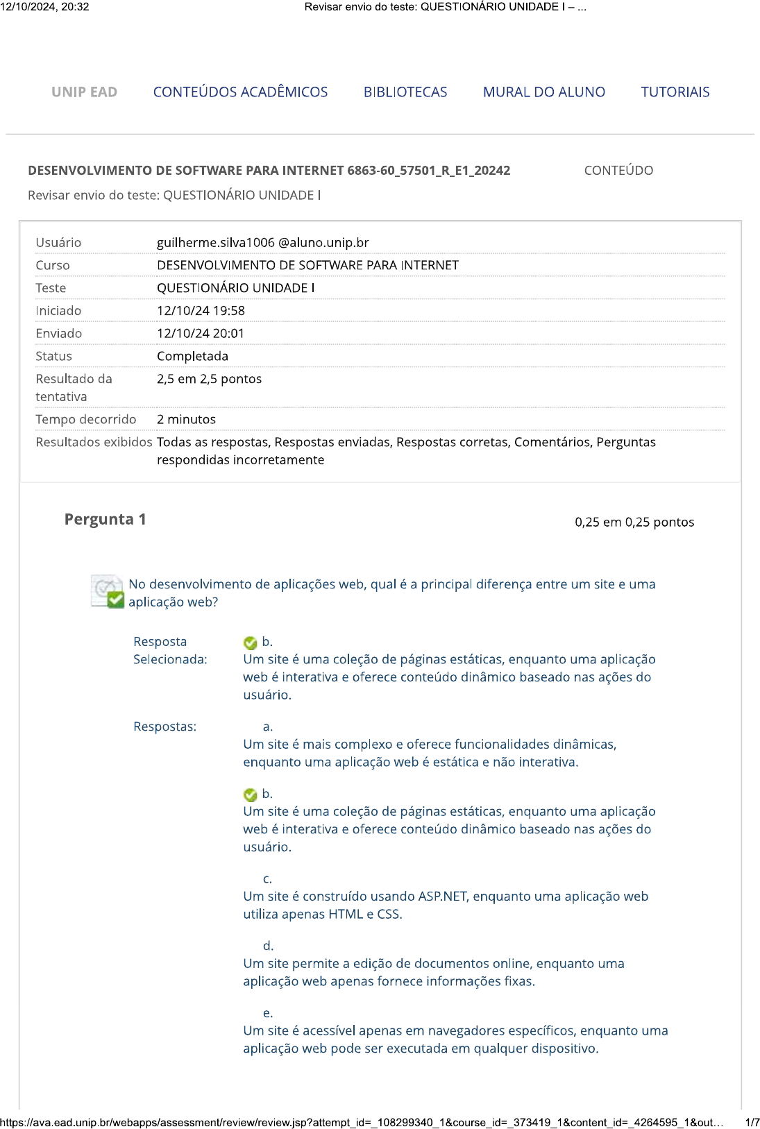 <p>12/10/2024, 20:32 Revisar envio do teste: QUESTIONÁRIO UNIDADE - UNIP EAD CONTEÚDOS ACADÊMICOS BIBLIOTECAS MURAL DO ALUNO TUTORIAIS DESENVOLVIMENTO DE SOFTWARE PARA INTERNET 6863-60_57501_R_E1_20242 CONTEÚDO Revisar envio do teste: QUESTIONÁRIO UNIDADE Usuário guilherme.silva1006@aluno.unip.b Curso DESENVOLVIMENTO DE SOFTWARE PARA INTERNET Teste QUESTIONÁRIO UNIDADE Iniciado 12/10/24 19:58 Enviado 12/10/24 20:01 Status Completada Resultado da 2,5 em 2,5 pontos tentativa Tempo decorrido 2 minutos Resultados exibidos Todas as respostas, Respostas enviadas, Respostas corretas, Comentários, Perguntas respondidas incorretamente Pergunta 1 0,25 em 0,25 pontos No desenvolvimento de aplicações web, qual é a principal diferença entre um site e uma aplicação web? Resposta b. Selecionada: Um site é uma coleção de páginas estáticas, enquanto uma aplicação web é interativa e oferece conteúdo dinâmico baseado nas ações do usuário. Respostas: a. Um site é mais complexo e oferece funcionalidades dinâmicas, enquanto uma aplicação web é estática e não interativa. b. Um site é uma coleção de páginas estáticas, enquanto uma aplicação web é interativa e oferece conteúdo dinâmico baseado nas ações do usuário. C. Um site é construído usando ASP.NET, enquanto uma aplicação web utiliza apenas HTML e CSS. d. Um site permite a edição de documentos online, enquanto uma aplicação web apenas fornece informações fixas. e. Um site é acessível apenas em navegadores específicos, enquanto uma aplicação web pode ser executada em qualquer dispositivo. 1/7</p><p>12/10/2024, 20:32 Revisar envio do teste: QUESTIONÁRIO UNIDADE Comentário da Resposta: B resposta: Comentário: Um site é tipicamente uma coleção de páginas web estáticas que fornecem informações fixas, enquanto uma aplicação web é interativa, permitindo que os usuários realizem tarefas como editar documentos e interagir com outros usuários. Pergunta 2 0,25 em 0,25 pontos O que é uma API no contexto do desenvolvimento de aplicações web? Resposta b. Selecionada: Um conjunto de regras e ferramentas para construir e integrar software de aplicações. Respostas: a. Um tipo de banco de dados usado para armazenar dados da aplicação. b. Um conjunto de regras e ferramentas para construir e integrar software de aplicações. Um serviço que hospeda sites estáticos na web. C. d. Uma linguagem de programação usada para desenvolver aplicações web. e. Um protocolo de segurança para proteger dados durante a transmissão. Comentário da Resposta: B resposta: Comentário: Uma API (Interface de Programação de Aplicações) é um conjunto de regras, protocolos e ferramentas para construir software e permitir que diferentes aplicações se comuniquem entre Pergunta 3 0,25 em 0,25 pontos Qual é a função principal do middleware em uma aplicação ASP.NET Core? Resposta C. Selecionada: Inserir lógica customizada no pipeline de processamento de requisições HTTP.</p><p>12/10/2024, 20:32 Revisar envio do teste: QUESTIONÁRIO UNIDADE Respostas: a. Gerenciar a autenticação e autorização de usuários. b. Servir arquivos estáticos como HTML, CSS e JavaScript. C. Inserir lógica customizada no pipeline de processamento de requisições HTTP. d. Configurar o ambiente de desenvolvimento da aplicação. e. Realizar a compilação e execução da aplicação em modo de depuração. Comentário da Resposta: C resposta: Comentário: middleware permite a inserção de lógica customizada no pipeline de processamento de requisições HTTP, facilitando a implementação de funcionalidades como autenticação e autorização. Pergunta 4 0,25 em 0,25 pontos Qual é uma vantagem importante do ASP.NET Core em relação ao ASP.NET Framework? Resposta C. Selecionada: ASP.NET Core oferece suporte para desenvolvimento multiplataforma. Respostas: a. ASP.NET Core suporta apenas a linguagem de programação C#. b. ASP.NET Core é restrito ao sistema operacional Windows. C. ASP.NET Core oferece suporte para desenvolvimento multiplataforma. d. ASP.NET Core não suporta a criação de APIs RESTful. e. ASP.NET Core não possui integração com bibliotecas de terceiros. Comentário da Resposta: C resposta: Comentário: Uma das principais vantagens do ASP.NET Core é sua capacidade multiplataforma, permitindo que aplicações web sejam desenvolvidas e executadas em Windows, Linux e Pergunta 5 0,25 em 0,25 pontos 3/7</p><p>12/10/2024, 20:32 Revisar envio do teste: QUESTIONÁRIO UNIDADE O que caracteriza uma aplicação web dinâmica? Resposta d. Selecionada: Adapta o conteúdo exibido com base nas ações e interações do usuário, utilizando tecnologias de servidor. Respostas: Utiliza apenas HTML e CSS para apresentar conteúdo. a. b. Não interage com o usuário e não muda de acordo com suas ações. C. Fornece conteúdo fixo que não muda, independentemente da interação do usuário. d. Adapta o conteúdo exibido com base nas ações e interações do usuário, utilizando tecnologias de servidor. e. Não requer a instalação de um servidor web para funcionar. Comentário da Resposta: D resposta: Comentário: Uma aplicação web dinâmica adapta o conteúdo exibido com base nas ações e interações do usuário, utilizando tecnologias de servidor como ASP.NET, PHP, Java, ou Node.js. Pergunta 6 0,25 em 0,25 pontos Qual é a principal função do arquivo em um projeto ASP.NET Core? Resposta d. Selecionada: Armazenar as configurações da aplicação, como strings de conexão e configurações de ambiente. Respostas: a. Armazenar os controladores e modelos da aplicação. b. Configurar os serviços e o pipeline de processamento de requisições. C. Gerenciar as dependências e bibliotecas do projeto. d. Armazenar as configurações da aplicação, como strings de conexão e configurações de ambiente. e. Facilitar a integração com serviços externos como APIs de terceiros. Comentário da Resposta: D resposta: Comen