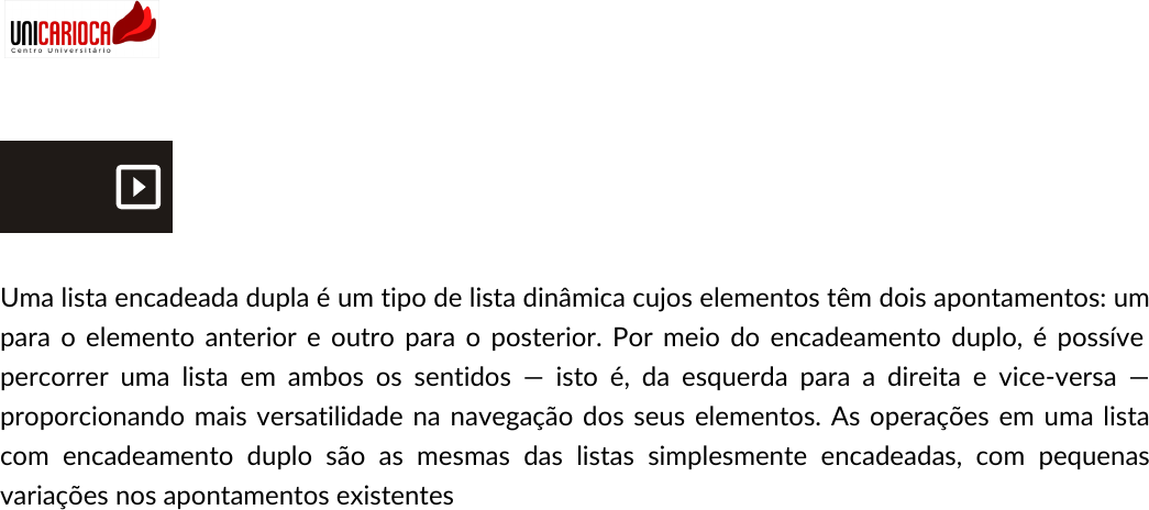 <p>Listas encadeadas duplas</p><p>Apresentação</p><p>Uma lista encadeada dupla é um tipo de lista dinâmica cujos elementos têm dois apontamentos: um</p><p>para o elemento anterior e outro para o posterior. Por meio do encadeamento duplo, é possível</p><p>percorrer uma lista em ambos os sentidos — isto é, da esquerda para a direita e vice-versa —</p><p>proporcionando mais versatilidade na navegação dos seus elementos. As operações em uma lista</p><p>com encadeamento duplo são as mesmas das listas simplesmente encadeadas, com pequenas</p><p>variações nos apontamentos existentes.</p><p>Nesta Unidade de Aprendizagem, você vai estudar sobre o uso, a navegação e as operações com</p><p>listas encadeadas duplas.</p><p>Bons estudos.</p><p>Ao final desta Unidade de Aprendizagem, você deve apresentar os seguintes aprendizados:</p><p>Identificar o uso de uma lista encadeada dupla.•</p><p>Reconhecer a navegação em uma lista encadeada dupla para inserir, remover, atualizar e</p><p>consultar valores.</p><p>•</p><p>Aplicar a implementação de listas encadeadas duplas.•</p><p>Laiane</p><p>Desafio</p><p>Uma lista dinâmica com encadeamento duplo é um conjunto de elementos ligados em sequência,</p><p>no qual os elementos estão encadeados de modo que cada um aponte para o próximo e para o</p><p>anterior, formando, assim, uma cadeia de dois sentidos.</p><p>Nesse tipo de lista, o anterior do primeiro elemento e o posterior do último apontam para NULL,</p><p>indicando o início e o final da lista, respectivamente. Diversas operações podem ser implementadas,</p><p>sendo as mais comuns: a inclusão, a exclusão e a impressão.</p><p>Com base nisso, sua tarefa, neste desafio, é declarar uma lista dinâmica duplamente encadeada e</p><p>implementar os seguintes métodos na linguagem C:</p><p>- Inicializar a lista;</p><p>- Inserir elemento no início;</p><p>- Inserir elemento no final;</p><p>- Excluir elemento do meio da lista;</p><p>- Imprimir a lista nos dois sentidos;</p><p>- Excluir toda a lista.</p><p>Use como base da lista uma estrutura com os seguintes atributos: nome, nota e turma, conforme</p><p>segue:</p><p>typedef struct {</p><p>char nome[20];</p><p>float nota;</p><p>int turma;</p><p>} Aluno;</p><p>Após implementar a lista e os métodos, faça algumas operações de inserção e exclusão para testar</p><p>as funcionalidades do exercício e apresente o resultado da tela. O principal método desse exercício</p><p>é o que exclui elementos do meio da lista, sendo que os outros servirão de apoio para o</p><p>desenvolvimento deste.</p><p>Infográfico</p><p>Listas são estruturas bastante utilizadas em sistemas computacionais, sendo que diversos dados</p><p>podem ser apresentados em listas, como a relação de alunos de uma escola, por exemplo. Entre os</p><p>tipos de listas que existem na estrutura de dados, a lista com encadeamento duplo destaca-se por</p><p>não definir uma quantidade limitada de itens na sua criação e por otimizar a memória do</p><p>dispositivo, alocando apenas o espaço necessário para acomodar os elementos, bem como ter a</p><p>capacidade de incluir e excluir itens de qualquer posição, podendo realizar a navegação em ambos</p><p>os sentidos.</p><p>Laiane</p><p>Conteúdo do livro</p><p>Listas encadeadas duplas são estruturas cujos itens estão dispostos em sequência, como uma</p><p>cadeia de elementos. Nesse tipo de lista, os elementos devem ser ligados por meio de dois</p><p>apontamentos, isto é, um que aponta para o elemento anterior e outro para o elemento posterior,</p><p>possibilitando navegar em ambos os sentidos da lista. Diversas operações podem ser implementas</p><p>em listas duplamente encadeadas, permitindo, assim, seu uso em inúmeros domínios de aplicação</p><p>na disciplina Estrutura de Dados.</p><p>Na obra Estrutura de dados, leia o capítulo Listas encadeadas duplas, base teórica desta Unidade de</p><p>Aprendizagem, onde você vai estudar sobre o uso, a navegação e as operações com listas dinâmicas</p><p>duplamente encadeadas.</p><p>Boa leitura.</p><p>Laiane</p><p>Laiane</p><p>ESTRUTURA</p><p>DE DADOS</p><p>Mauricio Saraiva</p><p>Listas encadeadas duplas</p><p>Objetivos de aprendizagem</p><p>Ao final deste texto, você deve apresentar os seguintes aprendizados:</p><p> Identificar o uso de uma lista encadeada dupla.</p><p> Reconhecer a navegação em uma lista encadeada dupla para inserir,</p><p>remover, atualizar e consultar valores.</p><p> Aplicar a implementação de listas encadeadas duplas.</p><p>Introdução</p><p>Uma lista encadeada dupla é um tipo de lista dinâmica em que os ele-</p><p>mentos têm dois apontamentos: um para o elemento anterior e outro para</p><p>o elemento posterior. Com o encadeamento duplo, é possível percorrer</p><p>uma lista em ambos os sentidos, isto é, da esquerda para a direita e vice-</p><p>-versa, proporcionando mais versatilidade na navegação dos elementos</p><p>da lista. As operações em uma lista com encadeamento duplo são as</p><p>mesmas das listas simplesmente encadeadas, com pequenas variações</p><p>nos apontamentos existentes.</p><p>Neste capítulo, você vai estudar sobre o uso, a navegação e as ope-</p><p>rações com listas encadeadas duplas.</p><p>Lista encadeada dupla</p><p>Assim como uma lista encadeada simples, uma lista encadeada dupla é uma</p><p>relação de elementos ligados como uma sequência de itens. No entanto, no</p><p>encadeamento duplo, os elementos têm dois apontamentos, isto é, um para o</p><p>elemento anterior e outro para o posterior (EDELWEISS; GALANTE, 2009).</p><p>O primeiro e o último elementos da lista têm apenas um apontamento para</p><p>outros elementos, sendo que o anterior do primeiro e o posterior ao último</p><p>apontam para NULL, indicando o início e o final da lista, respectivamente,</p><p>como ilustrado a Figura 1.</p><p>Laiane</p><p>Laiane</p><p>Figura 1. Apresentação de uma lista encadeada dupla.</p><p>a pe1