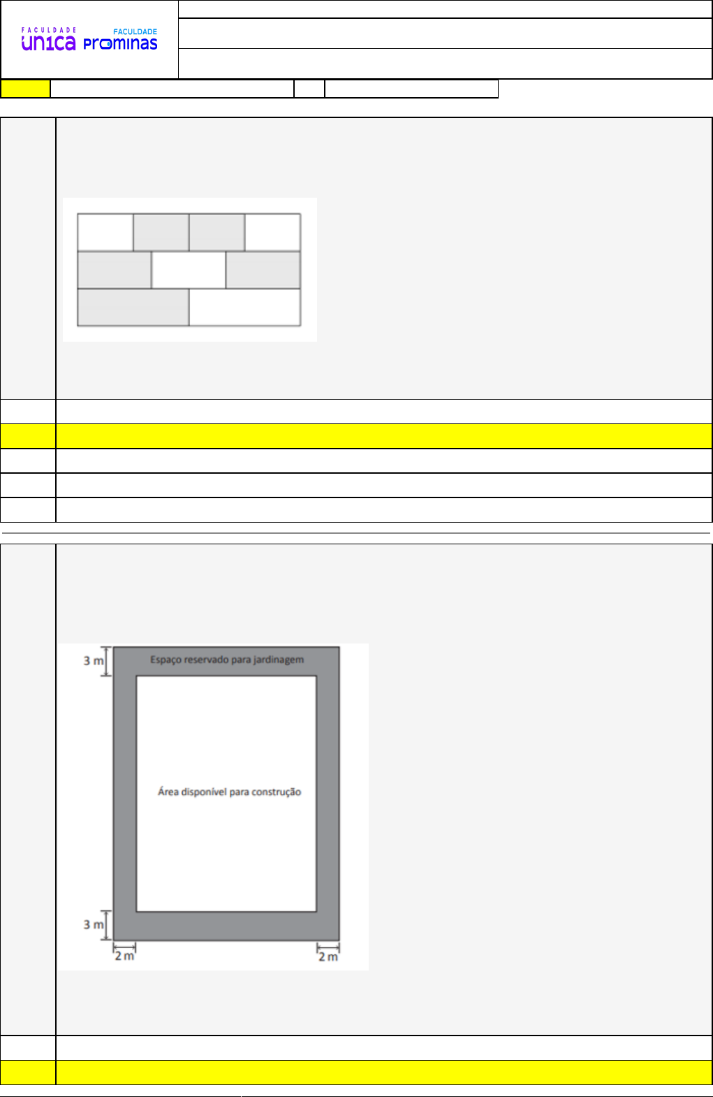 <p>04/08/2024 22:07:52 1/4</p><p>REVISÃO DE SIMULADO</p><p>Nome:</p><p>ROGERIO DE OLIVEIRA SOARES</p><p>Disciplina:</p><p>Fundamentos da Matemática I e II</p><p>Respostas corretas são marcadas em amarelo X Respostas marcardas por você.</p><p>Questão</p><p>001 (OBMEP – 2013) A figura representa um retângulo de área 36 m², dividido em três</p><p>faixas de mesma largura. Cada uma das faixas está dividida em partes iguais: uma em</p><p>quatro partes, outra em três e a terceira em duas. Qual é a área total das partes</p><p>sombreadas?</p><p>A) 24 m²</p><p>X B) 20 m²</p><p>C) 26 m²</p><p>D) 18 m²</p><p>E) 22 m²</p><p>Questão</p><p>002 (Enade – 2017 – Adaptado) Uma construtora, com o objetivo de valorizar as áreas</p><p>verdes, apresentou um projeto de loteamento, com terrenos retangulares, onde cada</p><p>residência construída terá um jardim ao seu redor. Em cada terreno deverão ser</p><p>reservados 3 metros na frente, 3 metros no fundo e 2 metros em cada lateral para</p><p>jardinagem, conforme ilustra a figura a seguir:</p><p>Considerando-se que a área disponível para construção será de 600 m² com 20 m de</p><p>largura, a área mínima do terreno que atende às especificações exigidas pela</p><p>construtora será de</p><p>A) 726 m²</p><p>X B) 864 m²</p><p>04/08/2024 22:07:52 2/4</p><p>C) 924 m²</p><p>D) 610 m²</p><p>E) 606 m²</p><p>Questão</p><p>003 (Enem-2011) Em uma certa cidade, os moradores de um bairro carente de espaços de</p><p>lazer reivindicam à prefeitura municipal a construção de uma praça. A prefeitura</p><p>concorda com a solicitação e afirma que irá construí-la em formato retangular devido às</p><p>características técnicas do terreno. Restrições de natureza orçamentária impõem que</p><p>sejam gastos, no máximo, 180 m de tela para cercar a praça. A prefeitura apresenta</p><p>aos moradores desse bairro as medidas dos terrenos disponíveis para a construção da</p><p>praça:</p><p>Terreno 1: 55 m por 45 m</p><p>Terreno 2: 55 m por 55 m</p><p>Terreno 3: 60 m por 30 m</p><p>Terreno 4: 70 m por 20 m</p><p>Terreno 5: 95 m por 85 m</p><p>Para optar pelo terreno de maior área, que atenda às restrições impostas pela</p><p>prefeitura, os moradores deverão escolher o terreno.</p><p>A) 4</p><p>B) 1</p><p>C) 5</p><p>X D) 3</p><p>E) 2</p><p>Questão</p><p>004 Preciso colocar arame farpado em volta de um terreno retangular que mede 0,2 km de</p><p>largura e 0,3 km de comprimento. Quantos metros de arame farpado devem usar?</p><p>A) 60000 m</p><p>B) 500 m</p><p>X C) 1000 m</p><p>D) 600 m</p><p>E) 7000 m</p><p>Questão</p><p>005 Analise as alternativas a seguir e marque a opção CORRETA.</p><p>A) Uma piscina em formato retangular possui dimensões iguais a 10m de profundidade,</p><p>16m de largura e 131m de comprimento. Assim, é correto afirmar que a área da base é</p><p>1310 m².</p><p>B) Um triângulo equilátero com lado igual a 75 cm terá um perímetro igual a 150 cm.</p><p>C) Um quadrado com aresta de 37cm terá uma área igual a 443cm².</p><p>D) Um quadrado de lado 20 cm, possui 400 cm de perímetro.</p><p>X E) Um círculo com raio medindo 15 cm, possui 706,5 cm² de área.</p><p>04/08/2024 22:07:52 3/4</p><p>Questão</p><p>006 (Quadrix – 2020) Segundo um aplicativo que traça rotas, a distância entre Gramado e</p><p>Capão da Canoa é de aproximadamente 153 km. Bento possui um automóvel que é</p><p>capaz de percorrer, na estrada, 9 km com 1 L de gasolina. Certo dia, ele encheu</p><p>totalmente o tanque de seu carro com gasolina e fez o trajeto Gramado – Capão da</p><p>Canoa. Após percorrer os 153 km, percebeu que ainda restavam, no tanque de seu</p><p>carro, 38 L de gasolina.</p><p>Com base nesse caso hipotético, é correto afirmar que a capacidade total do tanque do</p><p>carro de Bento é igual a</p><p>A) 17 l</p><p>B) 45 l</p><p>C) 50 l</p><p>X D) 55 l</p><p>E) 52 l</p><p>Questão</p><p>007 (UNIRG TO/2020) No livro intitulado “Elementos”, do matemático grego Euclides de</p><p>Alexandria (300 a.C), há um quadrado de lado a, a partir do qual Euclides procura</p><p>encontrar a área de outro quadrado, destacado em cinza, na figura a seguir.</p><p>Desse modo, a área do quadrado destacado em cinza na figura é obtida pela expressão:</p><p>X A) (a-b)2=a2+b2-2ab</p><p>B) (a+b)2=a2+b2+2ab</p><p>C) a2=(a-b)2-2ab</p><p>D) a2=(a-b)2+2ab</p><p>E) (a+b)2=a2-b2+2ab</p><p>04/08/2024 22:07:52 4/4</p><p>Questão</p><p>008 (Quadrix – 2020) Um arquiteto projetou uma piscina infantil em forma de elipse, a ser</p><p>construída em um clube público da região metropolitana de Porto Alegre. Agora, precisa</p><p>fazer um orçamento para saber quanto custará a instalação do piso antiderrapante em</p><p>volta dela. A imagem a seguir exibe a piscina e a região externa a ela, onde será</p><p>instalado o piso, bem como a área que a piscina ocupa, em m², e as dimensões do</p><p>retângulo onde ela será instalada.</p><p>Após fazer a cotação, o arquiteto escolheu o</p><p>orçamento de menor preço, que foi o do sr. José, que cobra R$ 25,00 por m2 de piso</p><p>instalado. Sendo assim, assinale a alternativa que apresenta o valor total que o sr. José</p><p>receberá após concluir o serviço.</p><p>A) R$ 640,25.</p><p>B) R$ 700,25.</p><p>C) R$ 620,25.</p><p>D) R$ 660,25.</p><p>X E) R$ 720,25.</p>