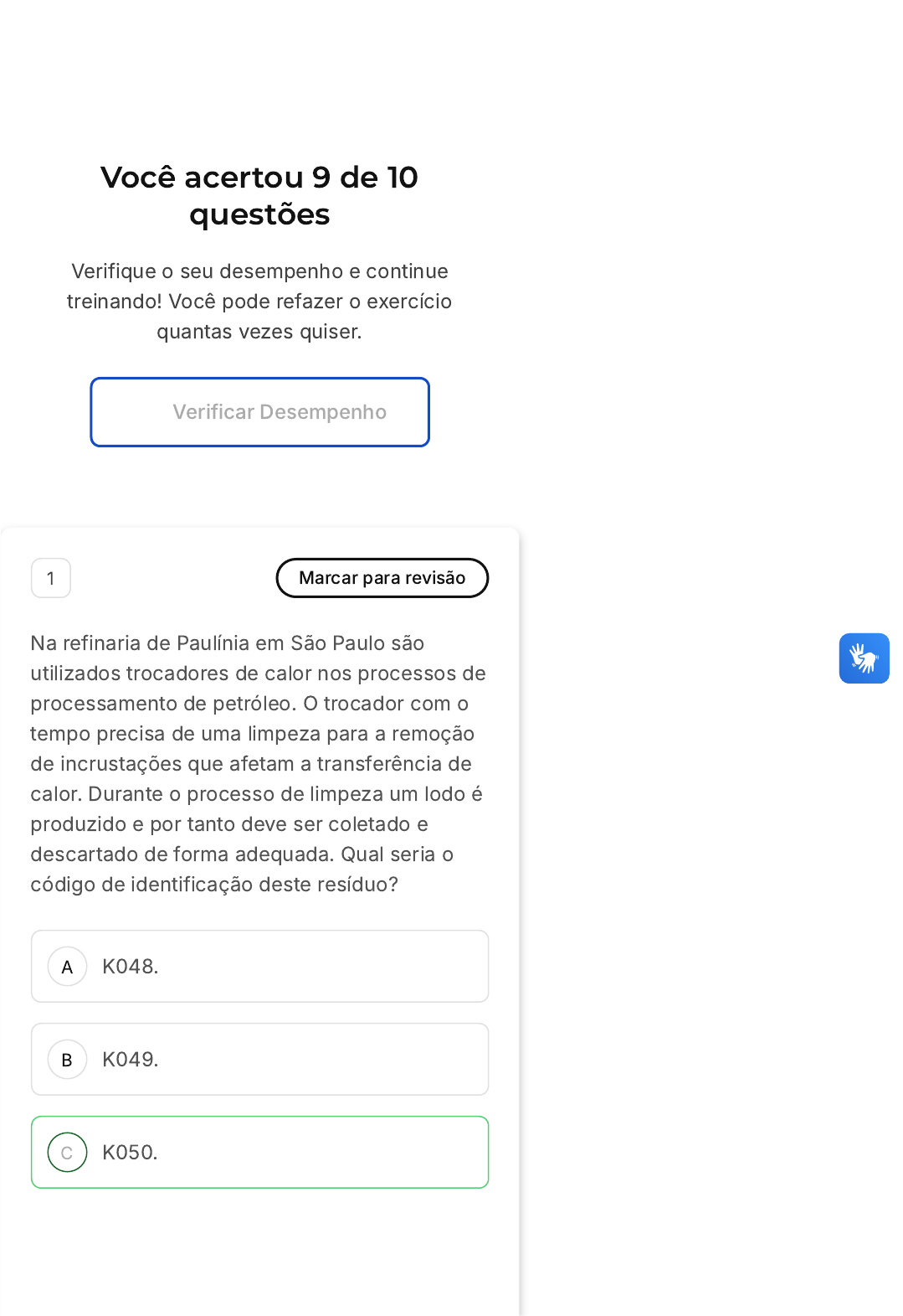 <p>Você acertou 9 de 10</p><p>questões</p><p>Verifique o seu desempenho e continue</p><p>treinando! Você pode refazer o exercício</p><p>quantas vezes quiser.</p><p>Verificar Desempenho</p><p>A</p><p>B</p><p>C</p><p>1 Marcar para revisão</p><p>Na refinaria de Paulínia em São Paulo são</p><p>utilizados trocadores de calor nos processos de</p><p>processamento de petróleo. O trocador com o</p><p>tempo precisa de uma limpeza para a remoção</p><p>de incrustações que afetam a transferência de</p><p>calor. Durante o processo de limpeza um lodo é</p><p>produzido e por tanto deve ser coletado e</p><p>descartado de forma adequada. Qual seria o</p><p>código de identificação deste resíduo?</p><p>K048.</p><p>K049.</p><p>K050.</p><p>D</p><p>E</p><p>K051.</p><p>K052.</p><p>Resposta correta</p><p>Parabéns, você selecionou a</p><p>alternativa correta. Confira o</p><p>gabarito comentado!</p><p>Gabarito Comentado</p><p>Sabemos que a origem é da indústria de</p><p>refino de petróleo, podemos então utilizada</p><p>o anexo B da NBR 10004�2004 e é</p><p>identificado pelo código K050, lodos</p><p>provenientes da limpeza dos tubos de</p><p>trocadores de calor na indústria de refino, e</p><p>o seu principal agente poluidor é o cromo</p><p>hexavalente.</p><p>2 Marcar para revisão</p><p>A caracterização de resíduos sólidos é muito</p><p>importante para facilitar o processo de</p><p>classificação. Uma característica física é o</p><p>conteúdo de umidade. Uma amostra apresenta</p><p>uma massa total de 15 kg e após um processo</p><p>de secagem observou-se que 1 kg de água</p><p>foram evaporados. Qual é o conteúdo de</p><p>umidade da amostra?</p><p>A</p><p>B</p><p>C</p><p>D</p><p>E</p><p>6,6%.</p><p>7,5%.</p><p>15%.</p><p>1%.</p><p>10%.</p><p>Resposta correta</p><p>Parabéns, você selecionou a</p><p>alternativa correta. Confira o</p><p>gabarito comentado!</p><p>Gabarito Comentado</p><p>3 Marcar para revisão</p><p>O descarte correto de resíduos é regulado por</p><p>normas. Uma empresa petroquímica utiliza</p><p>tanques de armazenamento de etilbenzeno. Se</p><p>algum dia esse tanque for descartado com</p><p>resíduos de etilbenzeno, podemos considerar</p><p>esse resíduo como?</p><p>A</p><p>B</p><p>C</p><p>D</p><p>E</p><p>Classe I - inflamável.</p><p>Classe II A - não inerte.</p><p>Classe II B - inerte.</p><p>Classe I - corrosivo.</p><p>Classe I - infeccioso.</p><p>Resposta correta</p><p>Parabéns, você selecionou a</p><p>alternativa correta. Confira o</p><p>gabarito comentado!</p><p>Gabarito Comentado</p><p>O tanque, independentemente do material</p><p>de que é feito, se contaminado por</p><p>etilbenzeno, é classificado de acordo com</p><p>o anexo A da NBR 10004�2004. Segundo</p><p>essa norma, o resíduo é identificado pelo</p><p>código F003, que corresponde à</p><p>característica de ser inflamável. Portanto, o</p><p>resíduo de etilbenzeno é classificado como</p><p>Classe I - inflamável.</p><p>4 Marcar para revisão</p><p>A caracterização de resíduos sólidos é muito</p><p>importante para facilitar o processo de</p><p>classificação. Uma característica física é o</p><p>conteúdo de umidade. Uma amostra apresenta</p><p>A</p><p>B</p><p>C</p><p>D</p><p>E</p><p>uma massa total de 15 kg e após um processo</p><p>de secagem observou-se que 1 kg de água</p><p>foram evaporados. Qual é a massa em base</p><p>seca da amostra?</p><p>6,01 kg.</p><p>7,5 kg.</p><p>15 kg.</p><p>2,01 kg.</p><p>14,01 kg.</p><p>Resposta correta</p><p>Parabéns, você selecionou a</p><p>alternativa correta. Confira o</p><p>gabarito comentado!</p><p>Gabarito Comentado</p><p>A</p><p>B</p><p>C</p><p>D</p><p>E</p><p>5 Marcar para revisão</p><p>Duas cidades apresentaram na sua amostragem</p><p>de resíduos sólidos a seguinte composição.</p><p>Qual cidade gera mais cinza em base per</p><p>capita?</p><p>Cidade 1 com 0,14 kg/pessoa - dia.</p><p>Cidade 2 com 0,03 kg/pessoa - dia.</p><p>Cidade 2 com 0,14 kg/pessoa - dia.</p><p>Cidade 1 com 0,03 kg/pessoa - dia.</p><p>Ambas geram a mesma quantidade.</p><p>Resposta correta</p><p>Parabéns, você selecionou a</p><p>alternativa correta. Confira o</p><p>gabarito comentado!</p><p>Gabarito Comentado</p><p>A</p><p>B</p><p>C</p><p>D</p><p>E</p><p>6 Marcar para revisão</p><p>Um resíduo sólido foi encontrado num</p><p>laboratório sem nenhum rótulo. No entanto, o</p><p>técnico do laboratório verificou que dentro da</p><p>capela em condições ambiente de temperatura</p><p>e pressão houve uma ignição. Podemos</p><p>classificar esse resíduo como:</p><p>Reativo.</p><p>Corrosivo.</p><p>Inflamável.</p><p>Tóxico.</p><p>Patogênico.</p><p>Questão 8 de 10</p><p>Corretas �9�</p><p>Incorretas �1�</p><p>Em branco �0�</p><p>1 2 3 4 5</p><p>6 7 8 9 10</p><p>Exercicio</p><p>Caracterização Dos</p><p>Resíduos Sólido</p><p>Sair</p><p>A</p><p>B</p><p>Resposta correta</p><p>Parabéns, você selecionou a</p><p>alternativa correta. Confira o</p><p>gabarito comentado!</p><p>Gabarito Comentado</p><p>O resíduo em questão, ao entrar em ignição</p><p>em condições normais de temperatura e</p><p>pressão �1 atm e 25°C�, demonstra uma</p><p>característica típica de substâncias</p><p>inflamáveis. Portanto, a classificação</p><p>correta para esse resíduo é "inflamável".</p><p>Essas substâncias são capazes de produzir</p><p>fogo por fricção, faísca ou pelo calor do</p><p>ambiente, se este estiver acima de um</p><p>determinado limiar. É importante identificar</p><p>corretamente esses resíduos para garantir</p><p>o manuseio e descarte adequados,</p><p>evitando acidentes.</p><p>7 Marcar para revisão</p><p>Você trabalha numa oficina e seu chefe solicita</p><p>dar descarte de galões de óleo lubrificante</p><p>usados. Você lembra da aula em tratamento de</p><p>resíduos e sabe que deve ser descartada por</p><p>uma empresa especializada, mas para facilitar o</p><p>trabalho deles você decidiu classificar ele</p><p>como:</p><p>C