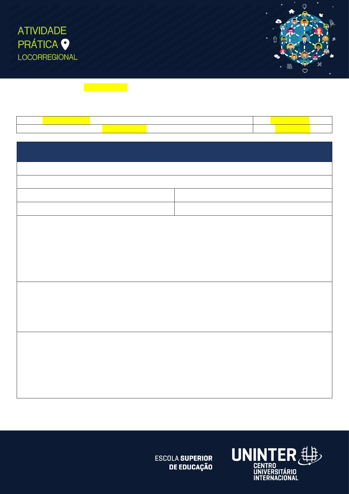 <p>TEMPLATE – ATIVIDADE PRÁTICA LOCORREGIONAL</p><p>METODOLOGIA DO TRABALHO DE CAMPO</p><p>Nome: Nome do aluno</p><p>RU: 0000000000</p><p>Polo de Apoio Presencial: Nome do Polo</p><p>Data: 01/01/2000</p><p>ROTEIRO DE CAMPO</p><p>Tema: inserir tema</p><p>Município: município da atividade</p><p>Ponto de Partida: local de partida</p><p>Ponto Final: local de chegada</p><p>Horário inicial: 12h00</p><p>Horário final: 00h00</p><p>Condições necessárias: verificar as condições para visitação, horário de funcionamento, documentações necessárias, melhores dias da semana para visitação, condições meteorológicas necessárias, necessidade ou não de transporte.</p><p>Vestimentas: verificar as exigências do local a ser visitado, roupas e sapatos confortáveis, capa de chuva, óculos de sol, boné, chapéu e outras vestimentas necessárias.</p><p>Documentos e demais acessórios: Inserir informação sobre necessidade de portar documento com foto, protetor solar, garrafa com água, repelente, lanche.</p><p>Objetivo Geral: escreva o objetivo geral da atividade em no máximo 2 a linhas.</p><p>Objetivo Específico: pontue os objetivos específicos (máximo 5 objetivos)</p><p>Metodologia: Insira aqui os procedimentos metodológicos a serem realizados, visita, coleta de materiais, observação, equipamentos necessários.</p><p>Roteiro: Inserir informações de caracterização da área, mapa de localização com os pontos que serão visitados, descrição do conteúdo que será trabalhado em cada um dos pontos de parada.</p><p>Referências: Insira as referências bibliográficas utilizadas para desenvolver essa atividade de campo. (máximo 5 referências)</p><p>RELATO DE PLANEJAMENTO DO CAMPO</p><p>Inserir as imagens coletadas dos pontos durante o pré-campo, as anotações e demais análises sobre o planejamento do trabalho de campo e suas etapas. Máximo dois parágrafos mais fotos.</p><p>image2.png</p>