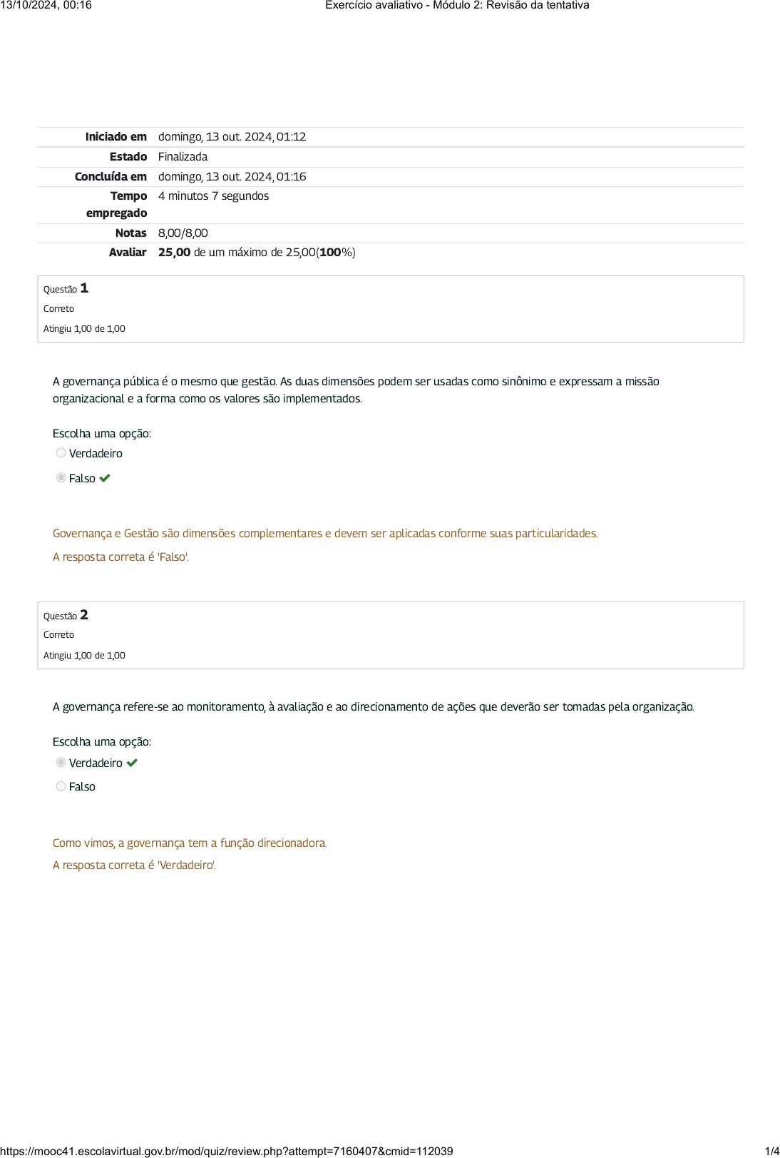 <p>Iniciado em domingo, 13 out. 2024, 01:12</p><p>Estado Finalizada</p><p>Concluída em domingo, 13 out. 2024, 01:16</p><p>Tempo</p><p>empregado</p><p>4 minutos 7 segundos</p><p>Notas 8,00/8,00</p><p>Avaliar 25,00 de um máximo de 25,00(100%)</p><p>Questão 1</p><p>Correto</p><p>Atingiu 1,00 de 1,00</p><p>Questão 2</p><p>Correto</p><p>Atingiu 1,00 de 1,00</p><p>A governança pública é o mesmo que gestão. As duas dimensões podem ser usadas como sinônimo e expressam a missão</p><p>organizacional e a forma como os valores são implementados.</p><p>Escolha uma opção:</p><p>Verdadeiro</p><p>Falso </p><p>Governança e Gestão são dimensões complementares e devem ser aplicadas conforme suas particularidades.</p><p>A resposta correta é 'Falso'.</p><p>A governança refere-se ao monitoramento, à avaliação e ao direcionamento de ações que deverão ser tomadas pela organização.</p><p>Escolha uma opção:</p><p>Verdadeiro </p><p>Falso</p><p>Como vimos, a governança tem a função direcionadora.</p><p>A resposta correta é 'Verdadeiro'.</p><p>13/10/2024, 00:16 Exercício avaliativo - Módulo 2: Revisão da tentativa</p><p>https://mooc41.escolavirtual.gov.br/mod/quiz/review.php?attempt=7160407&cmid=112039 1/4</p><p>Questão 3</p><p>Correto</p><p>Atingiu 1,00 de 1,00</p><p>Questão 4</p><p>Correto</p><p>Atingiu 1,00 de 1,00</p><p>Questão 5</p><p>Correto</p><p>Atingiu 1,00 de 1,00</p><p>O planejamento estratégico é uma forma de planejar ações e implementá-las na medida que o gestor achar interessante.</p><p>Escolha uma opção:</p><p>Verdadeiro</p><p>Falso </p><p>O planejamento estratégico é um caminho para implementar as estratégias organizacionais, identi�car oportunidades e ameaças,</p><p>planejar soluções e proporcionar senso de direção e diminuição de eventuais riscos.</p><p>A resposta correta é 'Falso'.</p><p>A gestão estratégica deve ser um processo que acontece a cada quatro anos e deve estar associado às metas do governo local.</p><p>Escolha uma opção:</p><p>Verdadeiro</p><p>Falso </p><p>A gestão estratégica dever ser considerada como processo contínuo que associa o planejamento estratégico à implementação, ao</p><p>monitoramento e à avaliação da estratégia com vistas ao alcance da missão organizacional.</p><p>A resposta correta é 'Falso'.</p><p>Governança pública refere-se ao:</p><p>Escolha uma opção:</p><p>a. monitoramento, implantação e missão organizacional.</p><p>b. monitoramento, avaliação e gestão de risco.</p><p>c. monitoramento, gestão e planejamento estratégico.</p><p>d. monitoramento, avaliação e direcionamento de ações. </p><p>Sua resposta está correta.</p><p>A governança pública tem a função de monitorar, avaliar e direcionar ações que deverão ser adotadas pela organização.</p><p>A resposta correta é: monitoramento, avaliação e direcionamento de ações.</p><p>13/10/2024, 00:16 Exercício avaliativo - Módulo 2: Revisão da tentativa</p><p>https://mooc41.escolavirtual.gov.br/mod/quiz/review.php?attempt=7160407&cmid=112039 2/4</p><p>Questão 6</p><p>Correto</p><p>Atingiu 1,00 de 1,00</p><p>Questão 7</p><p>Correto</p><p>Atingiu 1,00 de 1,00</p><p>Podemos considerar como macroprocessos da gestão estratégica:</p><p>Escolha uma opção:</p><p>a. planejamento, produtos e serviços e compras públicas.</p><p>b. plano de logística sustentável e prestação de contas.</p><p>c. planejamento estratégico; gestão do portfólio de produtos e serviços; gestão de portfólio de projetos e processos. </p><p>d. portfólio de projetos, avaliação estratégica e normativos.</p><p>Sua resposta está correta.</p><p>São considerados macroprocessos da gestão estratégica: planejamento estratégico; gestão do portfólio de produtos e serviços; gestão</p><p>de portfólio de projetos e processos; gestão de riscos; monitoramento e avaliação da estratégia e prestação de contas</p><p>A resposta correta é: planejamento estratégico; gestão do portfólio de produtos e serviços; gestão de portfólio de projetos e processos.</p><p>O Plano de Logística Sustentável pode ser considerado:</p><p>Escolha uma opção:</p><p>a. Um instrumento de planejamento. </p><p>b. Uma ferramenta de design.</p><p>c. Um conjunto de normas.</p><p>d. Um plano de regulação para organização.</p><p>Sua resposta está correta.</p><p>O plano de logística sustentável é um instrumento de planejamento que possibilita organizar ações que visam à e�ciência do gasto e</p><p>ao consumo consciente.</p><p>A resposta correta é: Um instrumento de planejamento.</p><p>13/10/2024, 00:16 Exercício avaliativo - Módulo 2: Revisão da tentativa</p><p>https://mooc41.escolavirtual.gov.br/mod/quiz/review.php?attempt=7160407&cmid=112039 3/4</p><p>Questão 8</p><p>Correto</p><p>Atingiu 1,00 de 1,00</p><p>A Gestão Estratégica responsabiliza-se por:</p><p>Escolha uma opção:</p><p>a. planejar, controlar e executar. </p><p>b. planejar, controlar e idealizar.</p><p>c. controlar, executar e monitorar.</p><p>d. planejar, controlar e monitorar.</p><p>Sua resposta está correta.</p><p>A gestão responsabiliza-se por planejar, controlar e executar e assume a função realizadora das diretrizes estabelecidas.</p><p>A resposta correta é: planejar, controlar e executar.</p><p>13/10/2024, 00:16 Exercício avaliativo - Módulo 2: Revisão da tentativa</p><p>https://mooc41.escolavirtual.gov.br/mod/quiz/review.php?attempt=7160407&cmid=112039 4/4</p>