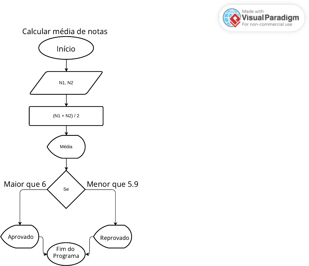 <p>Calcular média de notas</p><p>Início</p><p>N1, N2</p><p>(N1 + N2) / 2</p><p>Média</p><p>Se</p><p>Maior que 6 Menor que 5.9</p><p>Aprovado Reprovado</p><p>Fim do</p><p>Programa</p>