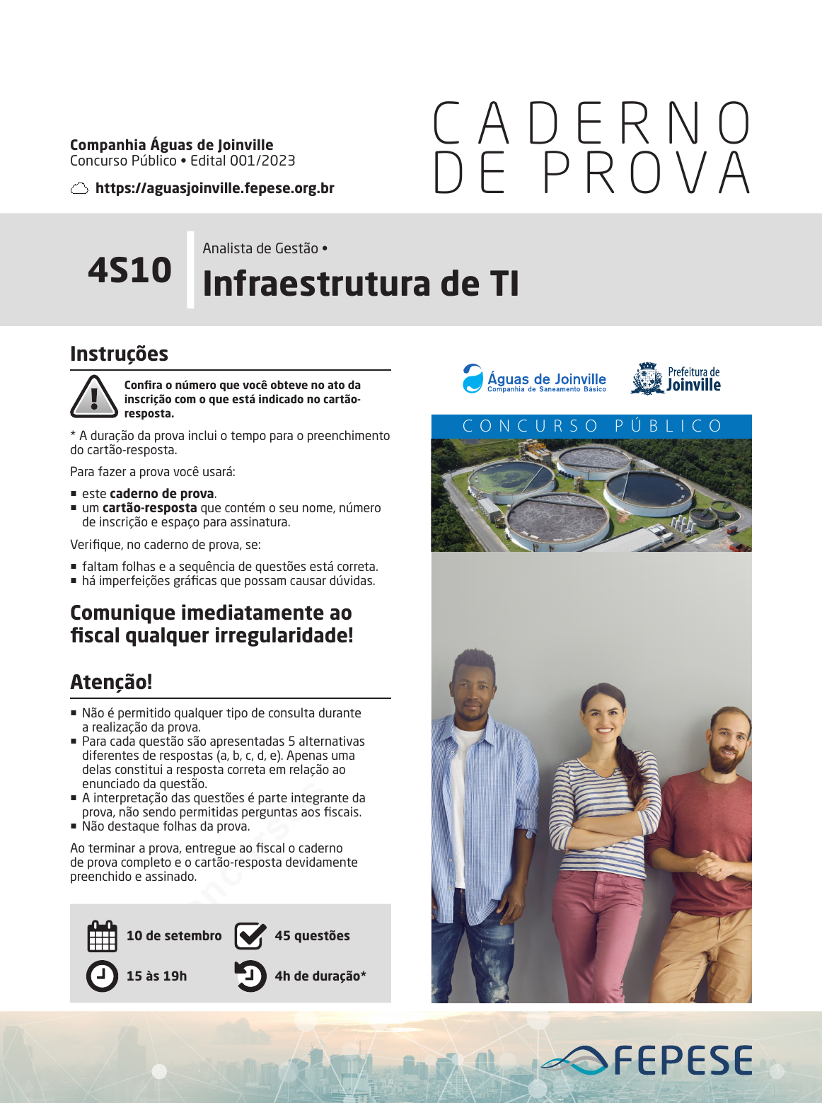 <p>pcimarkpci MjgwNDowMzBjOjFhMDc6NTkwMDozOWI2OmIwZjg6ODJiODpkNGIz:U3VuLCAxMyBPY3QgMjAyNCAxMToyNjo0OSAtMDMwMA==</p><p>www.pciconcursos.com.br</p><p>C A D E R N O</p><p>D E P R O V A</p><p>Companhia Águas de Joinville</p><p>Concurso Público • Edital 001/2023</p><p>https://aguasjoinville.fepese.org.br</p><p>4S10</p><p>Analista de Gestão •</p><p>Infraestrutura de TI</p><p>Instruções</p><p>Confira o número que você obteve no ato da</p><p>inscrição com o que está indicado no cartão-</p><p>resposta.</p><p>* A duração da prova inclui o tempo para o preenchimento</p><p>do cartão-resposta.</p><p>Para fazer a prova você usará:</p><p>� este caderno de prova.</p><p>� um cartão-resposta que contém o seu nome, número</p><p>de inscrição e espaço para assinatura.</p><p>Verifique, no caderno de prova, se:</p><p>� faltam folhas e a sequência de questões está correta.</p><p>� há imperfeições gráficas que possam causar dúvidas.</p><p>Comunique imediatamente ao</p><p>fiscal qualquer irregularidade!</p><p>Atenção!</p><p>� Não é permitido qualquer tipo de consulta durante</p><p>a realização da prova.</p><p>� Para cada questão são apresentadas 5 alternativas</p><p>diferentes de respostas (a, b, c, d, e). Apenas uma</p><p>delas constitui a resposta correta em relação ao</p><p>enunciado da questão.</p><p>� A interpretação das questões é parte integrante da</p><p>prova, não sendo permitidas perguntas aos fiscais.</p><p>� Não destaque folhas da prova.</p><p>Ao terminar a prova, entregue ao fiscal o caderno</p><p>de prova completo e o cartão-resposta devidamente</p><p>preenchido e assinado.</p><p>10 de setembro</p><p>15 às 19h</p><p>45 questões</p><p>4h de duração*</p><p>C O N C U R S O P Ú B L I C O</p><p>pcimarkpci MjgwNDowMzBjOjFhMDc6NTkwMDozOWI2OmIwZjg6ODJiODpkNGIz:U3VuLCAxMyBPY3QgMjAyNCAxMToyNjo0OSAtMDMwMA==</p><p>www.pciconcursos.com.br</p><p>.</p><p>pcimarkpci MjgwNDowMzBjOjFhMDc6NTkwMDozOWI2OmIwZjg6ODJiODpkNGIz:U3VuLCAxMyBPY3QgMjAyNCAxMToyNjo0OSAtMDMwMA==</p><p>www.pciconcursos.com.br</p><p>Página 3</p><p>Companhia Águas de Joinville • Concurso Público • Edital 001/2023</p><p>4S10 Analista de Gestão • Infraestrutura de TI</p><p>Língua Portuguesa 10 questões</p><p>Texto 1</p><p>Caracterização Pluviométrica</p><p>Em um balanço hídrico, que representa a contabili-</p><p>dade entre entradas e saídas de água de uma bacia</p><p>hidrográfica, a precipitação apresenta-se como a</p><p>principal componente de entrada, sendo as saídas</p><p>definidas por processos de evapotranspiração e escoa-</p><p>mento. O balanço é feito em termos de valores médios</p><p>das variáveis, considerando essas médias obtidas para</p><p>um período longo, o que, muitas vezes, acaba por</p><p>inviabilizar os estudos, devido à escassez de dados.</p><p>Metodologias baseadas nas precipitações e suas rela-</p><p>ções com as variáveis do balanço hídrico podem ser</p><p>empregadas para as estimativas de recarga natural em</p><p>regiões com pouca disponibilidade de dados. Estudo</p><p>desenvolvido pelo New Jersey Geological Survey, des-</p><p>crito por Charles et al. (1993), emprega um balanço</p><p>hídrico no solo, no qual se assume que toda água</p><p>infiltrada que se move abaixo da zona das raízes con-</p><p>tribui para a recarga. A estimativa da recarga é obtida</p><p>a partir da precipitação subtraindo-se a evapotrans-</p><p>piração real, o escoamento superficial e a variação do</p><p>armazenamento de água no solo, tornando-se neces-</p><p>sário proceder a quantificação destes componentes</p><p>num período coincidente de dados.</p><p>Alguns modelos hidrológicos aplicados para a estima-</p><p>tiva das variáveis do balanço hídrico utilizam dados</p><p>diários e pontuais de entrada, sendo necessário o</p><p>acúmulo em nível mensal ou anual e correções para</p><p>ajustes em nível de representação espacial, princi-</p><p>palmente no caso de variáveis que sofrem bastante</p><p>influência em regiões de relevo acidentado, como é o</p><p>caso da precipitação.</p><p>WESCHENFELDER, Adriana Buri; PICKBRENNER, Karine; MATTIUZI,</p><p>Camila Dalla Porta. Disponível em: . Acesso em: 05 de jul 2023. Fragmento adaptado.</p><p>1. Quanto à tipologia e ao gênero, o texto 1 caracteri-</p><p>za-se como:</p><p>a. SQUARE Narrativa • crônica</p><p>b. SQUARE Injuntiva • monografia</p><p>c. SQUARE Descrição • reportagem</p><p>d. Check-square Dissertação expositiva • artigo científico</p><p>e. SQUARE Dissertação argumentativa • resenha</p><p>2. Em relação ao texto 1, é correto o que se afirma em:</p><p>a. Check-square Em regiões nas quais há escassez de dados, a</p><p>estimativa de recarga natural de água pode ser</p><p>feita com base nas precipitações e suas rela-</p><p>ções com as variáveis do balanço hídrico.</p><p>b. SQUARE Para estimativas das variáveis do balanço</p><p>hídrico, é suficiente considerar os níveis diários</p><p>e mensais de precipitação pluvial, independen-</p><p>temente do relevo topográfico.</p><p>c. SQUARE As saídas definidas por processos de evapo-</p><p>transpiração e escoamento são, em geral, des-</p><p>consideradas na contabilidade dos níveis das</p><p>bacias hidrográficas, para as quais a contribui-</p><p>ção mais relevante advém do armazenamento</p><p>de águas no solo.</p><p>d. SQUARE A quantificação dos componentes pluviométri-</p><p>cos acumulados mensalmente são suficientes</p><p>para avaliar a média da recarga de volumes das</p><p>bacias hidrográficas.</p><p>e. SQUARE Um estudo desenvolvido pelo New Jersey Geo-</p><p>logical Survey, que foi descrito individualmente</p><p>por Charles em 1993, revela que a água infil-</p><p>trada no solo pouco contribui para a correção</p><p>dos indicadores hidrográficos.</p><p>3. Os dois períodos abaixo retratam situações diver-</p><p>sas. Combine-os com as afirmativas que seguem.</p><p>Coluna 1