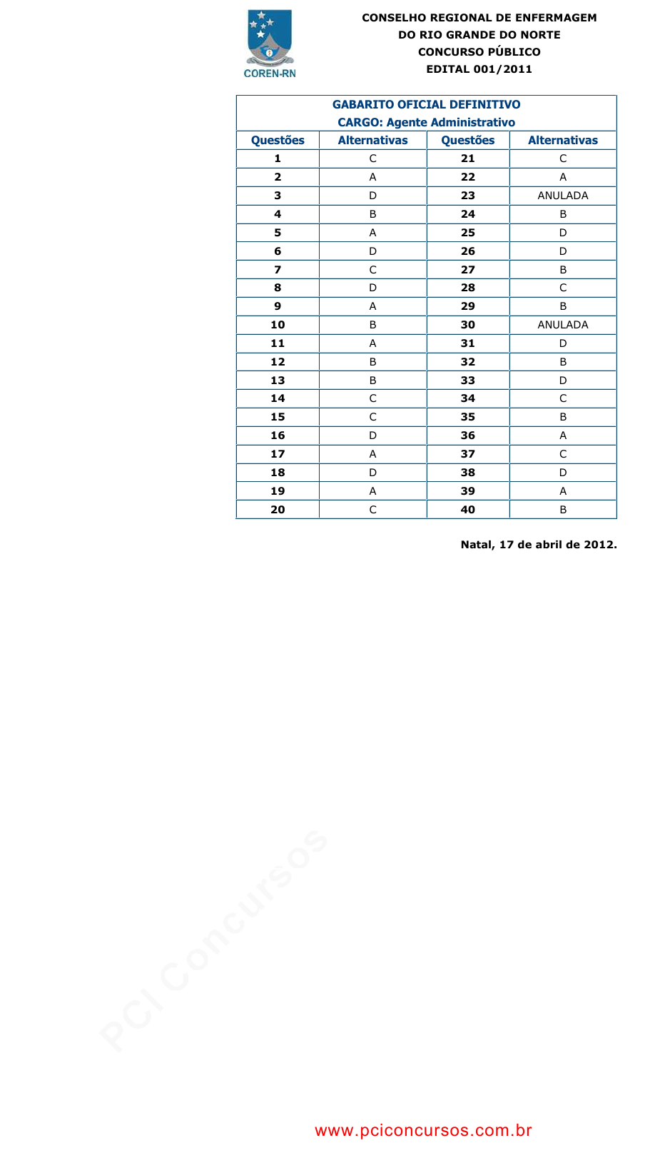 <p>pcimarkpci MjgwNDowMzBjOjFhMDc6NTkwMDozOWI2OmIwZjg6ODJiODpkNGIz:U3VuLCAxMyBPY3QgMjAyNCAxMToyNToyNyAtMDMwMA==</p><p>www.pciconcursos.com.br</p><p>CONSELHO REGIONAL DE ENFERMAGEM</p><p>DO RIO GRANDE DO NORTE</p><p>CONCURSO PÚBLICO</p><p>EDITAL 001/2011</p><p>GABARITO OFICIAL DEFINITIVO</p><p>CARGO: Agente Administrativo</p><p>Questões Alternativas Questões Alternativas</p><p>1 C 21 C</p><p>2 A 22 A</p><p>3 D 23 ANULADA</p><p>4 B 24 B</p><p>5 A 25 D</p><p>6 D 26 D</p><p>7 C 27 B</p><p>8 D 28 C</p><p>9 A 29 B</p><p>10 B 30 ANULADA</p><p>11 A 31 D</p><p>12 B 32 B</p><p>13 B 33 D</p><p>14 C 34 C</p><p>15 C 35 B</p><p>16 D 36 A</p><p>17 A 37 C</p><p>18 D 38 D</p><p>19 A 39 A</p><p>20 C 40 B</p><p>Natal, 17 de abril de 2012.</p><p>www.pciconcursos.com.br</p><p>pcimarkpci MjgwNDowMzBjOjFhMDc6NTkwMDozOWI2OmIwZjg6ODJiODpkNGIz:U3VuLCAxMyBPY3QgMjAyNCAxMToyNToyNyAtMDMwMA==</p><p>www.pciconcursos.com.br</p><p>CONSELHO REGIONAL DE ENFERMAGEM</p><p>DO RIO GRANDE DO NORTE</p><p>CONCURSO PÚBLICO</p><p>EDITAL 001/2011</p><p>GABARITO OFICIAL DEFINITIVO</p><p>CARGO: Agente de Tecnologia e Informática</p><p>Questões Alternativas Questões Alternativas</p><p>1 C 21 C</p><p>2 A 22 A</p><p>3 D 23 A</p><p>4 B 24 B</p><p>5 A 25 D</p><p>6 D 26 D</p><p>7 C 27 B</p><p>8 D 28 C</p><p>9 A 29 B</p><p>10 B 30 C</p><p>11 A 31 D</p><p>12 B 32 B</p><p>13 B 33 D</p><p>14 C 34 C</p><p>15 C 35 B</p><p>16 D 36 A</p><p>17 A 37 C</p><p>18 D 38 D</p><p>19 A 39 A</p><p>20 C 40 B</p><p>Natal, 17 de abril de 2012.</p><p>www.pciconcursos.com.br</p><p>pcimarkpci MjgwNDowMzBjOjFhMDc6NTkwMDozOWI2OmIwZjg6ODJiODpkNGIz:U3VuLCAxMyBPY3QgMjAyNCAxMToyNToyNyAtMDMwMA==</p><p>www.pciconcursos.com.br</p><p>CONSELHO REGIONAL DE ENFERMAGEM</p><p>DO RIO GRANDE DO NORTE</p><p>CONCURSO PÚBLICO</p><p>EDITAL 001/2011</p><p>GABARITO OFICIAL DEFINITIVO</p><p>CARGO: Motorista</p><p>Questões Alternativas Questões Alternativas</p><p>1 C 21 C</p><p>2 A 22 A</p><p>3 D 23 A</p><p>4 B 24 B</p><p>5 A 25 D</p><p>6 D 26 D</p><p>7 C 27 B</p><p>8 D 28 C</p><p>9 A 29 B</p><p>10 B 30 C</p><p>11 A 31 ANULADA</p><p>12 B 32 B</p><p>13 B 33 D</p><p>14 C 34 C</p><p>15 C 35 B</p><p>16 D 36 A</p><p>17 A 37 C</p><p>18 D 38 D</p><p>19 A 39 ANULADA</p><p>20 C 40 B</p><p>Natal, 17 de abril de 2012.</p><p>www.pciconcursos.com.br</p><p>pcimarkpci MjgwNDowMzBjOjFhMDc6NTkwMDozOWI2OmIwZjg6ODJiODpkNGIz:U3VuLCAxMyBPY3QgMjAyNCAxMToyNToyNyAtMDMwMA==</p><p>www.pciconcursos.com.br</p><p>CONSELHO REGIONAL DE ENFERMAGEM</p><p>DO RIO GRANDE DO NORTE</p><p>CONCURSO PÚBLICO</p><p>EDITAL 001/2011</p><p>GABARITO OFICIAL DEFINITIVO</p><p>CARGO: Programador</p><p>Questões Alternativas Questões Alternativas</p><p>1 C 21 C</p><p>2 A 22 D</p><p>3 D 23 A</p><p>4 B 24 B</p><p>5 A 25 D</p><p>6 D 26 D</p><p>7 C 27 B</p><p>8 D 28 C</p><p>9 A 29 B</p><p>10 B 30 C</p><p>11 A 31 D</p><p>12 B 32 B</p><p>13 B 33 D</p><p>14 C 34 C</p><p>15 C 35 B</p><p>16 D 36 A</p><p>17 A 37 C</p><p>18 D 38 D</p><p>19 A 39 A</p><p>20 C 40 B</p><p>Natal, 17 de abril de 2012.</p><p>www.pciconcursos.com.br</p><p>pcimarkpci MjgwNDowMzBjOjFhMDc6NTkwMDozOWI2OmIwZjg6ODJiODpkNGIz:U3VuLCAxMyBPY3QgMjAyNCAxMToyNToyNyAtMDMwMA==</p><p>www.pciconcursos.com.br</p><p>CONSELHO REGIONAL DE ENFERMAGEM</p><p>DO RIO GRANDE DO NORTE</p><p>CONCURSO PÚBLICO</p><p>EDITAL 001/2011</p><p>GABARITO OFICIAL DEFINITIVO</p><p>CARGO: Telefonista</p><p>Questões Alternativas Questões Alternativas</p><p>1 C 21 C</p><p>2 A 22 A</p><p>3 D 23 A</p><p>4 B 24 B</p><p>5 A 25 D</p><p>6 D 26 D</p><p>7 C 27 B</p><p>8 D 28 C</p><p>9 A 29 B</p><p>10 B 30 C</p><p>11 A 31 ANULADA</p><p>12 B 32 B</p><p>13 B 33 D</p><p>14 C 34 C</p><p>15 C 35 B</p><p>16 D 36 A</p><p>17 A 37 C</p><p>18 D 38 D</p><p>19 A 39 ANULADA</p><p>20 C 40 B</p><p>Natal, 17 de abril de 2012.</p><p>www.pciconcursos.com.br</p>