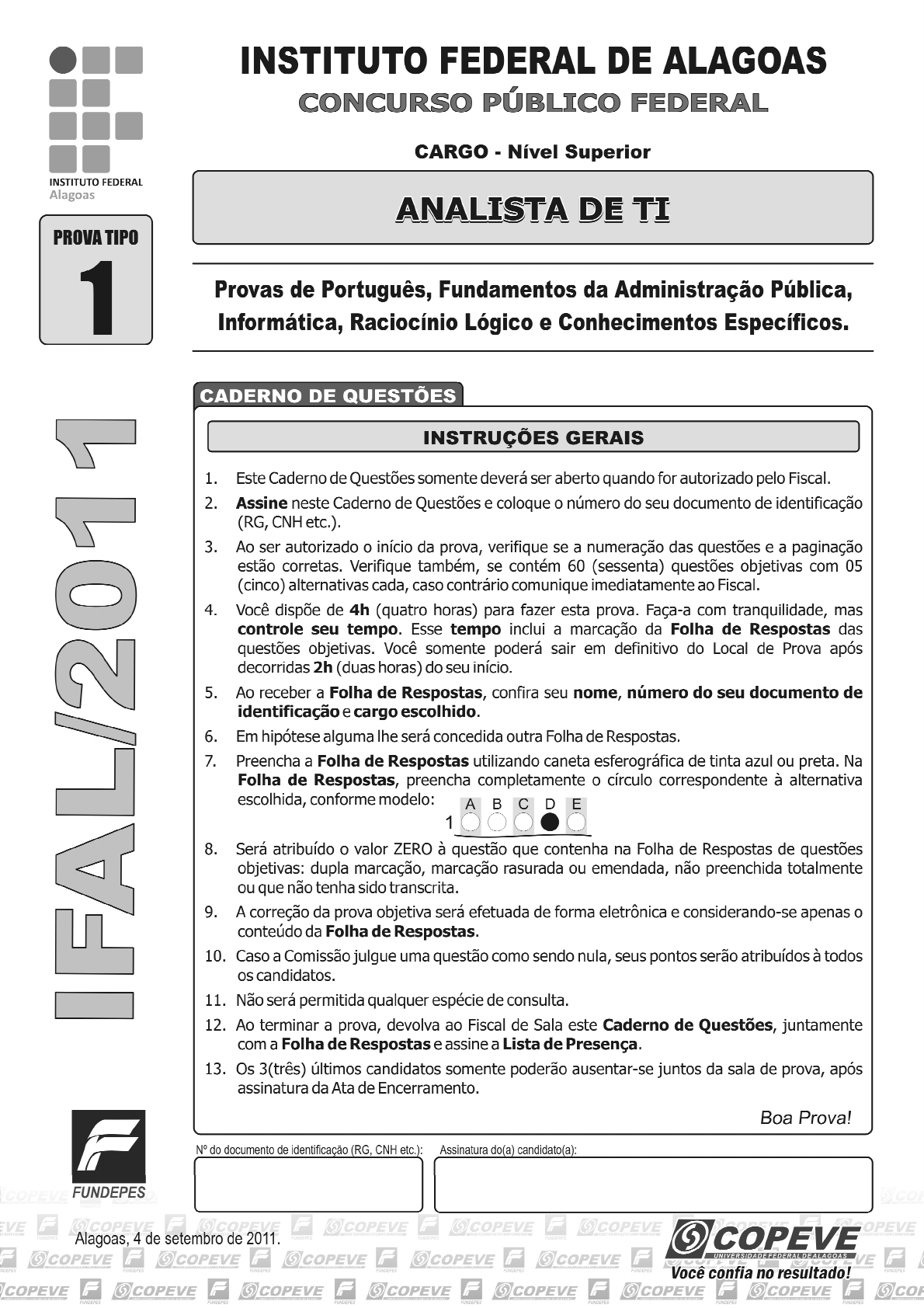 <p>pcimarkpci MjgwNDowMzBjOjFhMDc6NTkwMDozOWI2OmIwZjg6ODJiODpkNGIz:U3VuLCAxMyBPY3QgMjAyNCAxMTozMDozNyAtMDMwMA==</p><p>www.pciconcursos.com.br</p><p>pcimarkpci MjgwNDowMzBjOjFhMDc6NTkwMDozOWI2OmIwZjg6ODJiODpkNGIz:U3VuLCAxMyBPY3QgMjAyNCAxMTozMDozNyAtMDMwMA==</p><p>www.pciconcursos.com.br</p><p>Concurso IFAL 2011 Prova tipo 1 4 - SET - 2011</p><p>Superior – ANALISTA de TI 1</p><p>PORTUGUÊS</p><p>As questões 1 e 2 referem-se ao texto abaixo.</p><p>As formas de convivência nos meios urbanos povoados por</p><p>multidões davam nascimento a tipos de sociabilidade, isto é, a</p><p>manifestações coletivas, bastante diferentes daquelas existentes</p><p>nos pequenos vilarejos e nas cidades menores. As criações e o</p><p>consumo de bens culturais deveriam atender as exigências</p><p>novas dessas sociedades de massa.</p><p>O progresso da tecnologia também contribuiu decisivamente</p><p>na alteração do modo de vida urbano. Na segunda metade do</p><p>século XIX, apareceram as primeiras máquinas fotográficas, a</p><p>comunicação por telégrafo, os tipos mais antigos do atual</p><p>telefone. A criação de lojas de departamento, com produtos</p><p>expostos de maneira a despertar desejos, estimulou a circulação</p><p>de mercadorias das prateleiras para as mãos dos consumidores,</p><p>desde, é claro, que tivessem dinheiro para comprar</p><p>(GEOGRAFIA, 32 ed. ago. 2010, p. 54).</p><p>1.1.1.1. O trecho destacado no excerto “As formas de convivência</p><p>nos meios urbanos povoados por multidões davam</p><p>nascimento a tipos de sociabilidade” aceita também a</p><p>seguinte versão sem provocar danos à modalidade culta da</p><p>língua, nem subverter o sentido:</p><p>A) “fazia surgir tipos de sociabilidade”</p><p>B) “expressavam tipos de sociabilidade”</p><p>C) “constituía tipos de sociabilidade”</p><p>D) “davam distinção à sociabilidade”</p><p>E) “proporcionavam o nascimento de tipos de sociabilidade”</p><p>2.2.2.2. No texto, evidencia-se um sentido antitético ao definir que</p><p>A) as sociedades de massa precisariam consumir mais bens</p><p>culturais.</p><p>B) o formato de disposição das mercadorias nas prateleiras</p><p>notabiliza as lojas de departamento.</p><p>C) novos tipos de sociabilidade provocam uma fronteira entre</p><p>os centros urbanos mais populosos e as pequenas cidades</p><p>e vilarejos.</p><p>D) no século XIX surgem os primeiros indícios significativos à</p><p>revolução tecnológica dos dias atuais.</p><p>E) o progresso tecnológico também foi responsável pela</p><p>mudança de hábitos nas sociedades urbanas adensadas.</p><p>3.3.3.3. No período “Uma redação nota 10 é a que apresenta ideias</p><p>que permitem ao leitor uma compreensão exata do que se</p><p>pretendeu escrever.”, há três orações subordinadas, que</p><p>são, respectivamente,</p><p>A) adjetiva, substantiva objetiva indireta, adjetiva.</p><p>B) adjetiva, adjetiva, substantiva completiva nominal.</p><p>C) substantiva completiva nominal, adjetiva, adjetiva.</p><p>D) adjetiva, adjetiva, adjetiva.</p><p>E) substantiva predicativa, adjetiva, substantiva objetiva</p><p>indireta.</p><p>As questões de 4 a 7 referem-se ao texto abaixo.</p><p>Na perspectiva de um renomado filósofo francês, Gilbert</p><p>de Simondon, o homem iniciou seu processo de humanização,</p><p>ou seja, a diferenciação de seus comportamentos em relação</p><p>aos dos demais animais, a partir do momento em que utilizou os</p><p>recursos existentes na natureza em benefício próprio. Pedras,</p><p>ossos, galhos e troncos de árvores foram transformados em</p><p>ferramentas pelos nossos ancestrais. Com esses materiais,</p><p>procuravam superar suas fragilidades físicas em relação às</p><p>demais espécies. Contava o homem primitivo com duas grandes</p><p>ferramentas, naturais e distintas das demais espécies: cérebro e</p><p>a mão criadora. Frágil em relação aos demais animais, sem</p><p>condições de se defender dos fenômenos da natureza – a</p><p>chuva, o frio, a neve... – o homem precisava de equipamentos</p><p>que ampliassem suas competências. Não podia garantir sua</p><p>sobrevivência e sua superioridade apenas pela conjugação das</p><p>possibilidades do seu raciocínio com sua habilidade manual. A</p><p>utilização dos recursos naturais para atingir fins específicos</p><p>ligados à sobrevivência da espécie foi a maneira que o homem</p><p>encontrou para não desaparecer (KENSKI, Vani Moreira.</p><p>Tecnologias e ensino presencial e a distância. Campinas, SP:</p><p>Papirus, 2003, p. 20).</p><p>4.4.4.4. Observe o excerto a seguir: “Frágil em relação aos demais</p><p>animais, sem condições de se defender dos fenômenos da</p><p>natureza – a chuva, o frio, a neve... – o homem precisava de</p><p>equipamentos que ampliassem suas competências”. Isso</p><p>quer dizer que:</p><p>A) pela fragilidade em relação aos outros animais e pela</p><p>inabilidade diante dos fenômenos da natureza, o homem</p><p>precisava desenvolver tecnologia de sobrevivência.</p><p>B) a fragilidade diante dos outros animais reforçava as</p><p>estratégias de defesa.</p><p>C) por ser frágil, o homem precisava ampliar novas técnicas de</p><p>sobrevivência para se defender das intempéries.</p><p>D) o homem prescindia de equipamentos que o tornassem</p><p>capaz de sobreviver e de dirimir sua fragilidade.</p><p>E) o homem era provido de condições de sobrevivência,</p><p>embora fosse frágil diante dos outros animais.</p><p>5.5.5.5. Sobre o processo de humanização, compreende-se que:</p><p>A) constitui uma trajetória que se estabelece para determinar</p><p>as peculiaridades do modo de vida humano em relação aos</p><p>animais.</p><p>B) refere-se às particularidades entre os homens primitivos e</p><p>os animais.</p><p>C) constitui um processo de transformação de ferramentas</p><p>rudimentares a objetos sofisticados.</p><p>D) pode ser concebido como a passagem de 