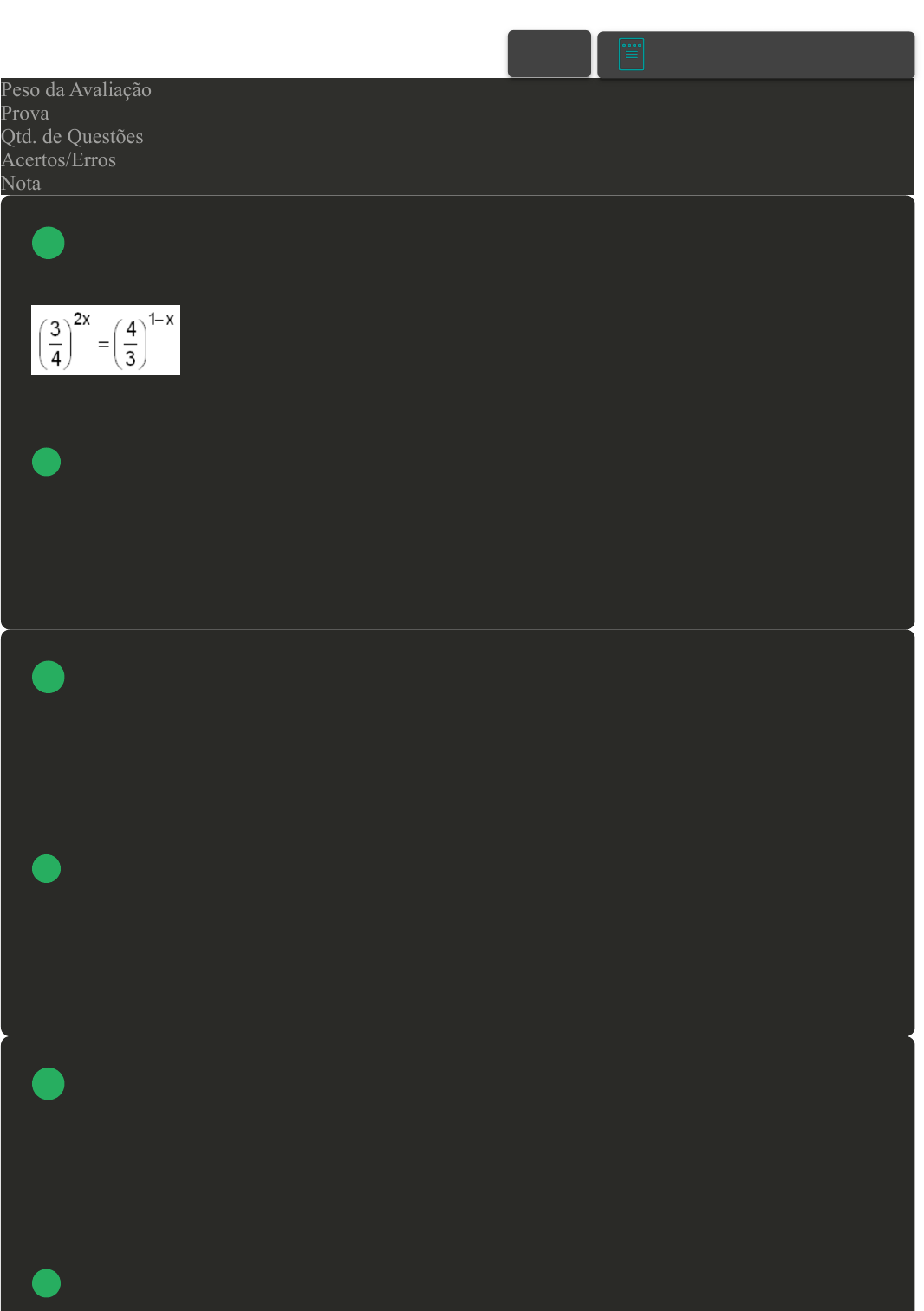 <p>Prova Impressa</p><p>GABARITO | Avaliação II - Individual (Cod.:983329)</p><p>Peso da Avaliação 2,00</p><p>Prova 89318370</p><p>Qtd. de Questões 10</p><p>Acertos/Erros 10/0</p><p>Nota 10,00</p><p>Para resolver uma equação exponencial precisamos utilizar as propriedades de potenciação.</p><p>Utilizando tais propriedades de potenciação, determinando a solução da equação a seguir:</p><p>Assinale a alternativa CORRETA:</p><p>A x = - 1/2.</p><p>B x = - 1.</p><p>C x = 1.</p><p>D x = 1/2.</p><p>Para se tornar rentável, um açougue deve ter em seu estoque x frangos por dia, de modo que satisfaça</p><p>à desigualdade 3x + 80 2x - 5.</p><p>A x > 1,2.</p><p>B x -1,2.</p><p>Para encontrar as raízes de uma equação do 2º grau, podemos utilizar o método da soma e produto.</p><p>Com base no exposto, calcule as raízes da equação x² - 4x + 4 = 0 e determine a soma das raízes.</p><p>Assinale a alternativa CORRETA:</p><p>A A soma das raízes é 16.</p><p>B A soma das raízes é -16.</p><p>C A soma das raízes é - 4.</p><p>D A soma das raízes é 4.</p><p>Calcular o logaritmo de um número consiste em descobrir qual é o número que servirá de expoente</p><p>para a base cujo o resultado deve ser o logaritmando. O logaritmo possui várias aplicações na</p><p>Matemática e em diversas áreas do conhecimento, como Física, Biologia, Química, Medicina,</p><p>Geografia, entre outras. As propriedades do logaritmo são fundamentais para interpretarmos algumas</p><p>situações do dia a dia. Sabendo que:</p><p>Qual o valor de log16(a2)?Assinale a alternativa CORRETA?</p><p>A 1/2.</p><p>B - 1/4.</p><p>C - 2.</p><p>D 4.</p><p>A receita mensal da empresa Vantagem Ltda. é dada pela equação quadrática x² - 10x + 24, na qual x</p><p>representa a variável que a empresa negocia. Para que valores de x a receita é nula?</p><p>Assinale a alternativa CORRETA:</p><p>A Suas raízes são 2 e 4.</p><p>B Suas raízes são 0 e -2.</p><p>C Suas raízes são 2 e 0.</p><p>4</p><p>5</p><p>6</p><p>12/10/2024, 19:15 Avaliação II - Individual</p><p>about:blank 2/4</p><p>D Suas raízes são 4 e 6.</p><p>Uma equação modular é uma equação que envolve modulo de uma expressão algébrica. O</p><p>conjunto de todas as soluções da equação modular</p><p>A S = { 1, 3}.</p><p>B S = { - 5, 1, 4}.</p><p>C S = { - 3, - 1, 1, 3}.</p><p>D S = { 1, 3, 4}.</p><p>As raízes de uma equação do 3º grau são valores atribuídos à variável, tornando-a verdadeira. Sendo</p><p>assim, considere a equação 4x³ - 2x² = 0 e determine suas raízes reais. Lembre-se que sempre que o</p><p>termo independente for inexistente, uma das raízes será zero.</p><p>Assinale a alternativa CORRETA:</p><p>A Tem raízes reais iguais a zero, 1 e ½.</p><p>B Tem raízes reais iguais a zero e - ½.</p><p>C Tem raízes reais iguais a zero, 1 e - ½.</p><p>D Tem raízes reais iguais a zero e ½.</p><p>O marcador de combustível de um carro mostra que o tanque está com 3/4 da sua capacidade.</p><p>Sabendo que o tanque está com 48 litros de gasolina, quantos litros cabem no tanque cheio desse</p><p>carro?</p><p>Assinale a alternativa CORRETA:</p><p>A O tanque cheio tem 64 litros.</p><p>B O tanque cheio tem 60 litros.</p><p>C O tanque cheio tem 144 litros.</p><p>D O tanque cheio tem 76 litros.</p><p>7</p><p>8</p><p>9</p><p>12/10/2024, 19:15 Avaliação II - Individual</p><p>about:blank 3/4</p><p>Uma bola colocada no chão é chutada para o alto, percorrendo uma trajetória descrita por y = - 2x² +</p><p>12x, em que y é a altura dada em metros.</p><p>Sobre a altura máxima atingida pela bola, assinale a alternativa CORRETA:</p><p>A 12 metros.</p><p>B 6 metros.</p><p>C 18 metros.</p><p>D 36 metros.</p><p>10</p><p>Imprimir</p><p>12/10/2024, 19:15 Avaliação II - Individual</p><p>about:blank 4/4</p>