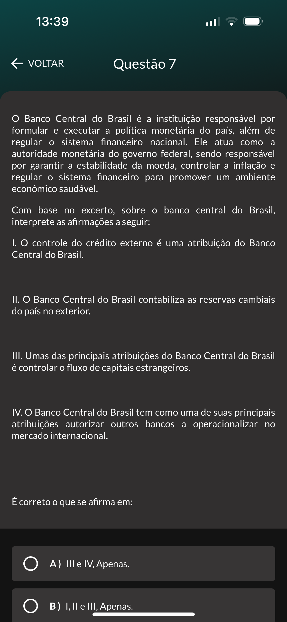 <p>13:39 VOLTAR Questão 7 O Banco Central do Brasil é a instituição responsável por formular e executar a política monetária do país, além de regular O sistema financeiro nacional. Ele atua como a autoridade monetária do governo federal, sendo responsável por garantir a estabilidade da moeda, controlar a inflação e regular sistema financeiro para promover um ambiente econômico saudável. Com base no excerto, sobre banco central do Brasil, interprete as afirmações a seguir: I. O controle do crédito externo é uma atribuição do Banco Central do Brasil. II. O Banco Central do Brasil contabiliza as reservas cambiais do país no exterior. III. Umas das principais atribuições do Banco Central do Brasil é controlar fluxo de capitais estrangeiros. IV. O Banco Central do Brasil tem como uma de suas principais atribuições autorizar outros bancos a operacionalizar no mercado internacional. É correto que se afirma em: A) III e IV, Apenas. B)</p>