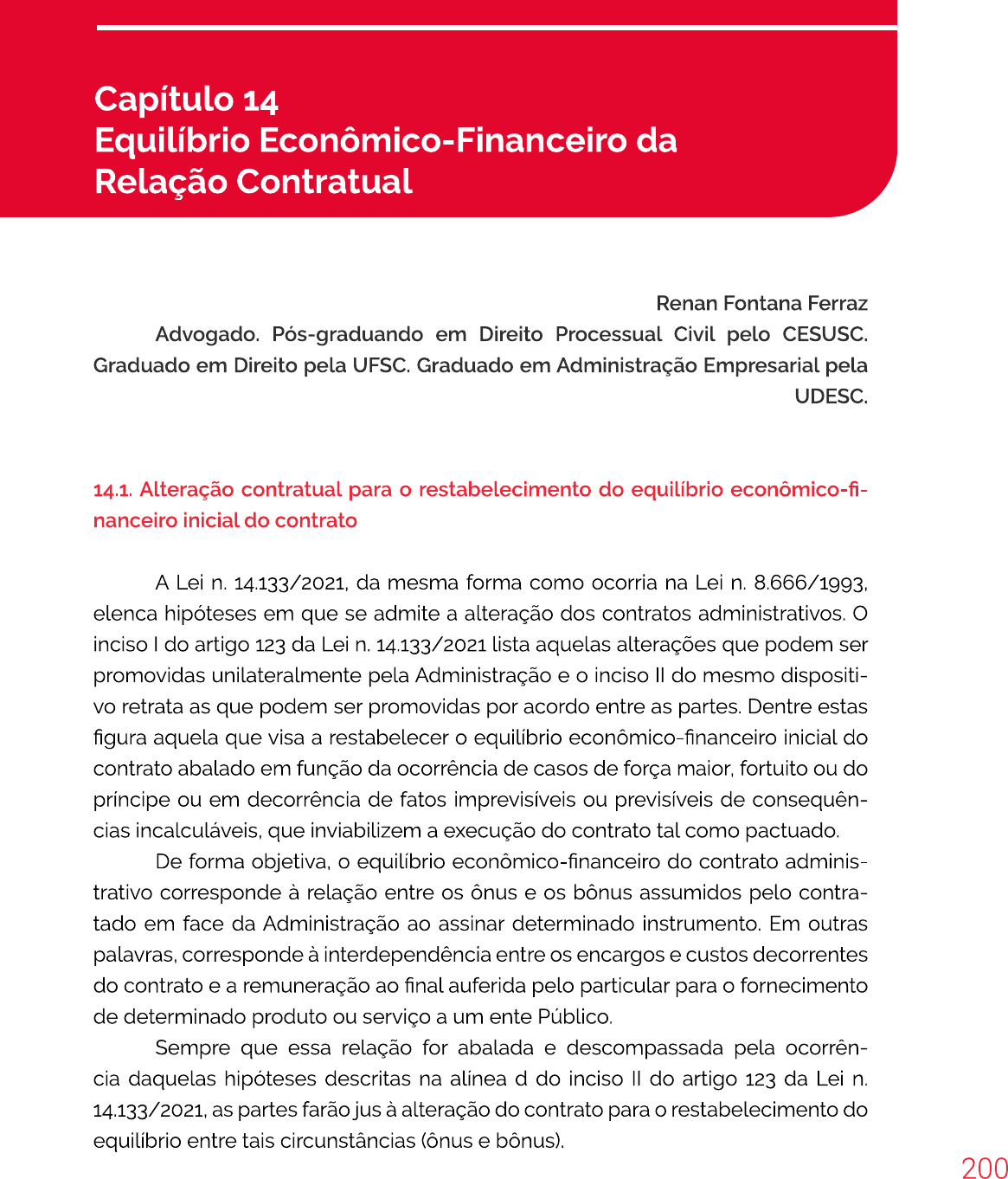 <p>Capítulo 14 Econômico-Financeiro da Relação Contratual Renan Fontana Ferraz Advogado. Pós-graduando em Direito Processual Civil pelo CESUSC. Graduado em Direito pela UFSC. Graduado em Administração Empresarial pela UDESC. 14.1. Alteração contratual para o restabelecimento do equilíbrio econômico-fi- nanceiro inicial do contrato A Lei n. 14.133/2021, da mesma forma como ocorria na Lei n. elenca hipóteses em que se admite a alteração dos contratos administrativos. O inciso I do artigo 123 da Lei n. 14.133/2021 lista aquelas alterações que podem ser promovidas unilateralmente pela Administração e inciso do mesmo dispositi- VO retrata as que podem ser promovidas por acordo entre as partes. Dentre estas figura aquela que visa a restabelecer equilíbrio inicial do contrato abalado em função da ocorrência de casos de força maior, fortuito ou do ou em decorrência de fatos imprevisíveis ou previsíveis de cias incalculáveis, que inviabilizem a execução do contrato tal como pactuado. De forma objetiva, equilíbrio econômico-financeiro do contrato adminis- trativo corresponde à relação entre os ônus e os bônus assumidos pelo contra- tado em face da Administração ao assinar determinado instrumento. Em outras palavras, corresponde à interdependência entre os encargos e custos decorrentes do contrato e a remuneração ao final auferida pelo particular para fornecimento de determinado produto ou serviço a um ente Público. Sempre que essa relação for abalada e descompassada pela ocorrên- cia daquelas hipóteses descritas na alínea d do inciso do artigo 123 da Lei n. 14.133/2021, as partes farão jus à alteração do contrato para restabelecimento do equilíbrio entre tais circunstâncias (ônus e bônus). 200</p><p>14.2. Momento em que a relação econômico-financeira inicial do contrato é es- tabelecida Ponto importante a ser observado é momento em que equilíbrio mico-financeiro da relação contratual é firmado e quais os parâmetros que devem ser observados para a apuração de eventual direito ao seu restabelecimento. Pois bem, os contratos administrativos são originados dos processos rios, lançados aos eventuais interessados em contratar com a Administração quan- do da publicação do instrumento convocatório. Embora particular e Administração passem a ser contraentes apenas com a assinatura do contrato administrativo, é ainda na licitação pública que equilíbrio econômico-financeiro da relação con- tratual é estabelecido. Isso porque instrumento convocatório é responsável por balizar tanto a elaboração do futuro instrumento contratual como também as propostas oferta- das pelos licitantes interessados em contratar com a Administração. É com base no instrumento convocatório que os licitantes podem analisar os custos e encar- gos da futura contratação e calcular os preços que serão necessários para que a remuneração lhe seja lucrativa. Portanto, embora a relação contratual seja selada pela assinatura do con- trato, é com o aceite da proposta elaborada com base no instrumento rio que o equilíbrio da relação é estabelecido. 14.3. Fundamentos para o direito ao reequilíbrio econômico-financeiro do contrato direito à manutenção do equilíbrio econômico-financeiro do contrato en- contra amparo constitucional no texto do inciso XXI do artigo 37 da Constituição Federal, que assegura a manutenção das condições efetivas de propostas ofere- cidas em licitações públicas: Art. 37. A administração pública direta e indireta de qualquer dos Poderes da União, dos Estados, do Distrito Federal e dos Municípios obedecerá aos princípios de legalidade, impessoalidade, moralidade, publicidade e eficiência e, também, ao seguinte: [...] XXI ressalvados os casos especificados na legislação, as obras, ser- viços, compras e alienações serão contratados mediante processo de licitação pública que assegure igualdade de condições a todos os con- correntes, com cláusulas que estabeleçam obrigações de pagamento, mantidas as condições efetivas da proposta, nos termos da lei, qual somente permitirá as exigências de qualificação técnica e econômica 201 indispensáveis à garantia do cumprimento das obrigações.</p><p>Na Lei n. 14.133/2021, a possibilidade de alteração do contrato administra- tivo para restabelecimento do seu equilíbrio está prevista na alínea d do inciso do seu artigo 124, cujo teor é seguinte: Art. 124. Os contratos regidos por esta Lei poderão ser alterados, com as devidas justificativas, nos seguintes casos: [...] por acordo entre as partes: [...] d) para restabelecer equilíbrio econômico-financeiro inicial do contrato em caso de força maior, caso fortuito ou fato do ou em decor- rência de fatos imprevisíveis ou previsíveis de consequências incalculá- veis, que inviabilizem a execução do contrato tal como pactuado, res- peitada, em qualquer caso, a repartição objetiva de risco estabelecida no contrato. Para que contrato possa ser alterado em busca do reequilíbrio mico-financeiro da relação, faz-se necessária a ocorrência de fatos qualificados como de força maior, fortuito, do que nada mais é do que um ato lícito e extracontratual praticado pela Administração que onera demasiadamente a exe- cução do contrato, como aumento da carga tributária incidente na atividade ob- jeto da contratação, por exemplo - ou quaisquer outros fatos imprevisíveis ou pre- visíveis de consequências incalculáveis que inviabilizem a execução do contrato. Simplificando, para que os contratantes façam jus ao direito de restabelecer a equação é indispensável a ocorrência de um fato impre- visível ou previsível de consequências incalculáveis que onere demasiadamente uma das partes a ponto de inviabilizar a execução do contrato tal como firmado. 14.4. Inovações trazidas pela Lei n. 14.133/2021 em comparação à Lei n. 8.666/1993 Vale ressaltar que a alínea 