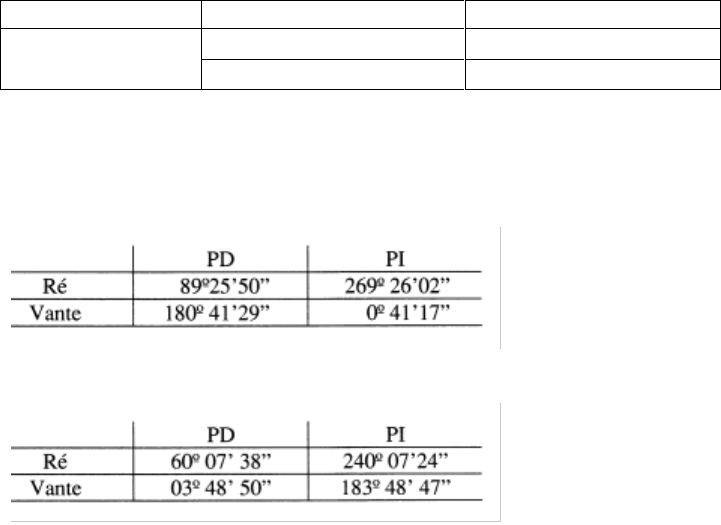 <p>1</p><p>Universidade Federal do Paraná</p><p>Setor de Ciências da Terra - Departamento de Geomática</p><p>Profa Regiane Dalazoana</p><p>GA175 - TOPOGRAFIA I</p><p>LISTA DE EXERCÍCIOS</p><p>4 - MEDIDA DE DIREÇÕES</p><p>a) Determine para um ângulo horizontal interno de 7812'14" o valor do ângulo horizontal</p><p>externo correspondente.</p><p>b) Determine para o ângulo vertical contado a partir do horizonte (v) de 4728'45" o valor do</p><p>ângulo vertical correspondente contado a partir do Zênite (Z) – ângulo zenital.</p><p>c) Determine qual seria o ângulo zenital (Z) correspondente ao ângulo vertical (v) de</p><p>-4728'45".</p><p>d) Determine para o ângulo horizontal externo de 17244'37" o ângulo horizontal interno</p><p>correspondente.</p><p>e) Dadas as seguintes leituras de PD e PI, calcular o ângulo horizontal medido entre as</p><p>direções BA e BC:</p><p>Estação Ré (A) Vante (C)</p><p>B PD = 78 49´ 12” PD = 293 09´ 50”</p><p>PI = 258 49´ 10” PI = 113 09´ 45”</p><p>f) Com base nas seguintes leituras calcule os ângulos horizontais.</p><p>f1)</p><p>f2)</p><p>2</p><p>g) Um engenheiro utilizou séries de pares conjugados para determinar os ângulos</p><p>horizontais de uma área (denominada em topografia de poligonal fechada) definida por 6</p><p>vértices, conforme caderneta de campo abaixo. Cada um dos 6 vértices foi ocupado com a</p><p>estação total e foram realizadas leituras para os respectivos pontos de ré e de vante, em PD</p><p>e PI.</p><p>Com base nas observações, calcule os valores dos ângulos horizontais. Estes são ângulos</p><p>internos ou externos à poligonal formada pelos 6 vértices?</p><p>3</p><p>RESPOSTAS</p><p>(não revisadas! Caso encontre alguma inconsistência favor entrar em contato)</p><p>4 – MEDIDA DE DIREÇÕES</p><p>a) 281 47’ 46”</p><p>b) 42 31’ 15”</p><p>c) 137 28’ 45”</p><p>d) 187 15’ 23”</p><p>e) 214 20’ 36”</p><p>f1) 91 15’ 27”</p><p>f2) 303 41’ 17”</p><p>g) 255 21’ 35” ; 228 38’ 30” ; 291 44’ 25” ; 320 46’ 1” ; 61 45’ 56” ; 281 42’ 48” (externos)</p>