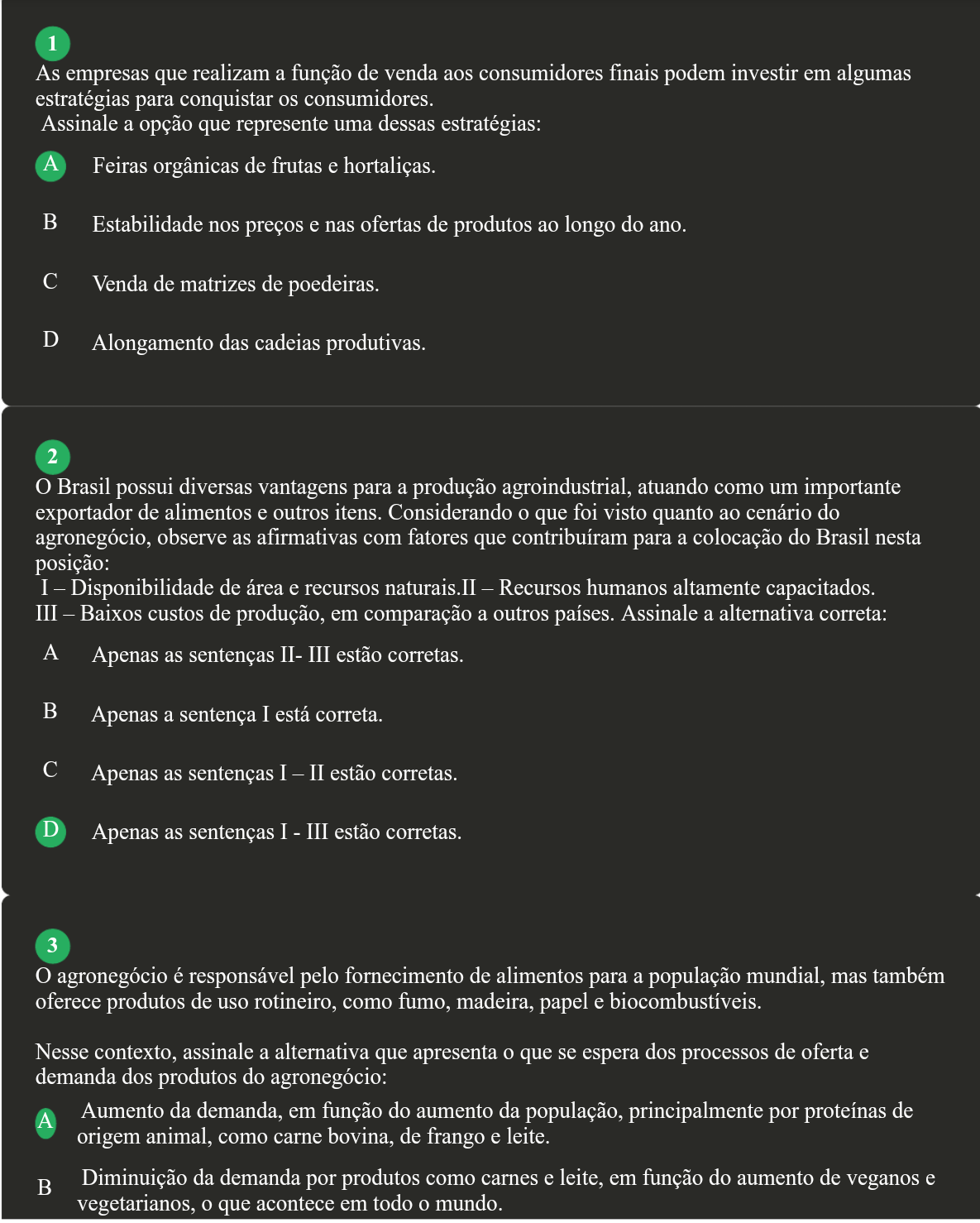 <p>1 As empresas que realizam a função de venda aos consumidores finais podem investir em algumas estratégias para conquistar os consumidores. Assinale a opção que represente uma dessas estratégias: A Feiras orgânicas de frutas e hortaliças. B Estabilidade nos preços e nas ofertas de produtos ao longo do ano. C Venda de matrizes de poedeiras. D Alongamento das cadeias produtivas. 2 O Brasil possui diversas vantagens para a produção agroindustrial, atuando como um importante exportador de alimentos e outros itens. Considerando que foi visto quanto ao cenário do agronegócio, observe as afirmativas com fatores que contribuíram para a colocação do Brasil nesta posição: I - Disponibilidade de área e recursos naturais.II Recursos humanos altamente capacitados. III - Baixos custos de produção, em comparação a outros países. Assinale a alternativa correta: A Apenas as sentenças II- III estão corretas. B Apenas a sentença I está correta. C Apenas as sentenças I II estão corretas. D Apenas as sentenças I - III estão corretas. 3 O agronegócio é responsável pelo fornecimento de alimentos para a população mundial, mas também oferece produtos de uso rotineiro, como fumo, madeira, papel e biocombustíveis. Nesse contexto, assinale a alternativa que apresenta que se espera dos processos de oferta e demanda dos produtos do agronegócio: A Aumento da demanda, em função do aumento da população, principalmente por proteínas de origem animal, como carne bovina, de frango e leite. B Diminuição da demanda por produtos como carnes e leite, em função do aumento de veganos e vegetarianos, que acontece em todo mundo.</p>